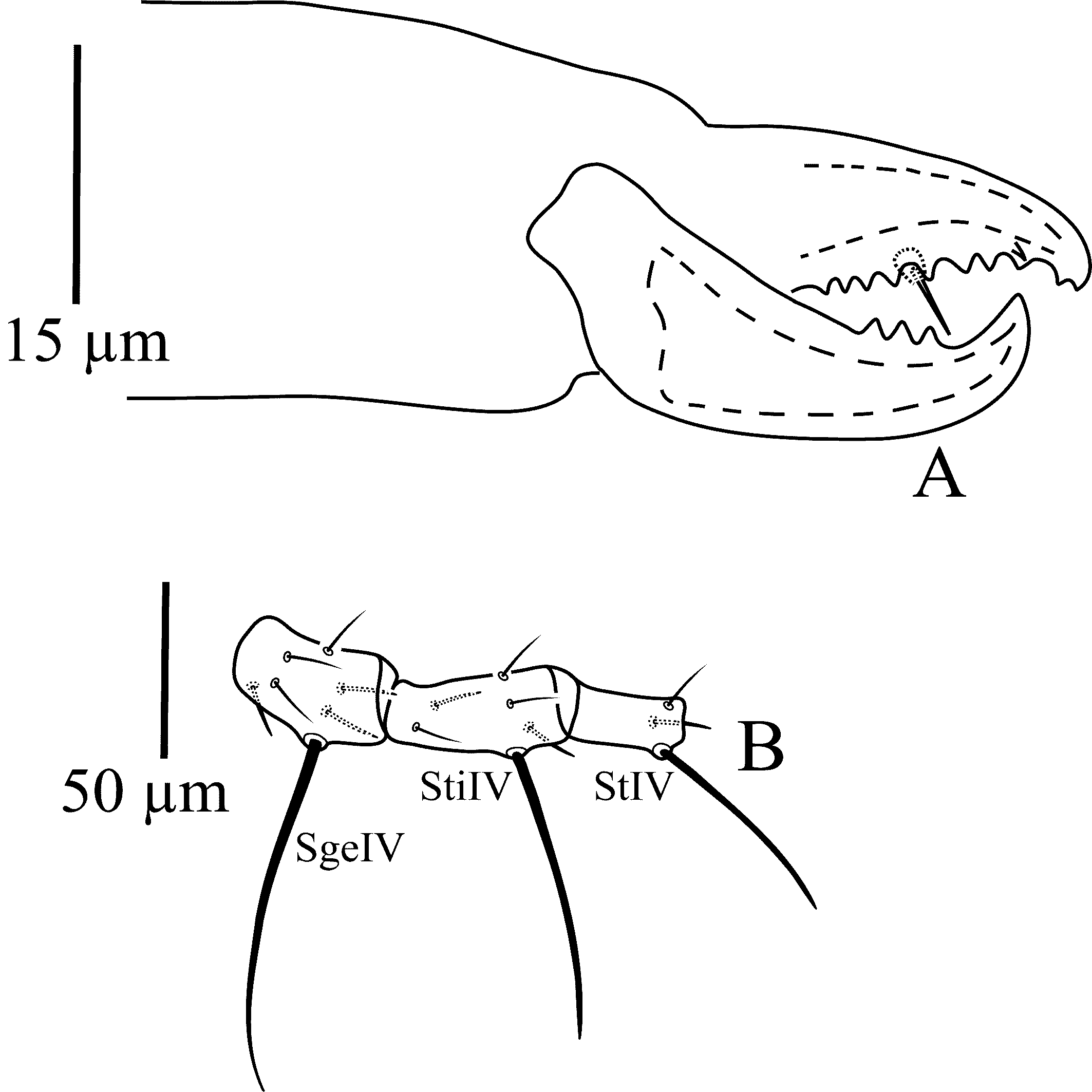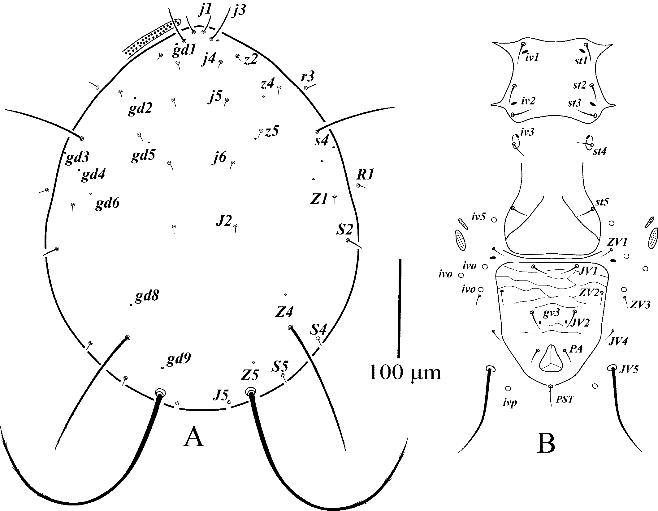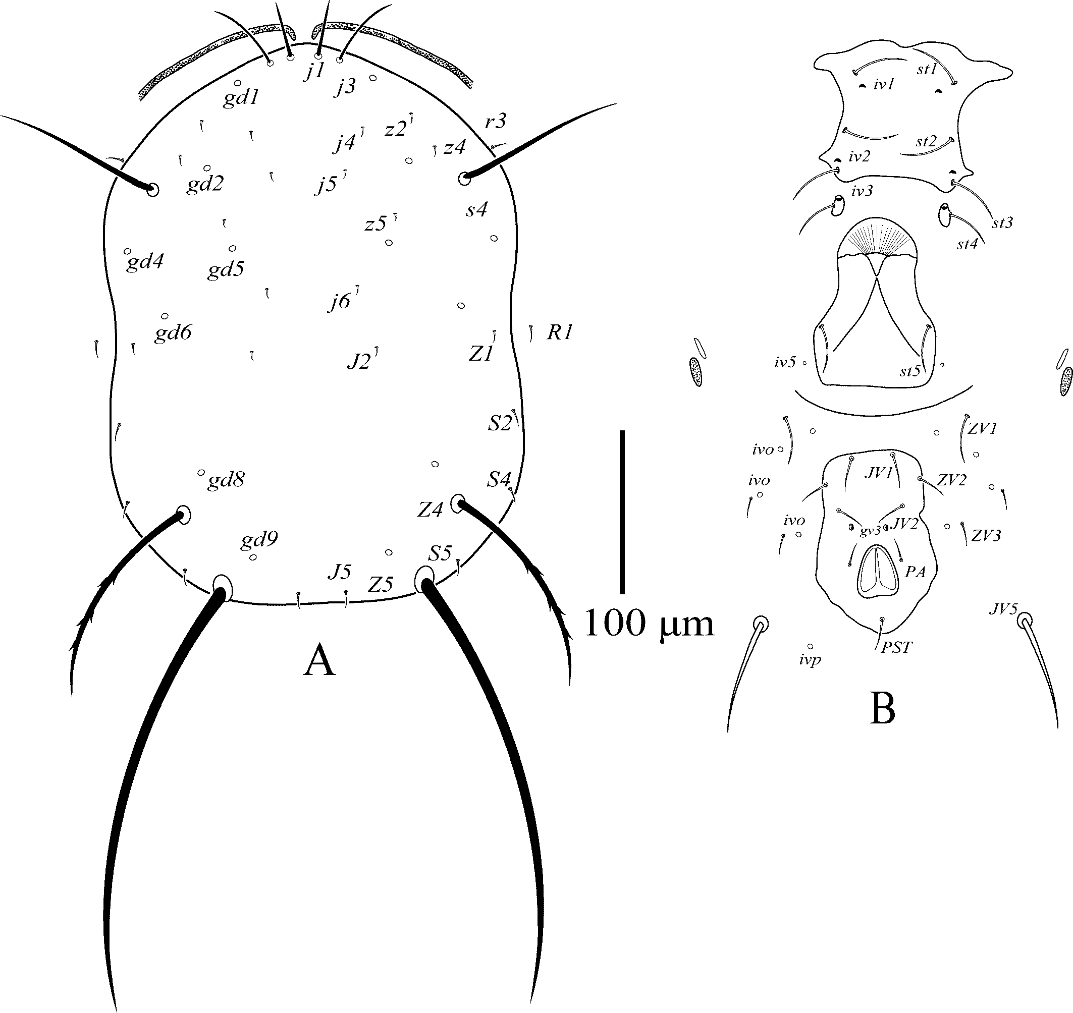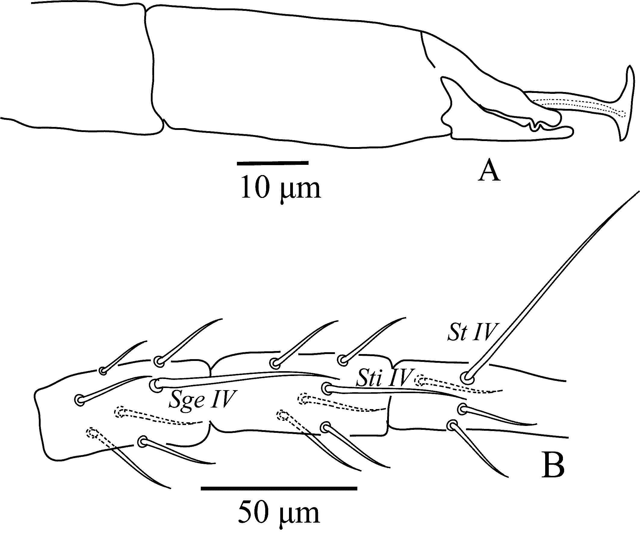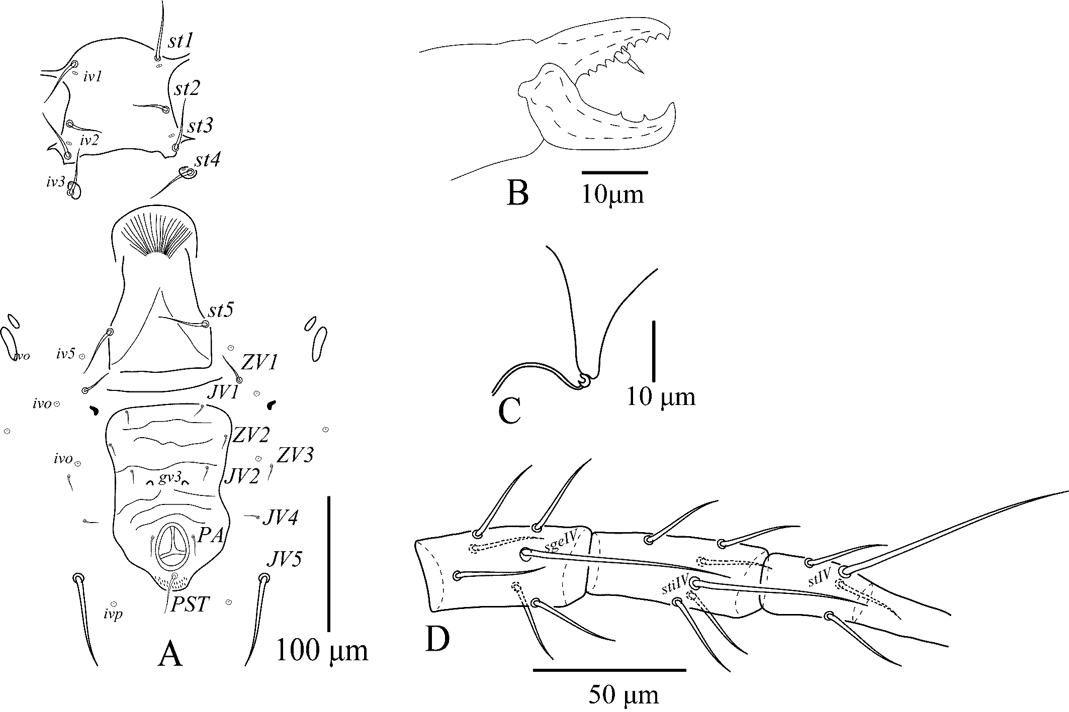 Legs — (Figure 8B). Genua II-IV each with seven setae, macrosetae on genu I 35–38, genu II 39–42, genu III 60–63, and tibia III 44–47; tibia IV with six setae; leg IV with three macrosetae: SgeIV 98–107, StiIV 84–89, StIV 61–66. All macrosetae smooth with pointed tip.