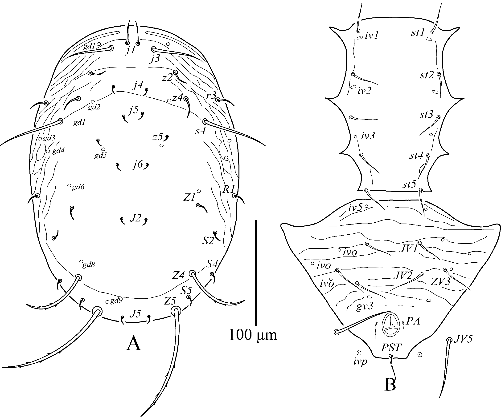 Venter — (Figure 2A). Sternal shield smooth, posteriorly almost flat, with three pairs of setae (st1-st3) and two pairs of poroids (iv1, iv2); distance st1-st3 65–70, st2-st2 70–78, st4 and poroid iv3 tylochorous; genital shield smooth, distance st5–st5 70–75; a transversely elongate platelet between genital and ventrianal shields. Ventrianal shield subpentagonal, slightly constricted at the level of solenostomes, with sparsely striae, about 6–7 transverse lines, 125–135 long, 90–98 wide at ZV2 level, and 85–89 wide at anus level; with three pairs of pre-anal setae (JV1, JV2, and ZV2) along with para-anal and post-anal setae, a pair of solenostomes (gv3), crescentic shape, posteromesad JV2; four pairs of setae (JV4, JV5, ZV1, and ZV3), four pairs of poroids (ivo, ivp), and two pairs of metapodal platelets on the membrane surrounding ventrianal shield, primary metapodal plate 22–24, secondary 9–10 long. Setae ZV1 23–25, ZV3 = JV4 12–13, JV5 70–75, smooth.