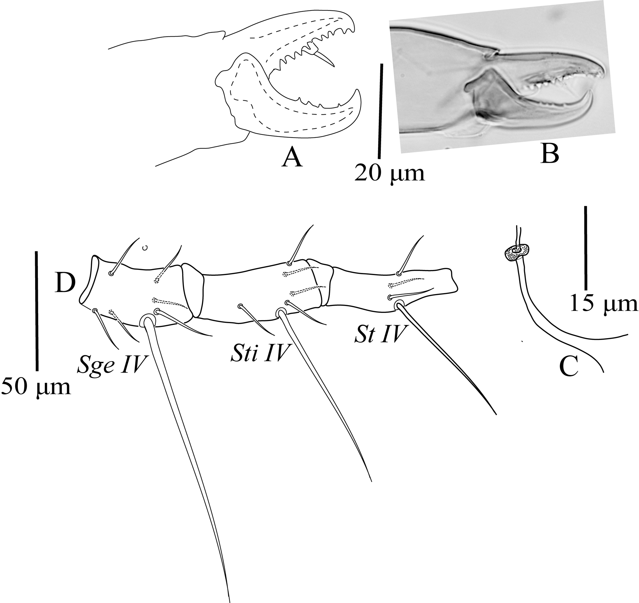 Legs — (Figure 2D). Genu II with eight setae; genua III-IV each with seven setae; genua I-III each with a macroseta: 28–31, 28–30, and 35–39 long, respectively; tibiae IIII without macrosetae; leg IV with three macrosetae: SgeIV 68–77, StiIV 55–65, StIV 76–80, all macrosetae smooth with pointed tip (Figure 2D).