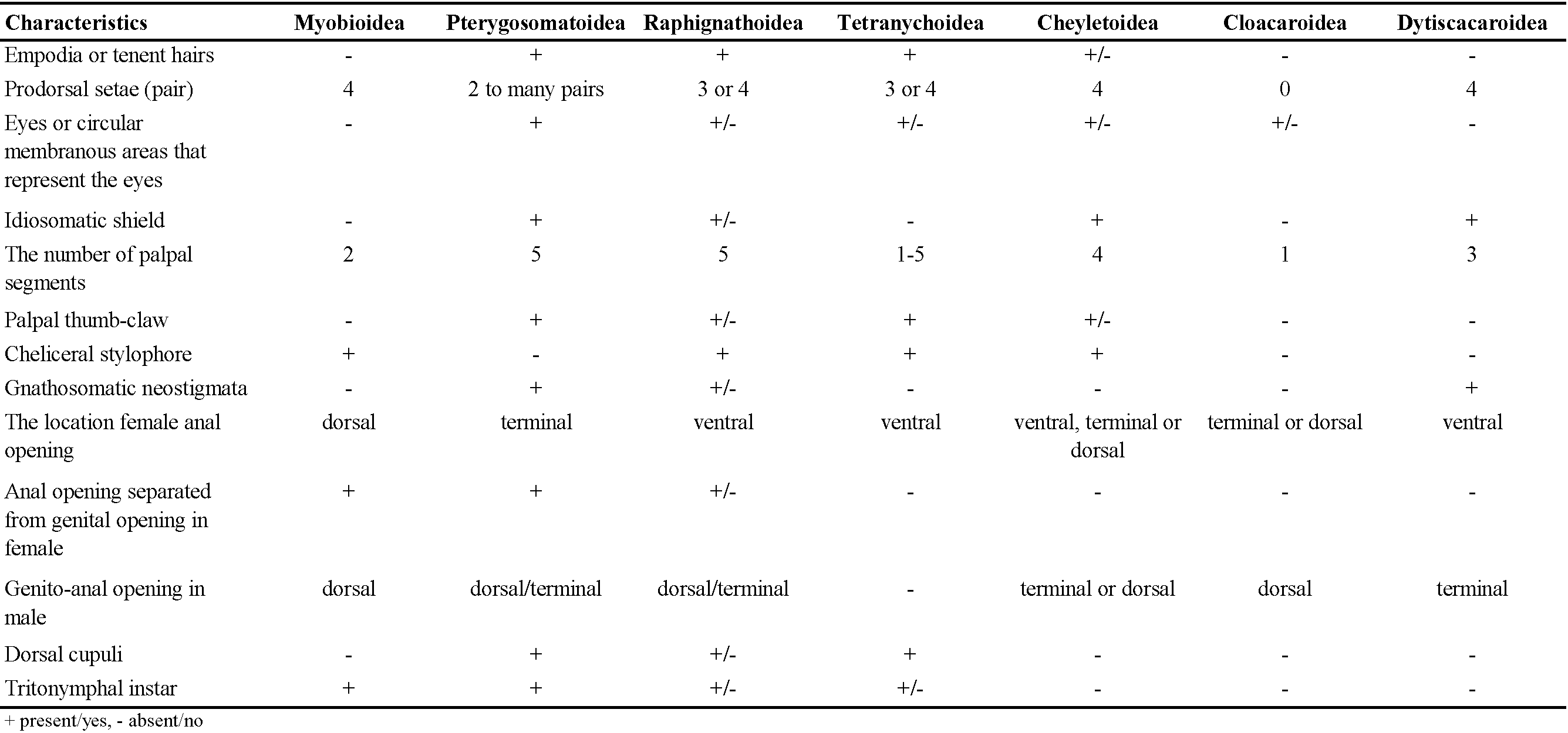 The superfamily Myobioidea are usually ectoparasites on marsupial, rodent, bat, elephant shrew and eulipotyphlan insectivore hosts, with legs I modified as clasping organs. Larva, deutonymph and adult of Pterygosomatoidea are parasites of lizards, tortoises, scorpions, and various insects. Members of the Cloacaroidea are specialised endoparasites of vertebrates (Bochkov and OConnor, 2008). The superfamily Tetranychoidea are obligatory phytophages, often important as plant pests. Species of Cheyletoidea are ectoparasites of birds, mammals, and insects. More often they are free-living predators on other mites, first instar armoured scale insects, and other small insects (Walter et al., 2009).