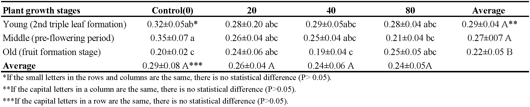 The calcium content in the plant was significantly affected by the plant phenological stages and mite densities (Table 3). The stage of 2nd triple leaf (young stage) contained the lowest calcium level. As can be seen, the plant growth increases, the effect of mites decreased and calcium contents increased. In addition, the increased mite density coincided with a decrease in the calcicum content according to the average of the whole plant stage (Table 3).