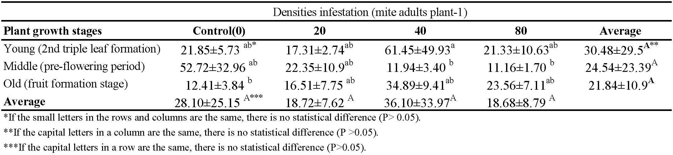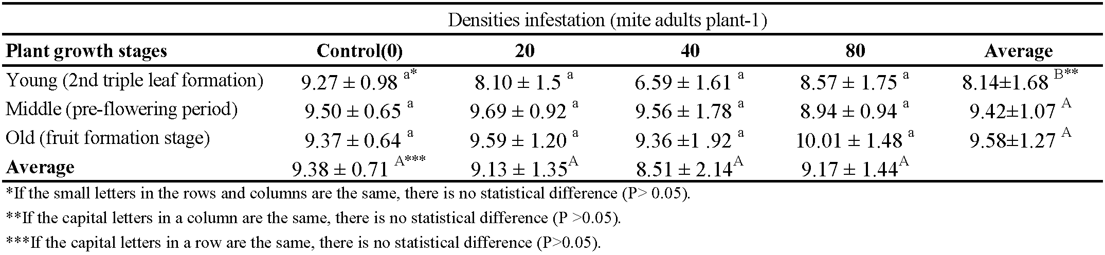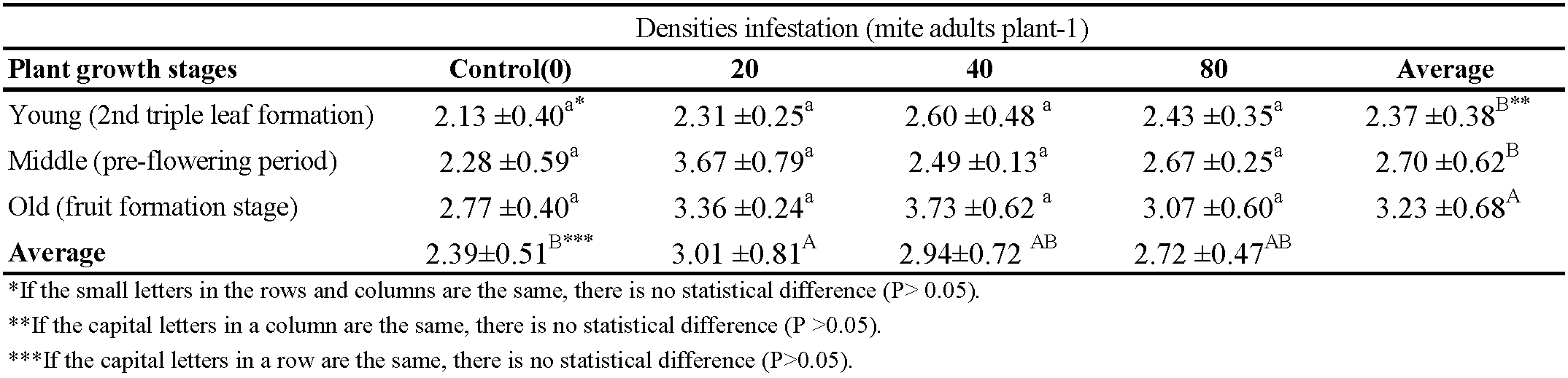 Artificial infestation with T. urticae was performed at rates of 0, 20, 40, 80 adult mite per plant in 3 groups of plants at different growth stages: young (2nd triple leaf formation), middle (pre-flowering period) and old (fruit formation stage).