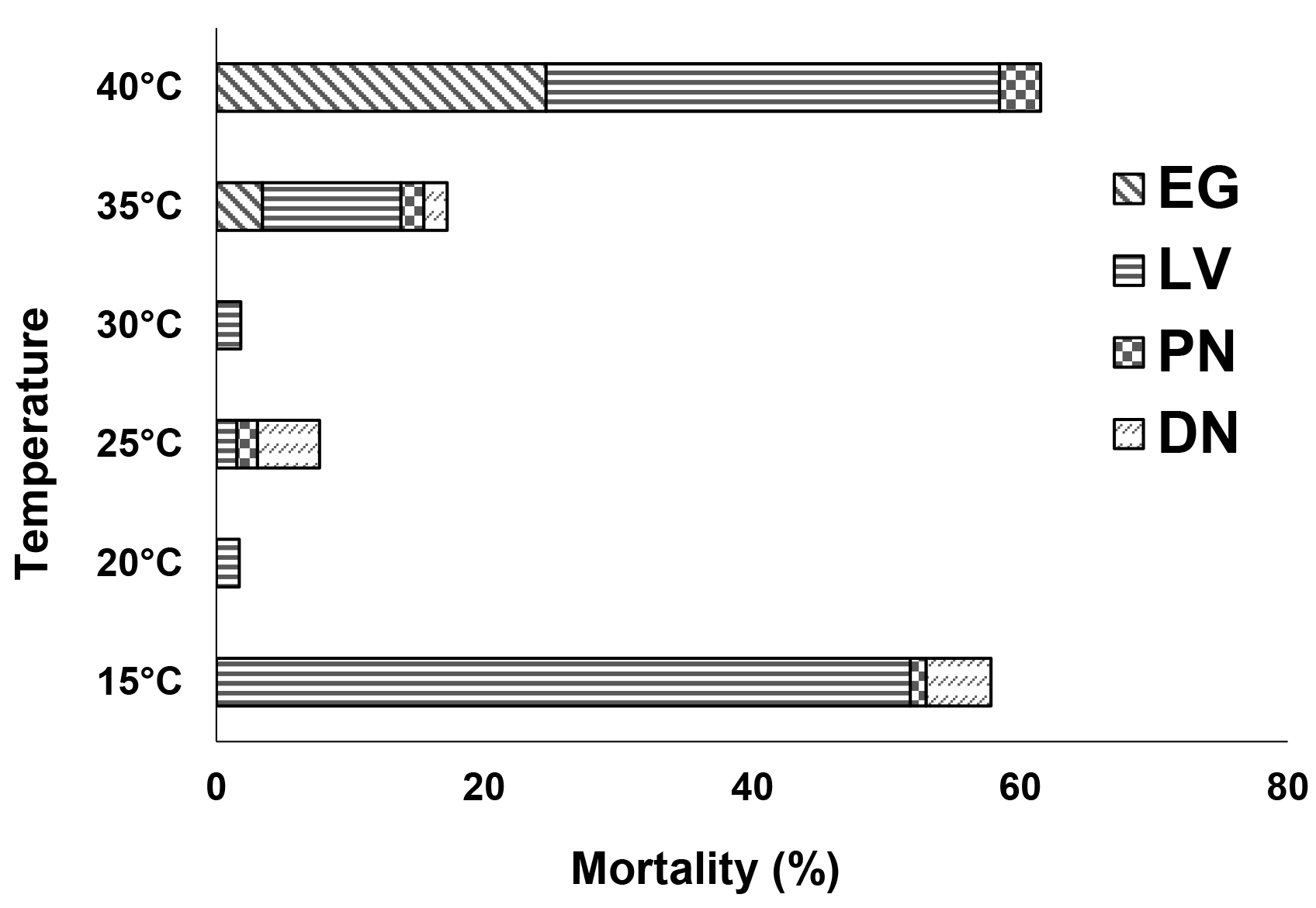 Overall, the mortality rate of the immature stages of E. scutalis was high at 15 °C and decreased as the temperature increased to 30 °C, before rising again above that temperature (Figure 1). The highest temperature (40 °C) resulted in higher mortality than the lowest temperature examined (15 °C). Additionally, mortality rates were reduced in the later immature stages. The larval stage was the most vulnerable to low temperatures, while the egg stage was the most vulnerable to high temperatures (Figure 1). Consequently, most deaths occurred before reaching the deutonymphal stage.