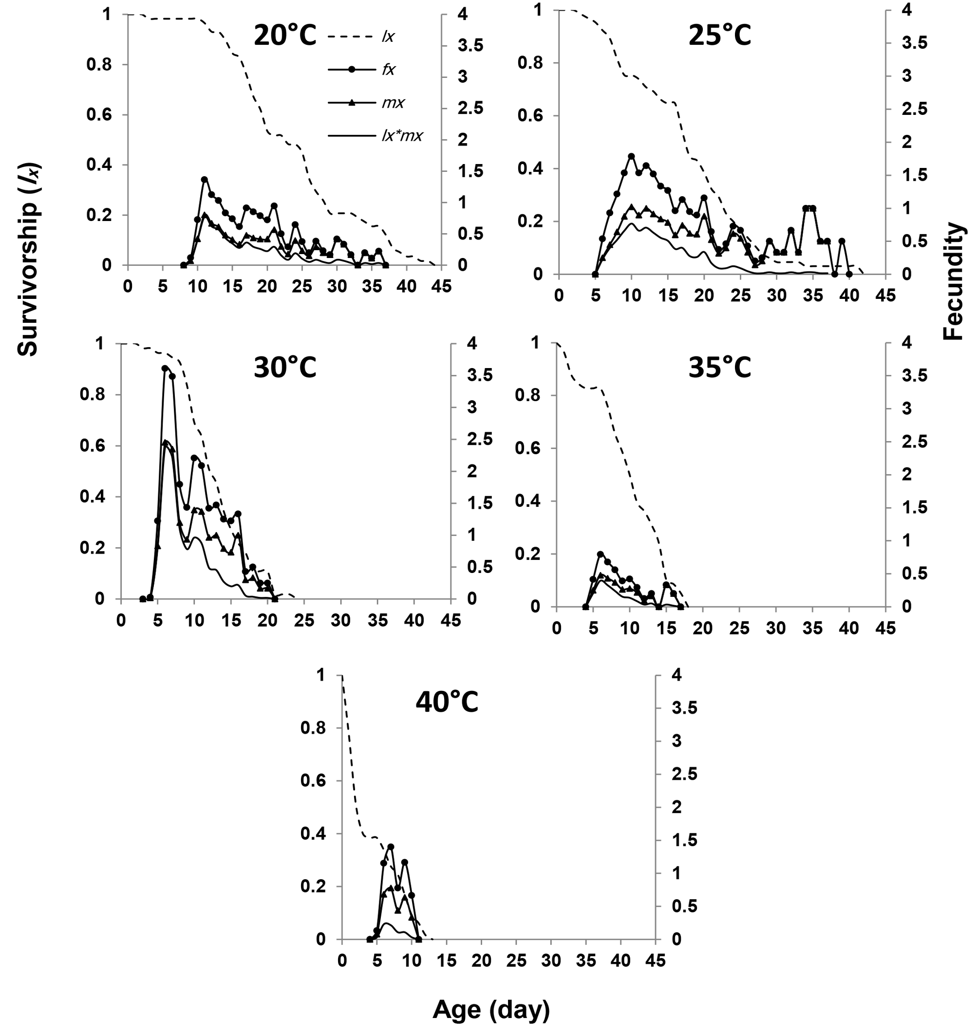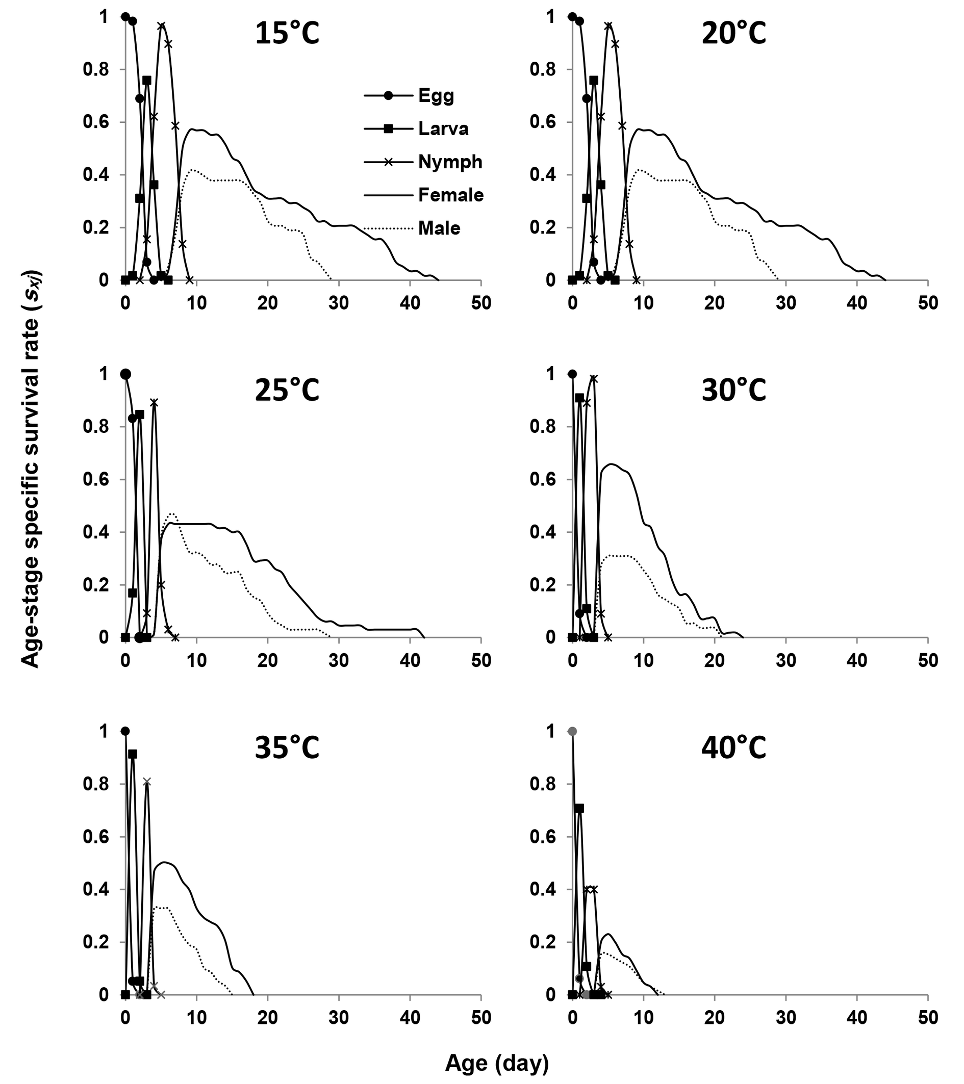 Figure 2 shows the age-stage specific survival rate (sxj ) of E. scutalis on six different temperatures. The overlaps observed among stages in the survival curves are due to the variable developmental rates among individuals. The survival rate at 40 °C was lower than at the other temperatures. The highest survival rates for females were 0.59, 0.58, 0.42, 0.54, 0.58, and 0.21 at 15, 20, 25, 30, 35, and 40 °C, respectively, while the rates for males at the same temperatures were 0.40, 0.41, 0.45, 0.29, 0.31, and 0.15, respectively (Figure 2).
