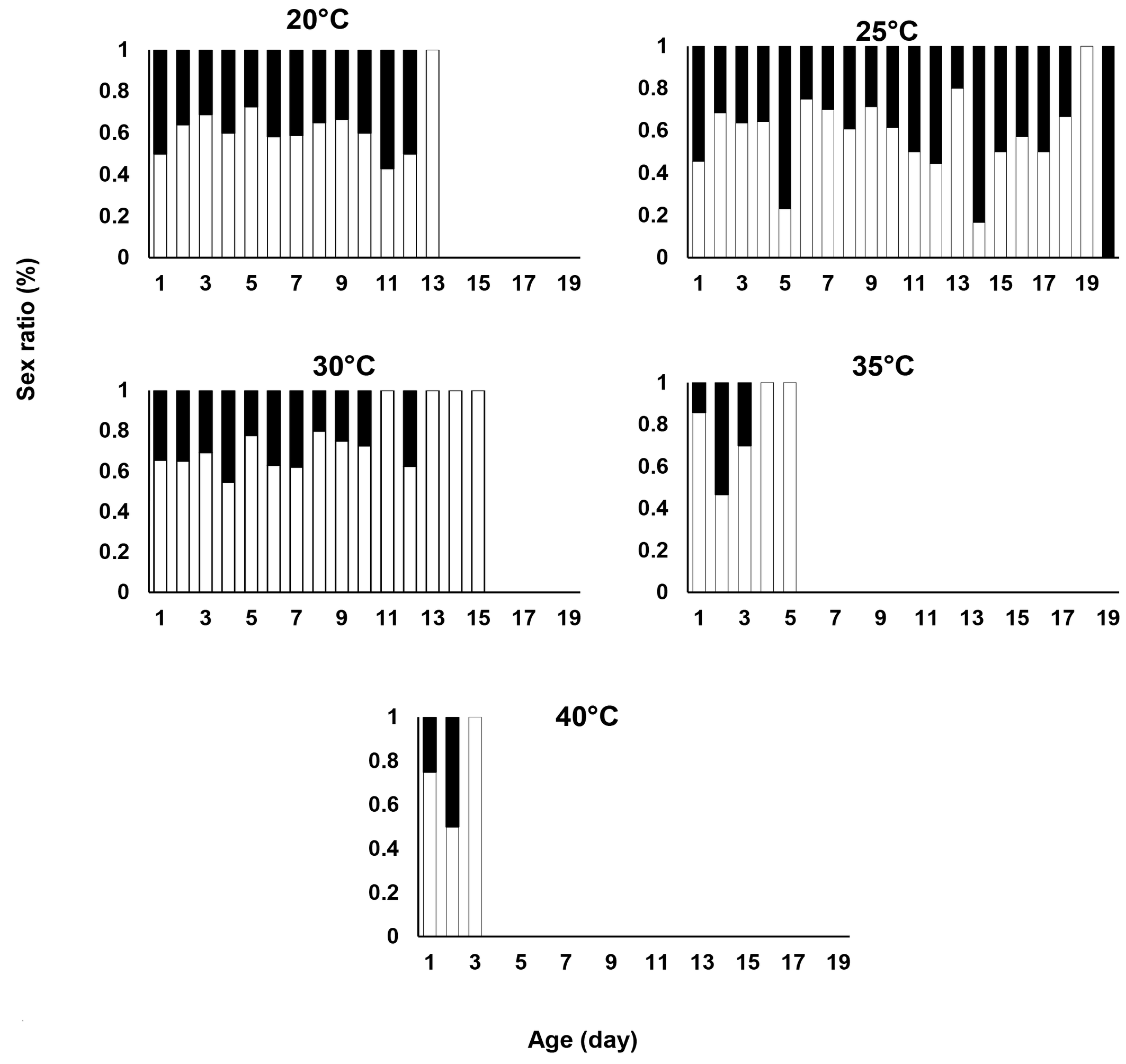 Temperature had a significant effect on the sex ratio (percentage of females) of E. scutalis progeny among the tested temperatures (Table 3). The percentage of females increased as the temperature increased from 25 to 30 °C, peaking at 67%, and before decreasing at higher temperatures (Table 3).