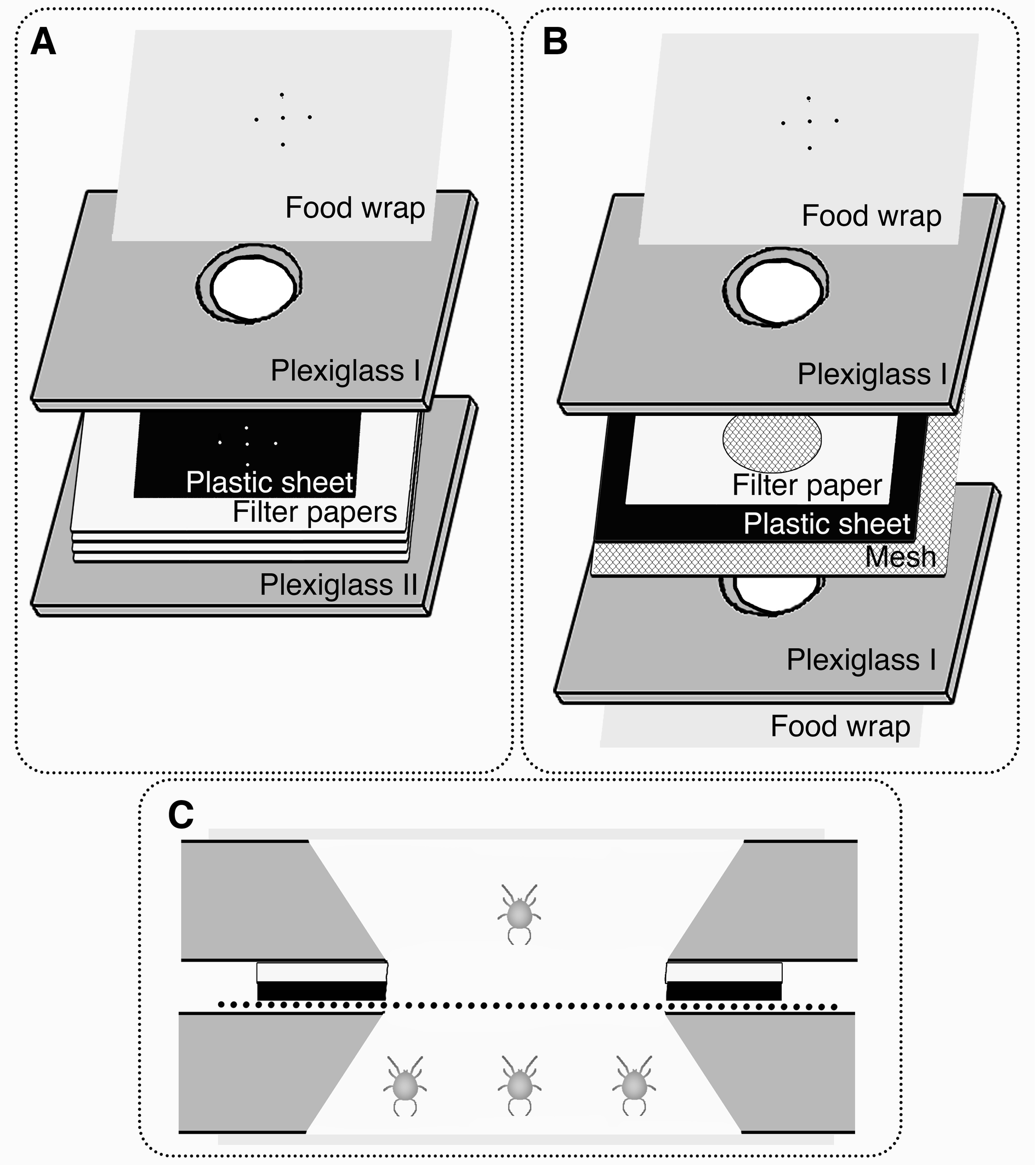 For experiments without conspecifics, the aperture in Plexiglass slide I was covered with a food wrap layer to allow air exchange (Figure 1A). Small holes were made in the wrap using a size 0 insect pin. A 10 mm square black plastic sheet with similar pin holes covered the base of the conical space to provide water access, while water-saturated filter paper beneath the plastic sheet ensured a continuous water supply. Plexiglass slide II sealed the cell, with two metal clips holding the assembly together.