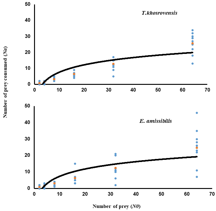 The maximum handling time, which shows the time required for capturing and feeding on prey was estimated as 2.30 (h), and 2.80 (h) for T. khosrovensis and E. amissibilis, respectively, for 24 h. Based on the attack rate, and handling time, both phytoseiids in this study performed lower ability compared to the other native phytoseiid mite T. bagdasarjani when preyed on eggs of T. urticae (a = 0.089 h-1 and Th=1.80), although T. bagdasarjani was still a weaker predator in comparison to Neoseiulus californicus (a=0.09 h-1 and Th=1.61) (Farazmand et al. 2012). In addition, the ability of T. khosrovensis and E. amissibilis to catch the spider mites' eggs was estimated lower in comparison to P. plumifer (Kouhjani Gorji et al. 2009), and E. hibisci in the study conducted by Badii et al (2004).