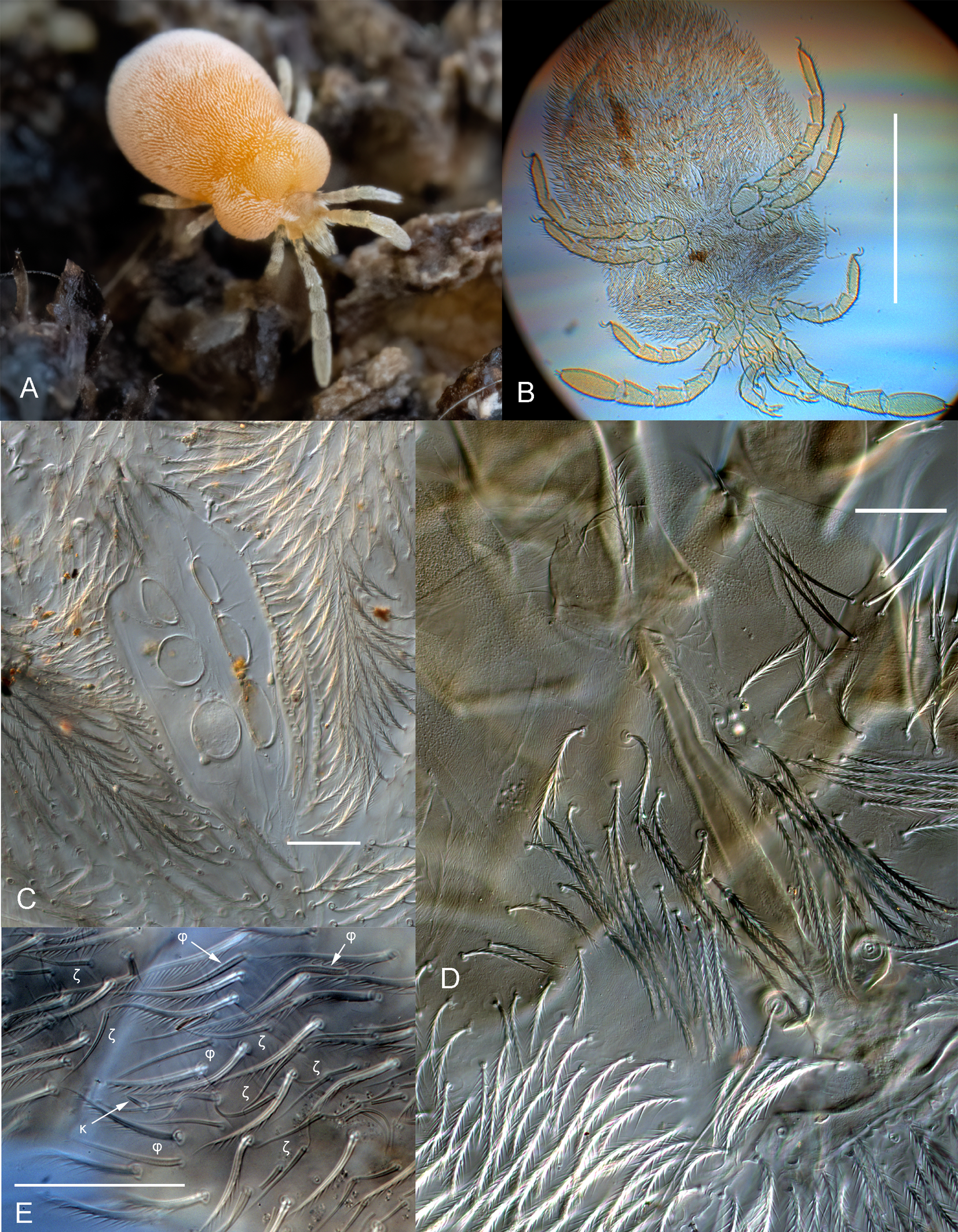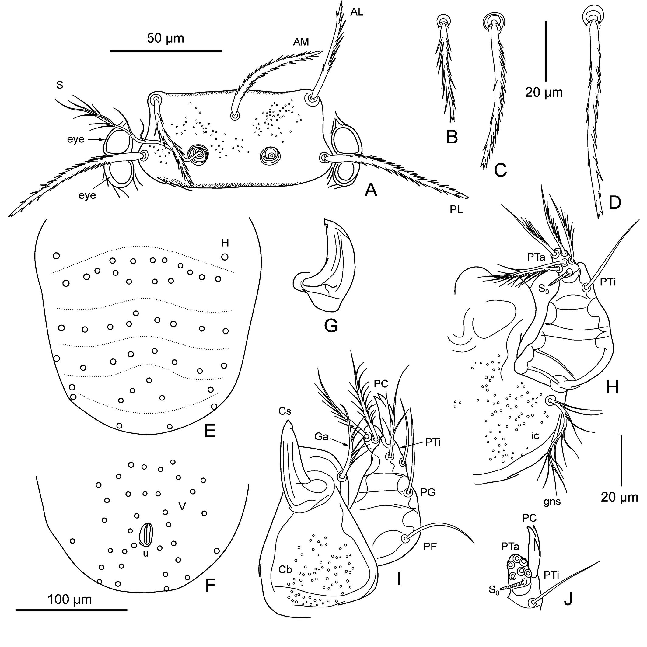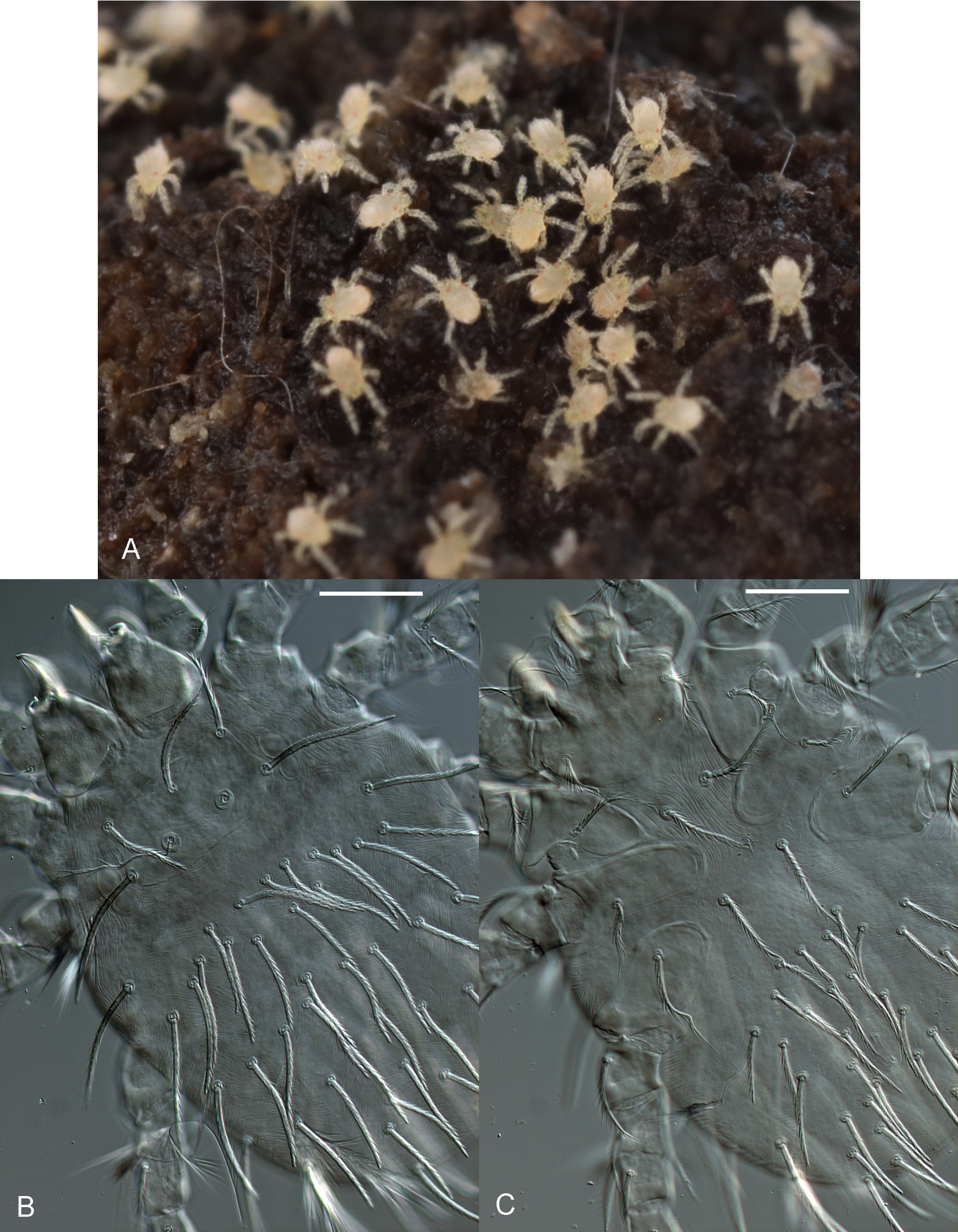 Twelve slides were examined and then deposited in the Laboratory of Parasitic Arthropods, Zoological Institute of the Russian Academy of Sciences (ZIN, St Petersburg, Russia). Their collection numbers are ZIN 18585 – 18588 (larvae obtained from the gravid female in the laboratory), ZIN 18589 (mother of these larvae), ZIN 18590 – 18593 (other adult females), and ZIN 18594 – 18596 (larvae collected in nature). The slides were examined under a Leica DM 2500 compound microscope (Leica Microsystems GmbH, Wetzlar, Germany) using differential interference contrast (DIC). Microphotographs were taken using a Leica DMC 4500 digital camera. Morphological drawings were prepared using a drawing tube. Measurements of adult mites were made on the microphotographs using the means of Adobe Photoshop CC 2014 software (Adobe Inc., San Jose, CA, US), with a prior calibration by a stage micrometer. Measurements and drawings of larvae (except drawings of legs) were prepared under a MBI-3 microscope (LOMO plc, St Petersburg, Russia) with phase contrast optics, a drawing tube, and an ocular micrometer. Count of setae on palps and legs of adult specimens was made by a preparation of schematic drawings of their segments (not published). In total, seven larvae and three adult females were examined entirely. Measurements and counts of setae were not done for two females because of the insufficient quality of the slides.