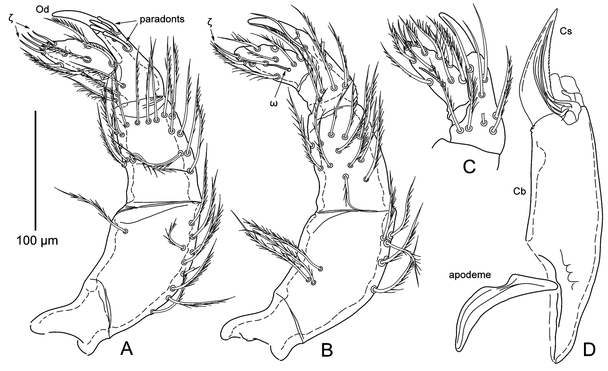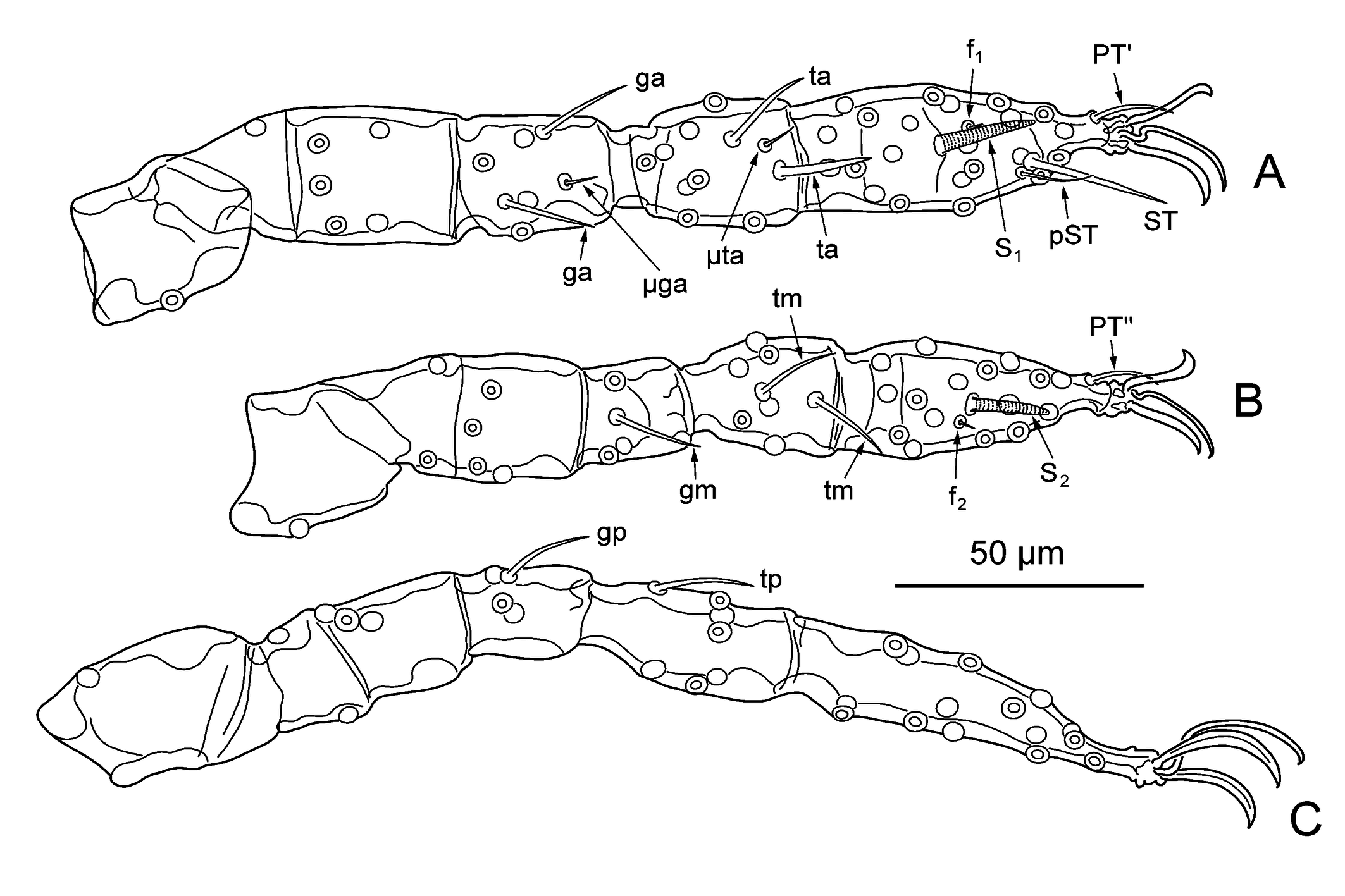 The specialized setae on leg tarsi of examined adult specimens are definitely divided into two main types: (1) thick, rod-like (not pointed at their end), with visible sculpture on their surface; (2) thin, smooth, pointed at their end. Following Moniuszko et al. (2017), we designated setae of the first type as tarsal solenidia (ω) and setae of the second type as eupathidia (ζ). We also recorded setae of both these types on tibiae I and II and on genu I. We designated setae of the first type as tibial or genual solenidia (φ or σ), respectively, and setae of the second type as eupathidia (ζ). Moniuszko et al. (2017) recorded both φ and ζ on tibiae II – IV, but only σ on genua I – IV (Table 3). We also found one microchaeta on tarsus II and one on tibia I; we designated them as ε and κ, respectively, like the famuli on tarsi I and II and the microchaeta on tibia I in larval trombiculids.