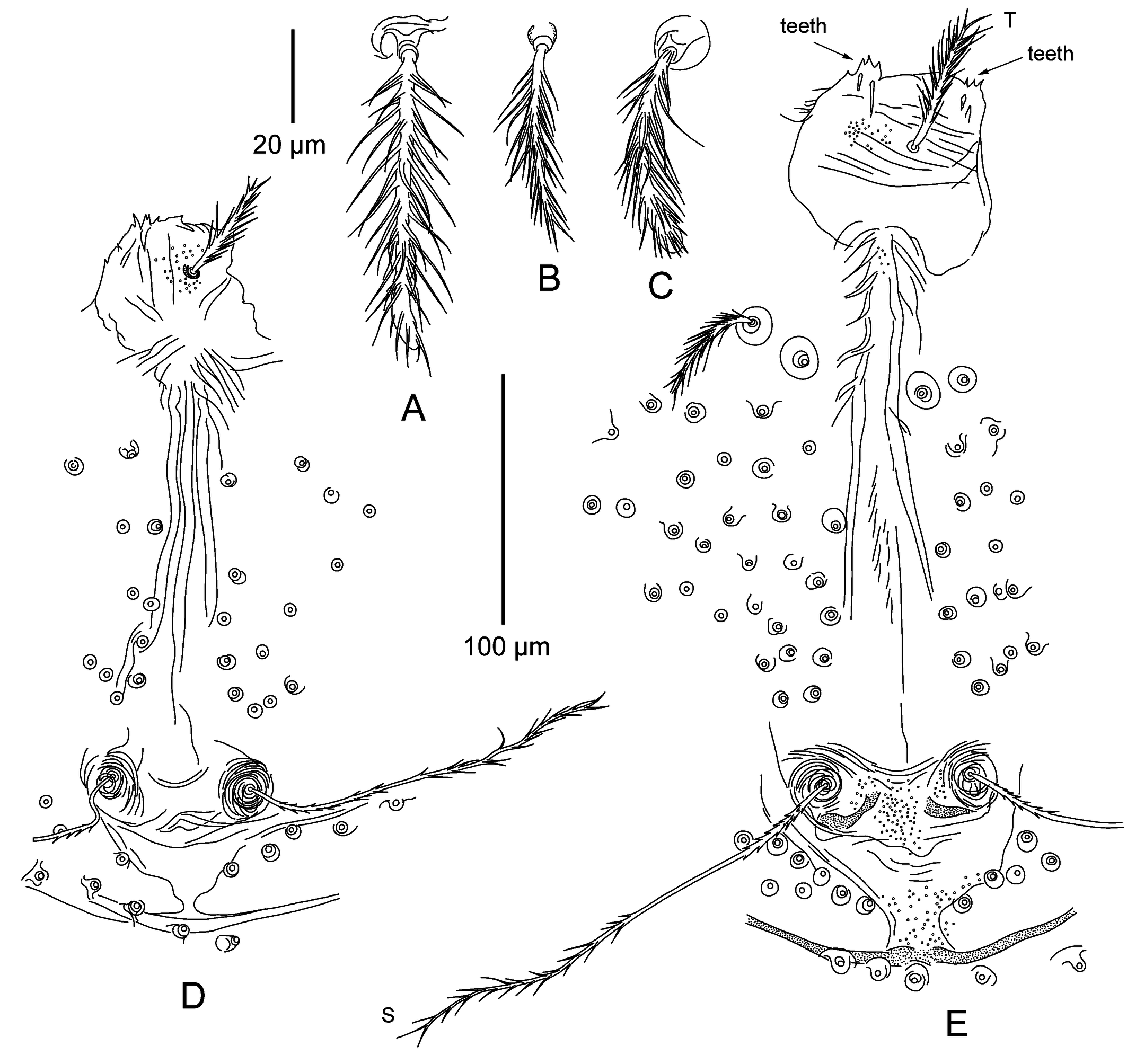 Published diagnoses of adult trombiculids are rare, and only a small part of them include detailed descriptions. As a result, distinguishing between intraspecific variation and differences at the species or even genus level can be almost impossible. Further accumulation of descriptions is necessary to develop a taxonomy of Trombiculidae at the adult stage. In our case, only one female (ZIN 18589) can be indubitably identified as L. miniopteri, based on examination of its larval offspring. Collection of other adults at the same place does not prove their conspecificity because the cases of joint occurrence of different chigger species on one bat host (Stekolnikov et al. 2022) suggests that several trombiculid species can inhabit the same cave. Among three examined adult females, ZIN 18589 is the smallest and ZIN 18591 is the largest specimen (Table 2). The difference in size correlates with the number of unspecialized setae on palps and specialized setae on legs (Table 3). Therefore, these differences of setation can be estimated as a size-dependent intraspecific variation, until proven otherwise. Sensilla of the specimen ZIN 18591 differ from those of the specimen ZIN 18589 by the presence of a middle part lacking of branches (Figure 6).