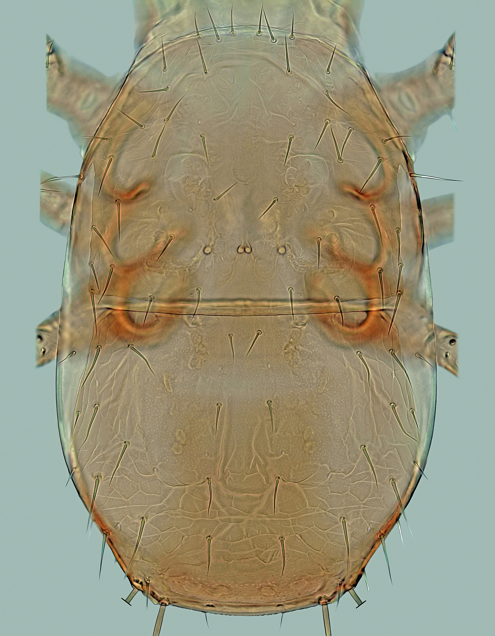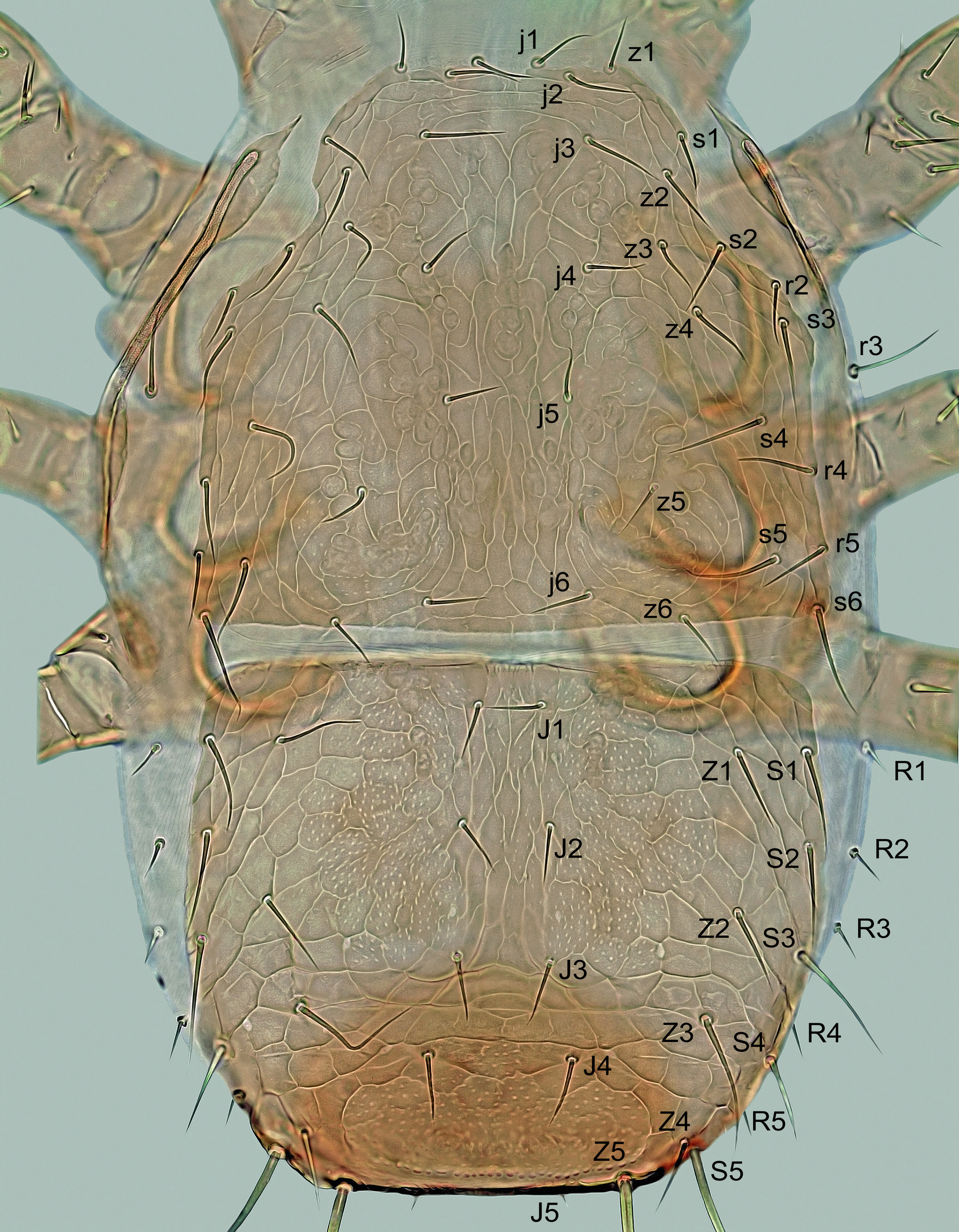 Dorsal idiosoma – (Figure 8). Idiosoma 390–470 μm long, 205–305 μm wide, elongate, suboval, covered by two dorsal shields and with the same number of setae as in adults. Podonotal shield 210–250 μm long, 200‒250 μm wide, subpentagonal, convex anteriorly, concave anterolaterally between setae s1 and s3, more or less straight posterolaterally and posteriorly, without distinct medial scleronodules between setae j5 and j6 and with 21 pairs of setae (r3 located on soft integument outside shield). Opisthonotal shield 175–225 μm long, 190‒255 μm wide, subquadrate, with straight to moderately convex anterior and lateral margins, truncated posterior margin between setae Z5 and similar setation as in female, except for presence of four pairs of marginal setae (R2‒R5 on soft integument adjacent to lateral margins of shield). Surface of both dorsal shields completely reticulate, some reticulate cells strongly punctate, especially in areas around setae z5 of podonotum and in large anteromedial and small posteromedial parts of opisthonotum (this punctation sometimes strongly reduced). Dorsal setae as in female. Soft integument densely striated. Lengths of selected dorsal setae as follows: j1 23–27 μm, j2 28–32 μm, j3 32–36 μm, j4, j6 and z5 24–28 μm, j5 and z1 22–26 μm, s5 37–42 μm, s6 44–49 μm, r3 35–41 μm, r5 27–32 μm, J1 and J2 22–27 μm, J3 25–30 μm, J4 27–32 μm, J5 8–12 μm, Z1 and Z2 33–39 μm, Z3 60–66 μm, Z4 29–36 μm, Z5 150–170 μm, S1 37–44 μm, S2 40–47 μm, S3 52–60 μm, S4 34–42 μm, S5 145–160 μm, R1–R4 14–19 μm, R5 26–32 μm.