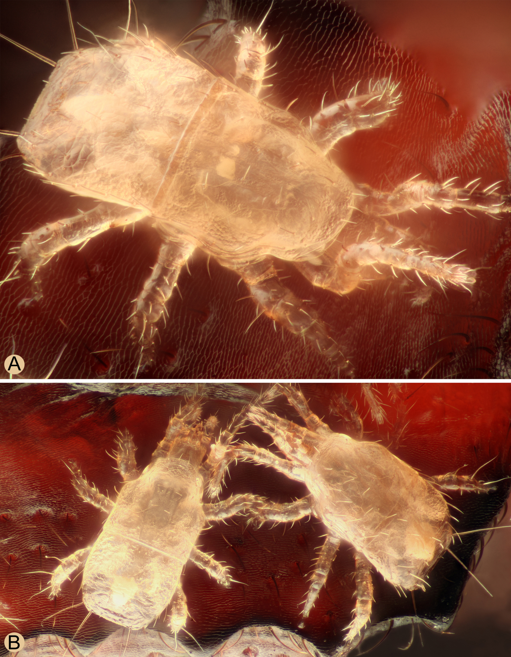 It can be assumed that the distribution area of Insectolaelaps zvoleniensis could be very similar to that of its phoretic host Cucujus cinnaberinus. This beetle is an attractive species for photographers due to its size, bright coloration and extremely flat body. Therefore, numerous photos of this species can be found on the internet, including photos with phoretic digamasellid mites (probably I. zvoleniensis) taken in different parts of Europe, e.g. in the Austria (Graz Region, Vienna Region), Belarus (Belovezhskaya Pushcha National Park), Czech Republic (Prague Region), Germany (Berlin Region), Hungary (Heves County), Lithuania (Kaunas Region), Poland (Podlaskie Voivodeship), Russia (Moskovskaya Oblast, Nizhegorodskaya Oblast, Republic of Karelia) and Ukraine (Donetsk Oblast, Kharkiv Oblast, Kyiv Oblast). The deutonymphs on the host beetle from Hungary were photographed in such high resolution and quality that they can be identified with certainty as I. zvoleniensis (Figures 9 and 10).