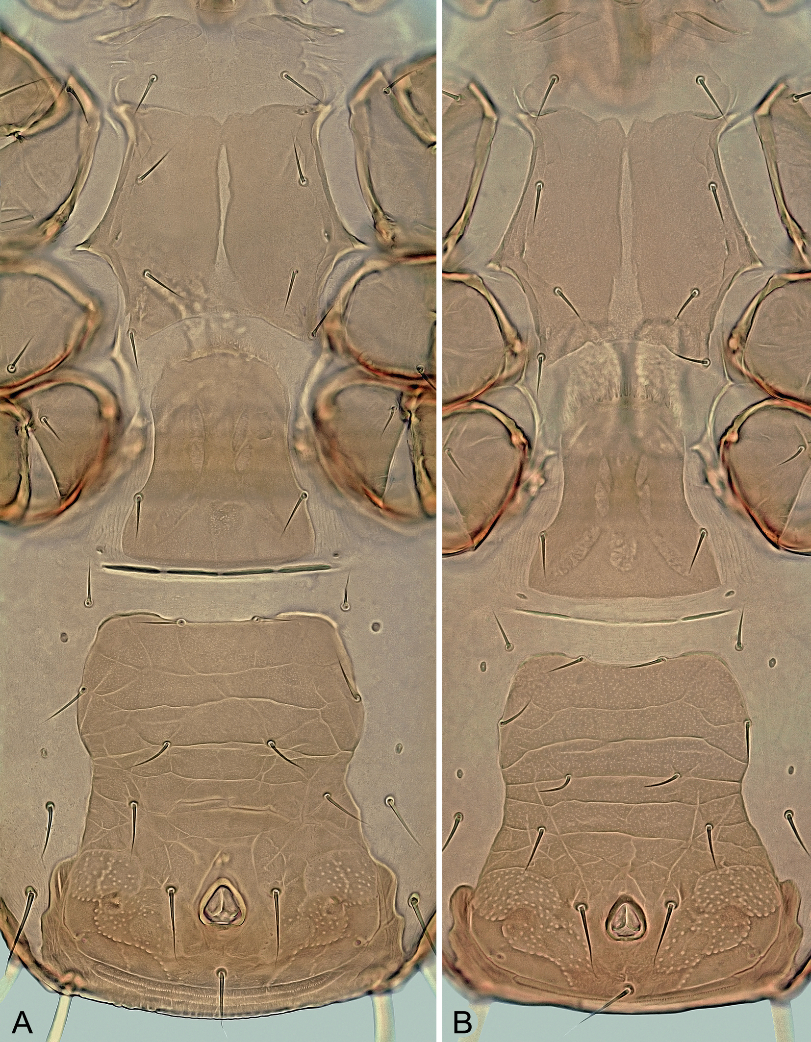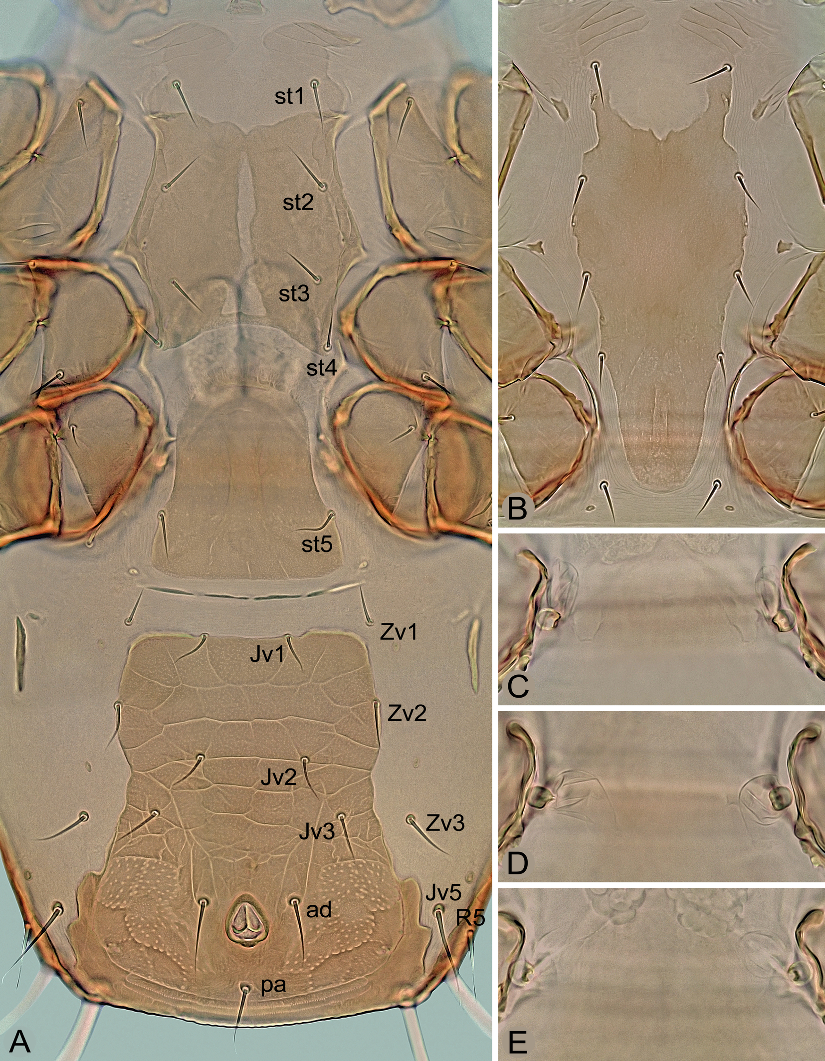Ventral idiosoma – (Figures 3B and 7D). Presternal plates weakly sclerotized, diagonally or transversely striated and completely connected to anterior margin of sternal shield (Figure 3B). Sternal shield 185–220 μm long (measured from level of st1), 72–86 μm wide (at widest part of iv2), wedge-shaped, weakly sclerotized in anteriormost part with st1, usually smooth over entire surface (sometimes with sparse dots), with anterolateral margins between iv2 and st2 deeply concave, and four pairs of setae on lateral margins; sternal setae st5 on soft integument adjacent to posterior margin of shield (Figure 3B). Seven pairs of opisthogastric setae (Jv1‒Jv3, Jv5, Zv1‒Zv3), all on soft integument (Figure 7D). Anal shield distinctly wider than long, 75–95 μm long, 135–160 μm wide, as in Figure 7D, rounded anteriorly, undulating laterally, straight to slightly convex posteriorly, densely and distinctly punctate except for anteromedial surface and area posterior to postanal seta; cribrum with a slightly curved row of denticles posterior to postanal seta. A pair of irregularly suboval or subcircular metapodal platelets, sometimes accompanied by a pair of slit-shaped sclerites near their inner margin. Peritreme long, with only narrow fragments of peritrematal shield in anterior and submedial parts; anterior tip free of podonotal shield and reaching close to setae s1. Subtriangular exopodal platelets II/III and III/IV connected by thin filamentous parts of their ends. Lengths of ventrally located setae as follows: st1–st3 18–24 μm, st4 and st5 15–22 μm, ad 32–40 μm, pa 31–37 μm, Jv1–Jv3 and Zv2 20–25 μm, Jv5 42–49 μm, Zv1 17–21 μm, and Zv3 24–30 μm.