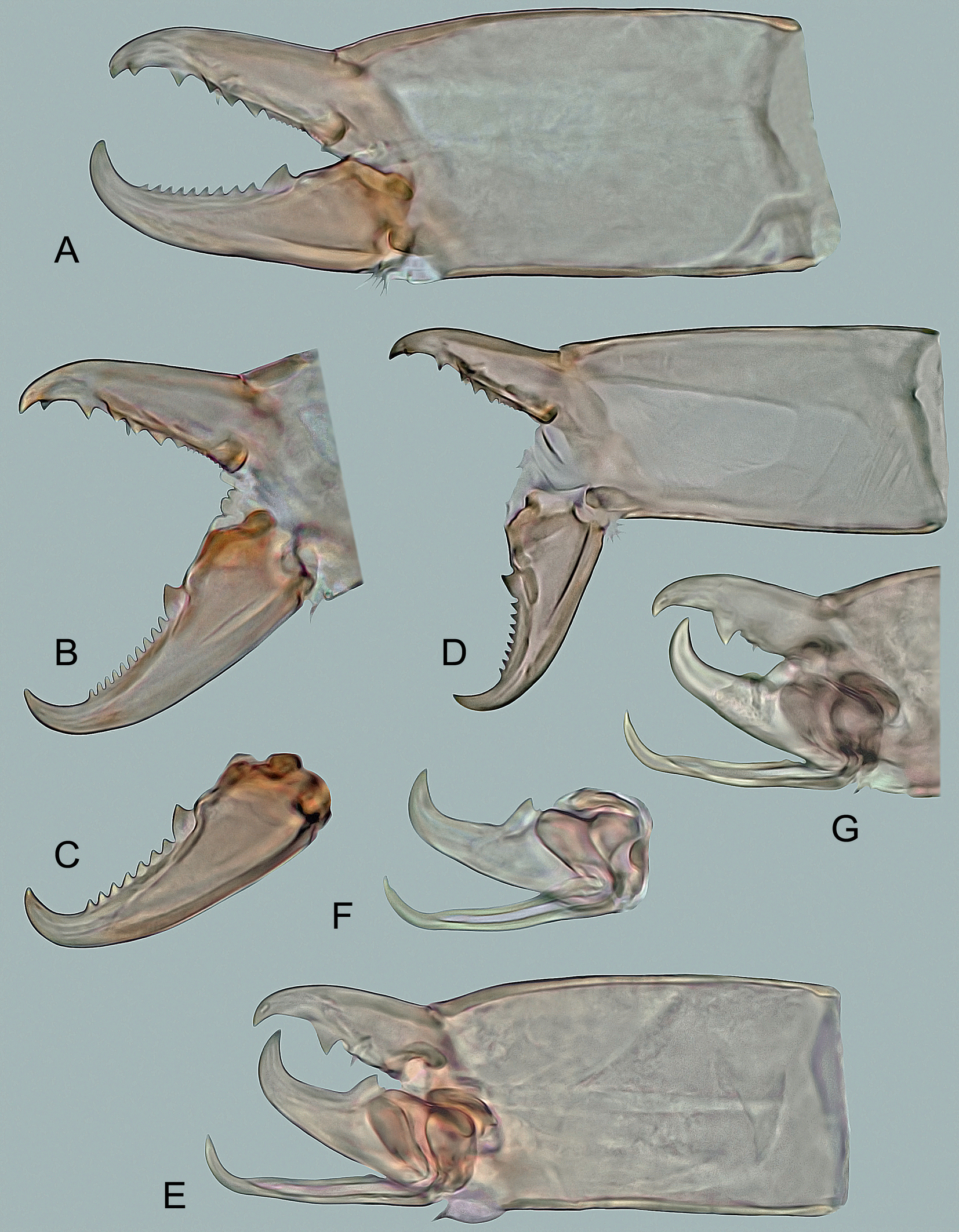 Gnathosoma – (Figures 5D, 6E and 6F). Ventral gnathosoma similar to that of female. Middle article of chelicerae 104–115 μm long; movable digit 40–50 μm, usually with eight or nine teeth, but often also with seven and rarely six teeth; fixed digit with similar dentition as in female, except for number of only five or six minute proximal teeth in lateral row (Figure 5D). Anterior margin of epistome as in Figures 6E and 6F, similar to that of female.