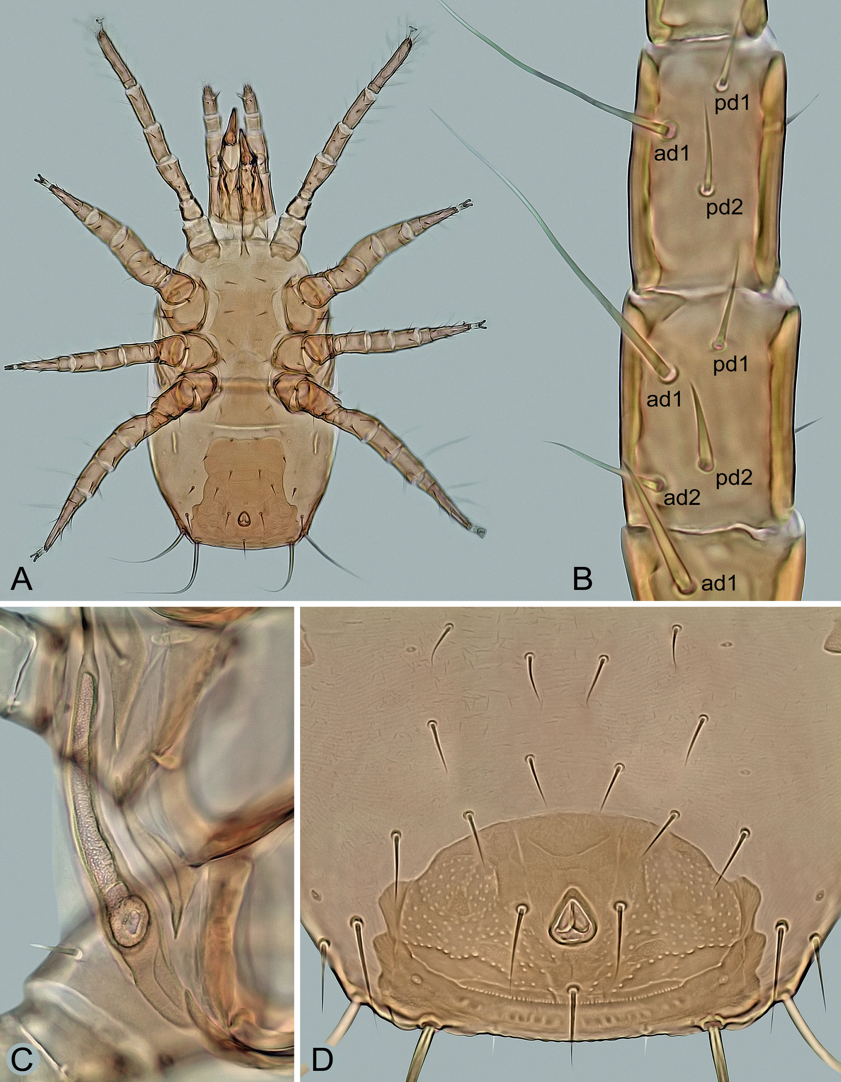 Legs – (Figures 4D, 7A and 7B). All legs shorter than idiosoma, with well-developed pretarsus and ambulacral apparatus including pulvillus and two claws; pulvillus and claws of legs I smaller than those of other legs; legs I longer than legs IV (Figure 7A); dorsal surface of coxae I with two longitudinal clefts forming a subtriangular platelet surrounded by a soft cuticle (Figure 4D), the platelet with a row of several denticles on anterior margin; anterior margin of coxae II with a sharp spine as in Figure 4C; legs I 370–460 μm, legs II 285–370 μm, legs III 275–355 μm, legs IV 350–440 μm long. Chaetotaxy of the legs: leg I – coxa (2), trochanter 1-1/3-1 (6), femur 2-3/1, 2/3-2 (13), genu 2-3/2, 2/1-2 (12), tibia 2-3/2, 2/1-2 (12); leg II – coxa (2), trochanter 1-0/3-1 (5), femur 2-3/1, 2/2-1 (11), genu 2-3/1, 2/1-2 (11), tibia 2-2/1, 2/1-2 (10); leg III – coxa (2), trochanter 1-1/3-0 (5), femur 1-2/1, 1/0-1 (6), genu 2-2/1, 2/0-1 (8), tibia 2-1/1, 2/1-1 (8); leg IV – coxa (1), trochanter 1-1/3-0 (5), femur 1-2/1, 1/0-1 (6), genu 1-2/1, 2/0-1 (7), tibia 1-1/1, 2/1-1 (7); tarsi II–IV with 18 setae; genu III with eight setae (pv1 absent). Leg setae smooth and thin, mostly needle-like, except for slightly thickened dorsal setae ad1 and ad2 on femora IV, conspicuously shortened and thickened apicoventral setae (av1, pv1) on tarsi II‒IV and elongated, distally attenuated and more or less erect whip-like dorsal setae ad1 on genua III and IV, ad1 on tibia IV (Figure 7B), and ad2 on tarsi II‒IV; ad1 on genu IV 75–87 μm long and ad1 on tibia IV 82–94 μm long.