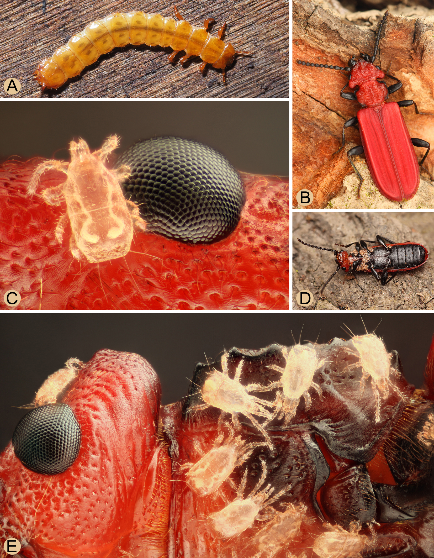 I examined eight adult beetles of Cucujus cinnaberinus with the deutonymphs of Insectolaelaps zvoleniensis. The number of deutonymphs varied between three and 118 individuals, which were mostly attached to the ventral side of the body, mainly on the thorax, and to the inner side of the elytra. It should be mentioned that I. zvolenensis was occasionally found under bark, where no larval galleries of cucujids or other xylophagous beetles were detected. Interestingly, no phoretically active deutonymphs of I. zvoleniensis were found on other xylobiont beetles with similar bionomy, namely the pyrochroid beetles Pyrochroa coccinea (Linnaeus) or Schizotus pectinicornis (Linnaeus), both of which have a softer and less chitinized integument and elytra and whose morphologically very similar xylophagous larvae often co-occur with those of C. cinnaberinus and could possibly serve as a potential secondary host. I was also unable to detect phoresy of I. zvoleniensis in other saproxylic beetle or arthropod species.