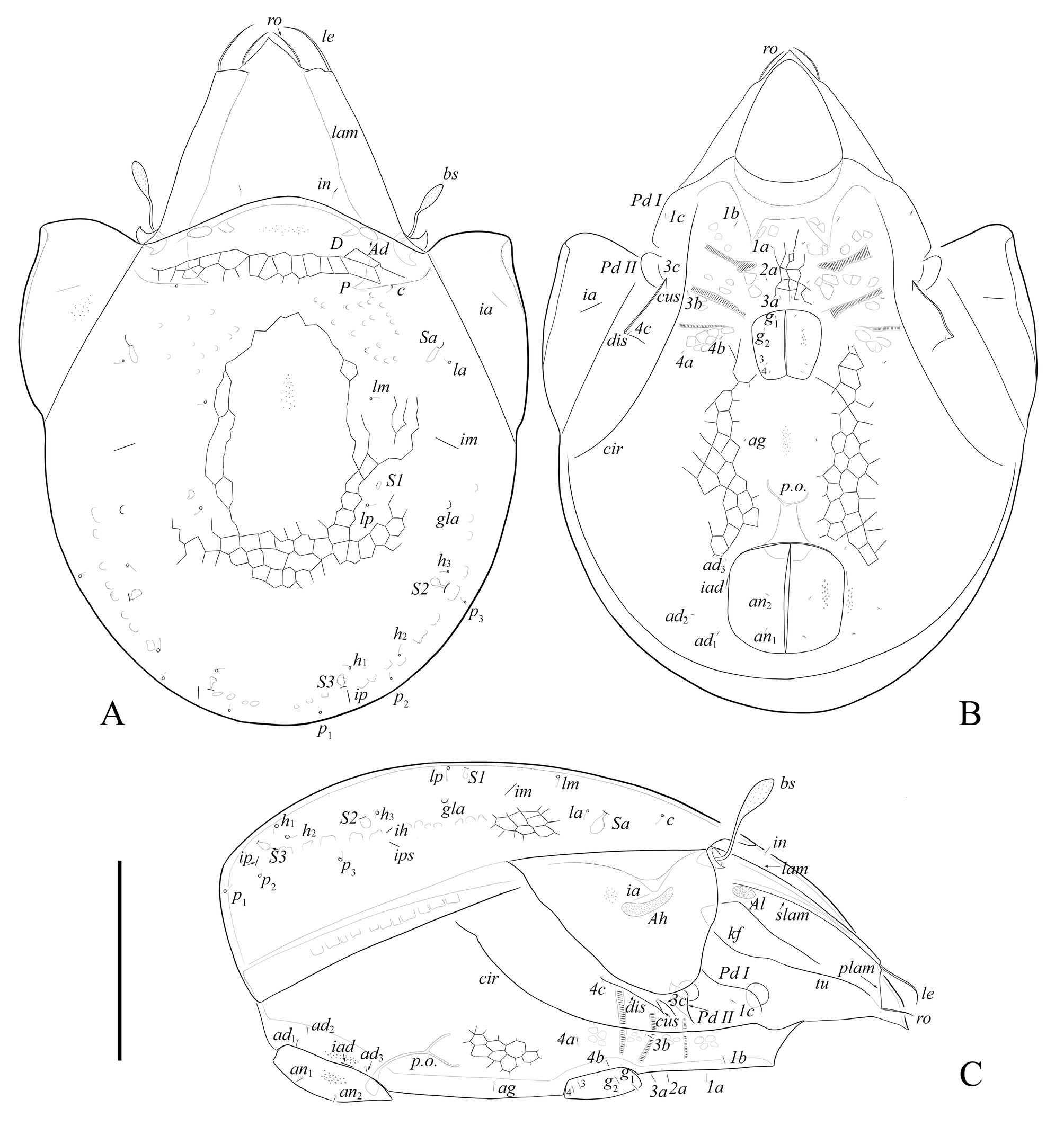 Epimeral and lateral podosomal regions — (Fig. 3B, C). Epimeral setal formula: 3-1-3-3. Epimeral setae 3c (15–20) setiform, others (4–8) needle-shaped. Discidium triangular. Custodium present. Humeral porose area Ah elongate oval; Am not observed. Circumpedal carina long, extended to pedotectum I.