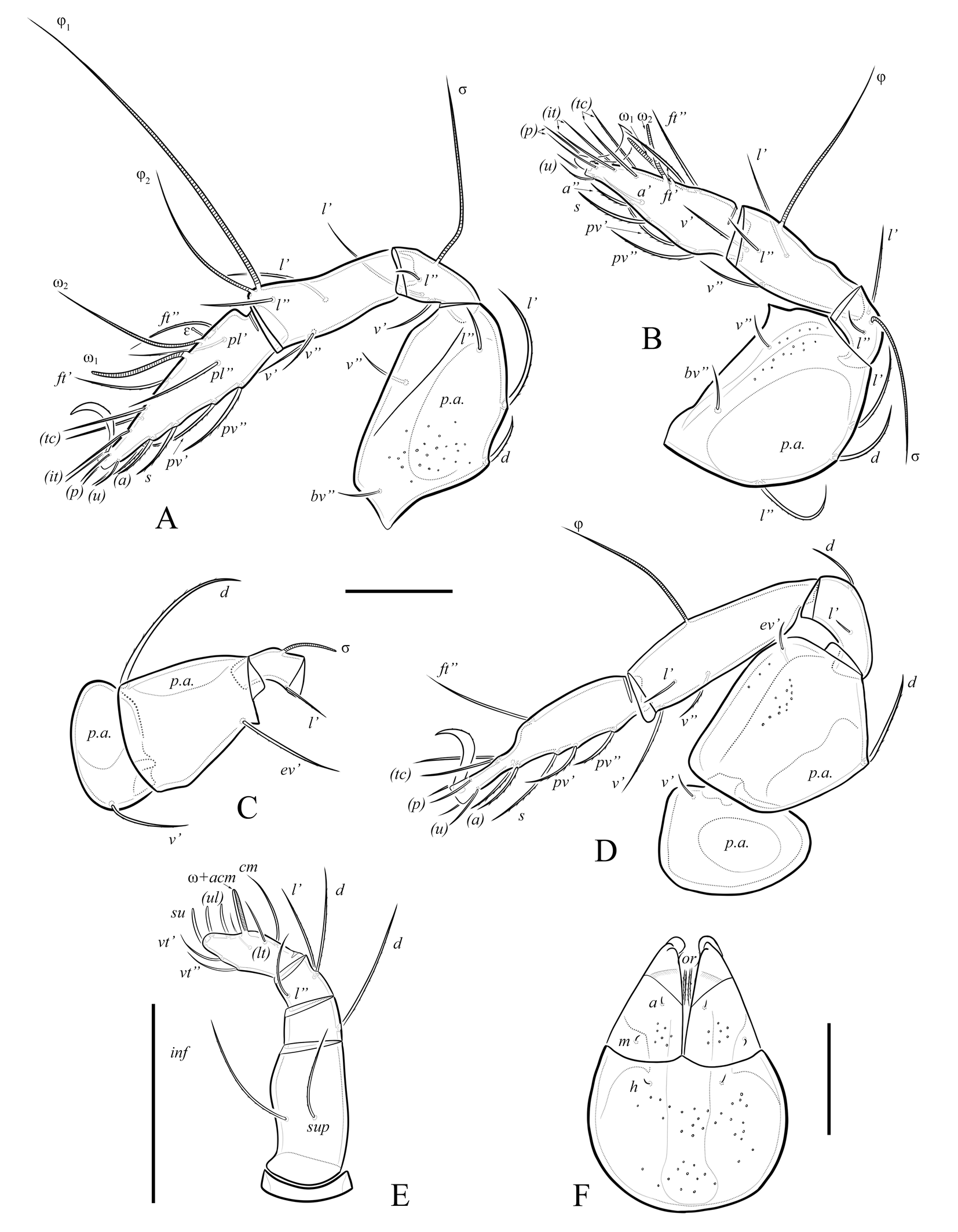 Legs: Tr, Fe, Ge, Ti, Ta = trochanter, femur, genu, tibia, and tarsus, respectively; p.a. = porose area; ω, σ, φ = solenidia; ɛ = famulus; d, l, v, ev, bv, ft, tc, it, p, u, a, s, pv, pl = setae.