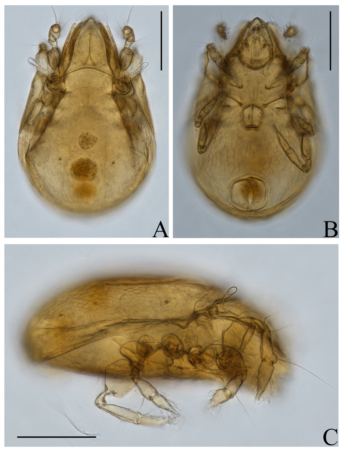 Integument — Body color light brown to brown. Notogaster anteriorly with reticulate pattern in a concave row; medial region in a rectangle not reticulate, medially and posteriorly around the rectangular region with reticulate pattern. The medial aera of epimeral region with reticulate pattern. Anogenital region (except medial region between genital and anal apertures) with reticulate pattern. Subcapitular mentum and gena, anal plate and its adjacent left and right sides, and antiaxial side on femora I, II and IV foveolate; genital orifice on one plate of one specimen foveolate, the others not. The regions without reticulate ornamentation often microfoveolate.