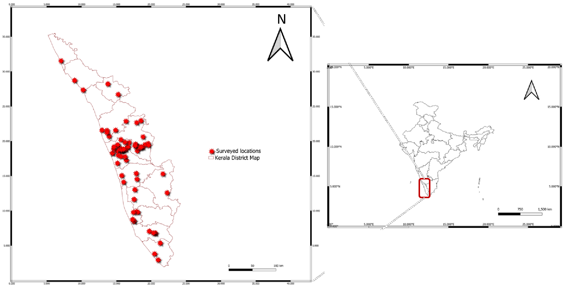 Though the above studies were not carried out over a wide area covering the entire state, new host records have been reported for some mite species. Recently, several new pest problems involving spider mites have emerged on tissue culture banana saplings and tapioca in the state (Swathi and Bhaskar, 2023; Bhaskar et al. 2024). Considering the geography of Kerala bounded on one side with the biodiversity rich Western Ghats, the spider mite fauna in the state is believed to be more diverse. However, a comprehensive study on spider mite fauna covering various agro-ecological zones of Kerala is lacking, highlighting the significance of this study.