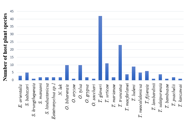 From the 25 species of spider mites recorded in the study, many were found to be serious pests of field crops and ornamental plants in Kerala. The most predominant mite species was T. gloveri, followed by T. truncatus and T. urticae, which recorded wider host range compared to other species.