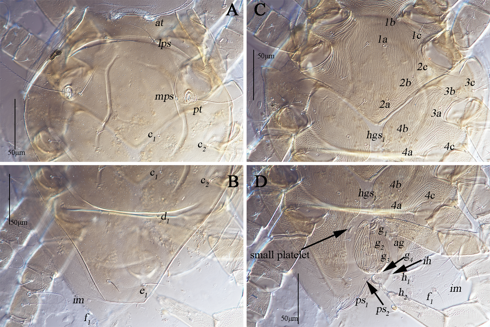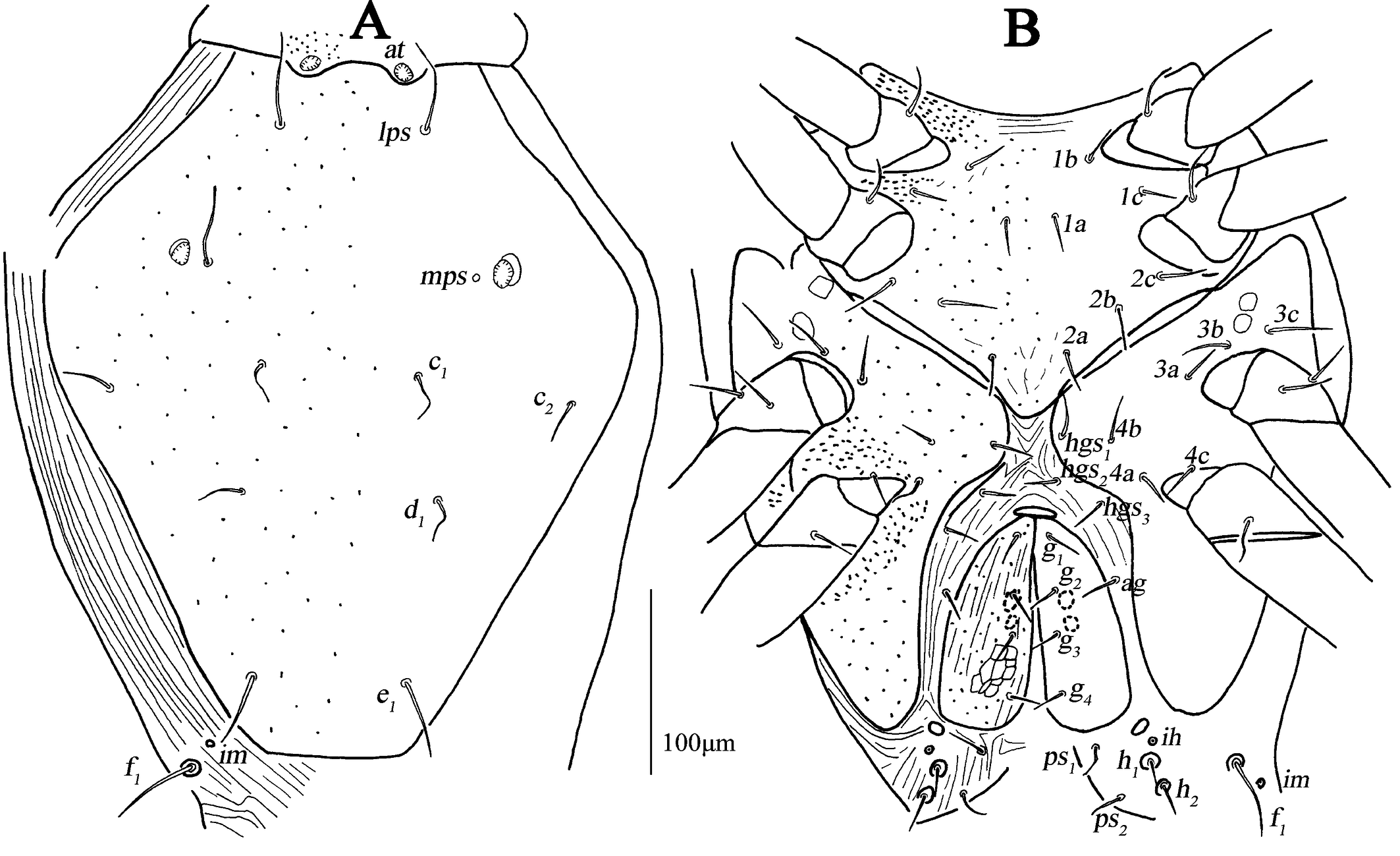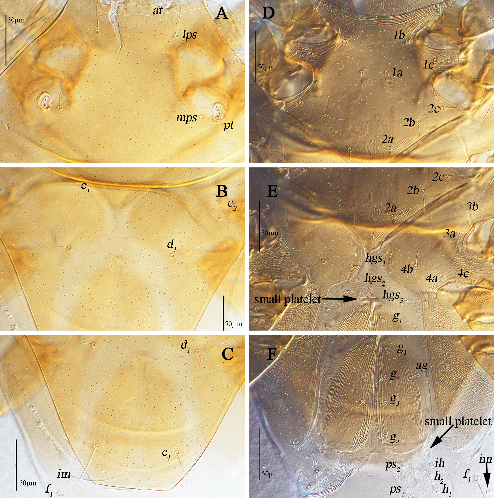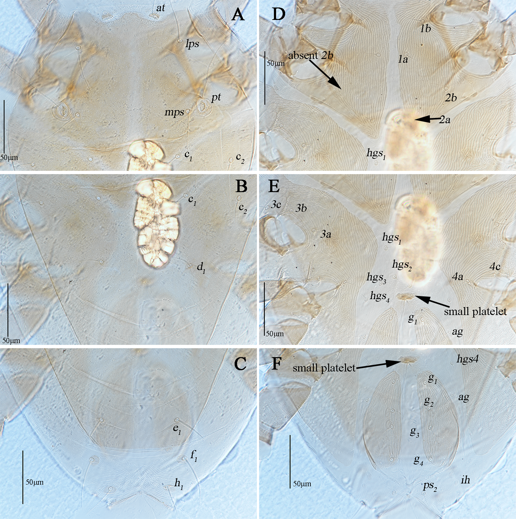Venter (Figs. 9B, 10D–F). Ventral area between coxae I and the gnathosoma with papillar striation. Coxae I–II divided medially to form sternal plates and with random punctation and striae; coxae III–IV fused to form paired lateral ventral plates and with random punctation, striae and papillar striation. Area between coxae plates I–II with longitudinal striation, between edges of divided sternal plates without a small median platelet. Posterior edge of coxal plates IV extending and almost reached to g4 level. Setal formula of coxal plates I–IV: 2(1a–b)-2(2a–b) (2b absent on the left)-3(3a–c)-2(4a, 4c) sts, length of setae: 1a 15 (14), 1b 23 (24), 2a 14 (15), 2b 13 (12), 3a 17 (18), 3b 18 (18), 3c 24 (26), 4a 11 (12), 4c 12 (12). Four pairs of hysterogastral setae (hgs1 –hgs4 ) subequal 11–12 in length, area between hgs1 and with transverse striation. Anterior to genital plates with a small platelet, long 17 (19), wide 10 (11). Genital plates 93 (88) long, 35 (33) wide, with broken longitudinal striation and random punctation, two pairs of visible genital papillae, four pairs of genital setae (g1 –g4 ) arranged longitudinally that 15 (13), 16 (15), 14 (15) and 18 (19) in length, respectively; one pair of aggenital setae (ag), 13 (12) in length, almost at g2 level. Anal region with two pairs of pseudanal setae (ps1 –ps2 ) 15 (14) and 18 (20) in length, one pair of h2 26 (29) and one pair of lyrifissures (ih).