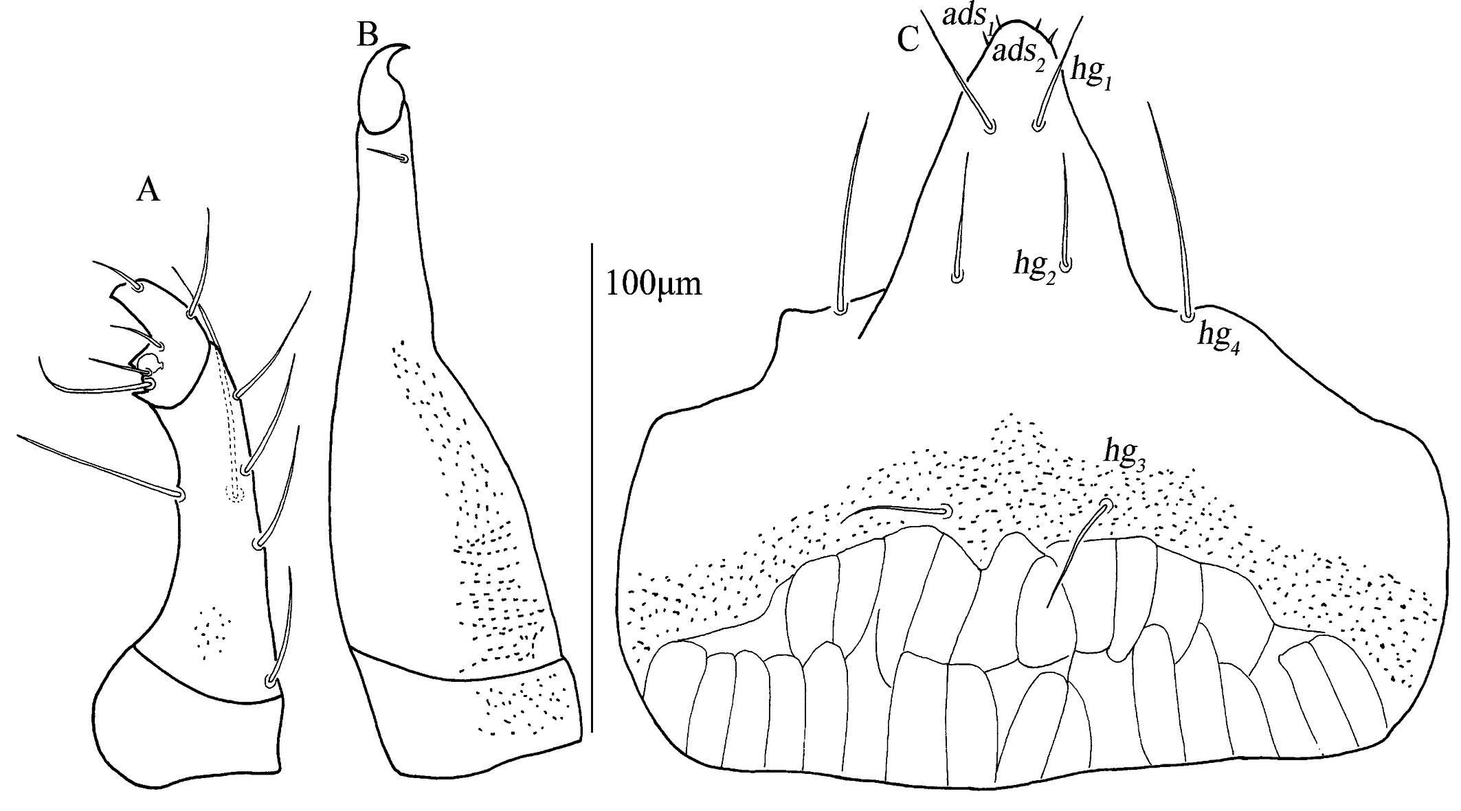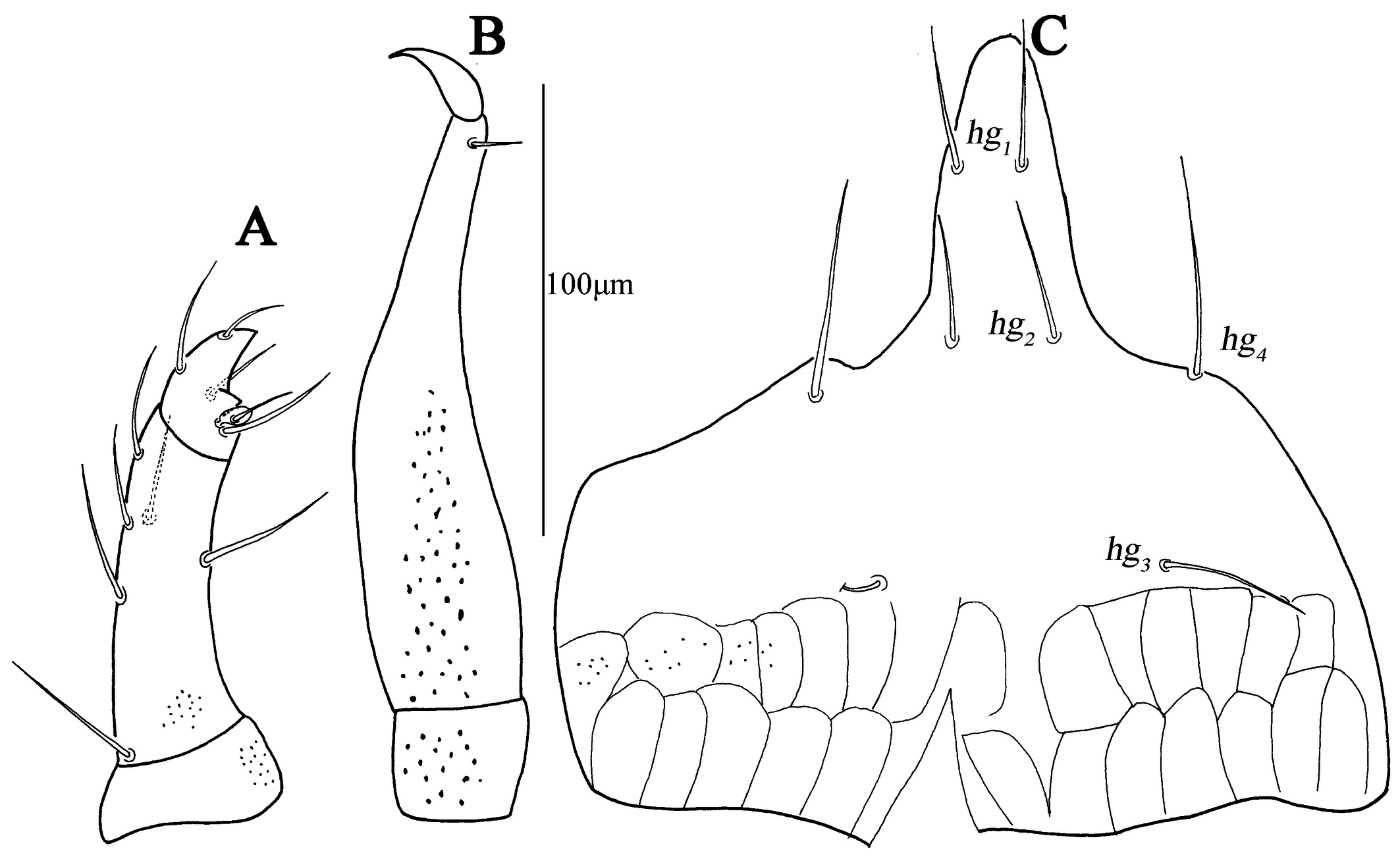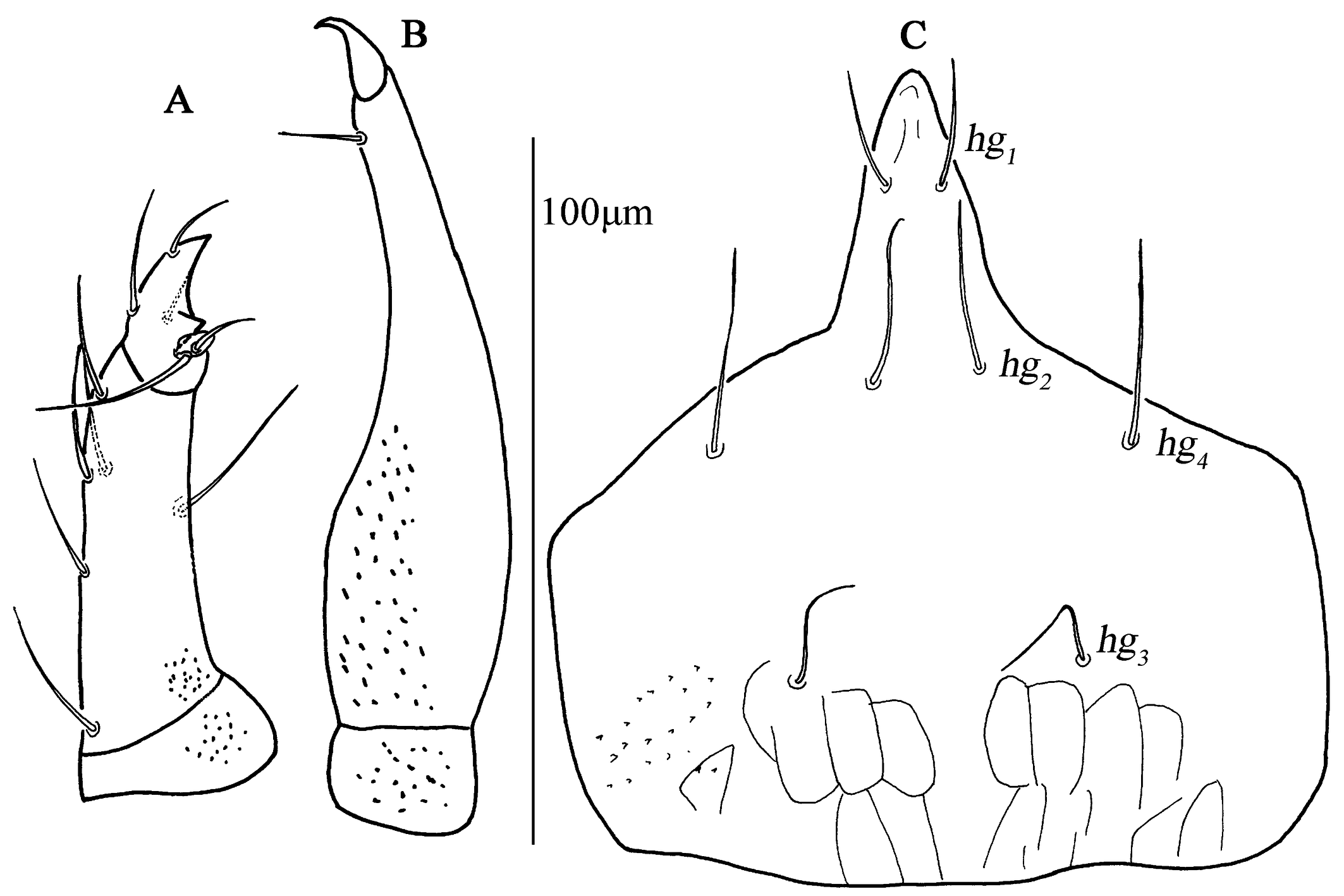 Subcapitulum (Fig. 7C). Resembling the female, 114–120 long, 98–103 wide; lengths of hg1 –hg4 : 18–20, 21–22, 12–15 and 24–26. Distances of hg setae: hg1 –hg1 7–8, hg2 –hg2 12–16, hg3 –hg3 38–41, hg4 –hg4 45–58, hg1 –hg2 26–28, hg2 –hg3 42–45, hg3 –hg4 33–37.