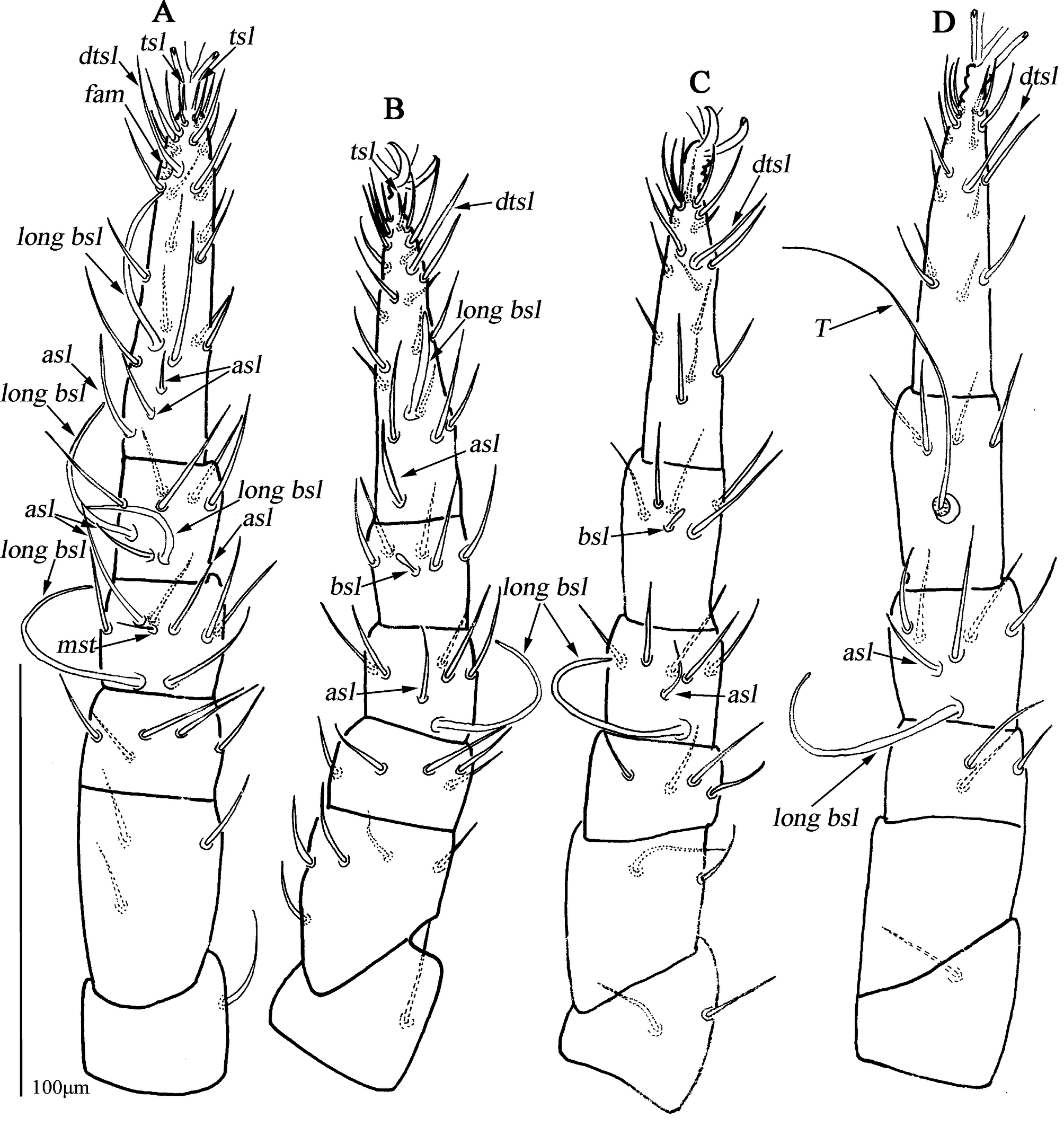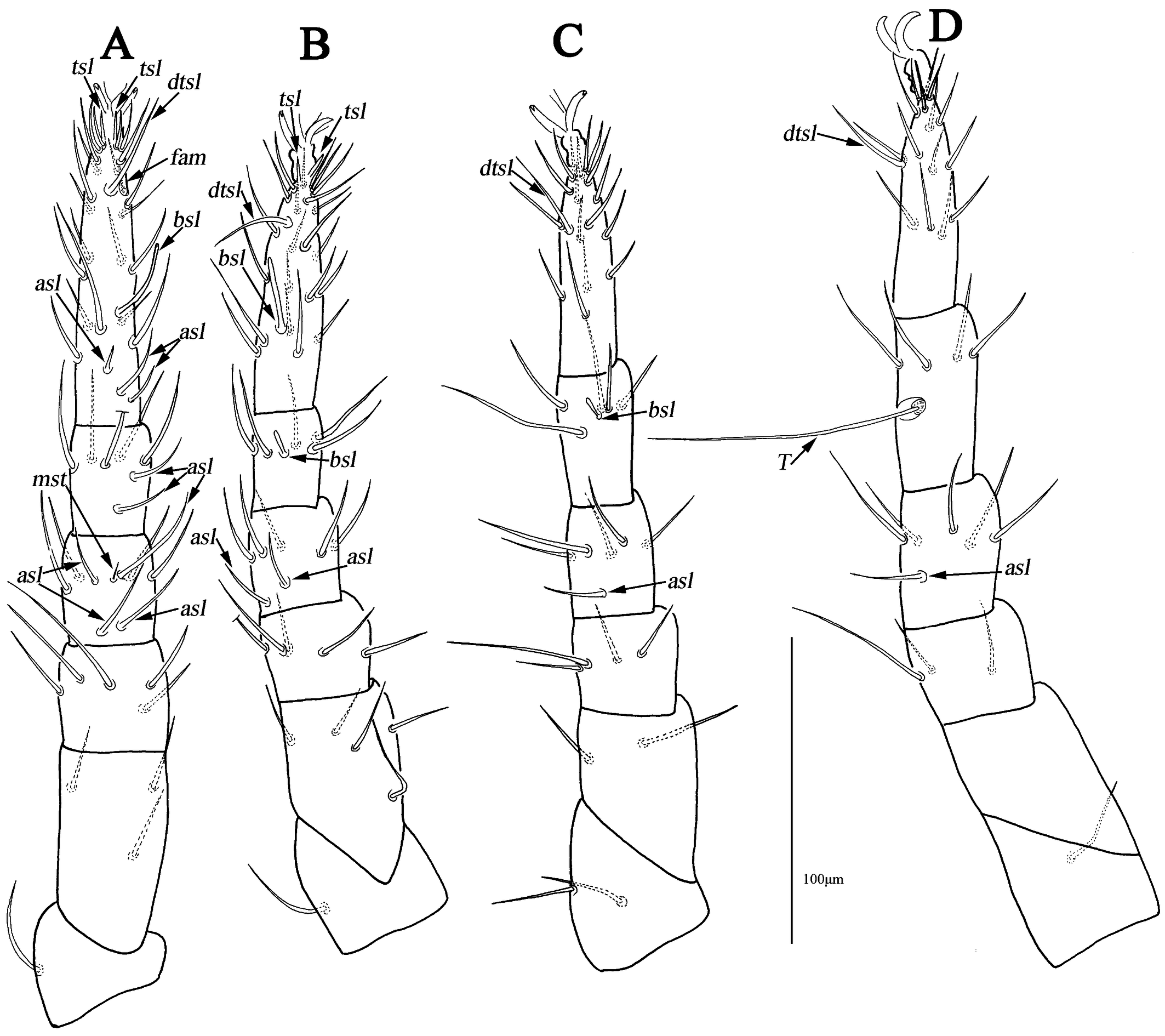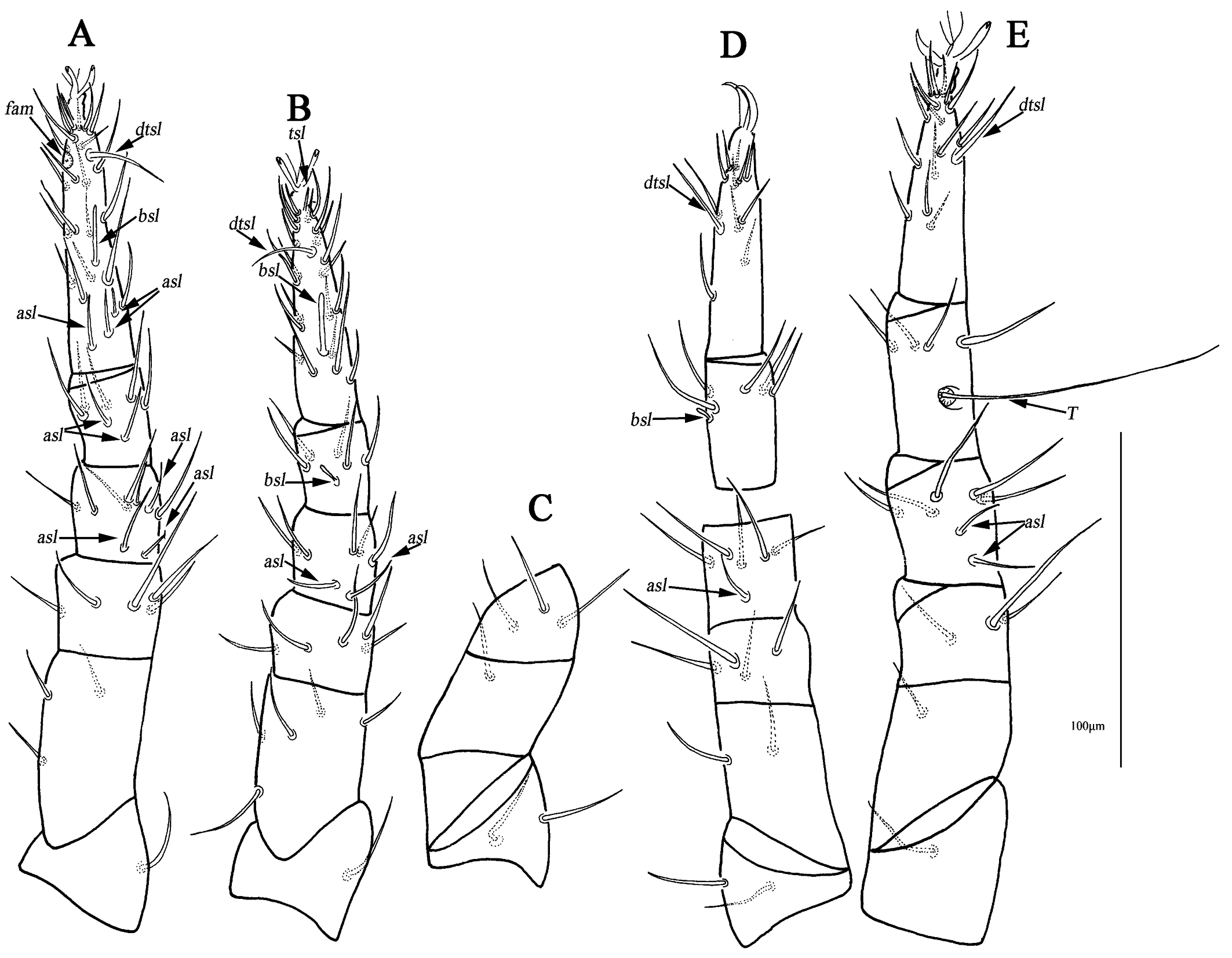 Legs (Fig. 8A–D). Resembling the female, lengths of leg I–IV: 212–224, 180–201, 199–216 and 222–231. Lengths of tarsi I–IV: 80–81, 66–68, 60–67 and 68–73. Seta T 72–74 in length. Legs I–IV chaetotaxy: coxae I–IV 3-3-3-3 sts; trochanters I–IV 1-1-2-1 sts; basifemora I–IV 3-5-2-0 sts; telofemora I–IV 5-5-4-3 sts; genua I–IV 2asl, 1 long bsl, \{1asl, 1mst\}, 4sts-1asl, 1 long bsl, 5sts-1asl, 1 long bsl, 5 sts-1asl, 1 long bsl, 5sts; tibiae I–IV 1asl, 2 long bsl, 5sts-1bsl, 5sts-1bsl, 5sts-1 smooth T, 4sts; tarsi I–IV 3asl, 1 long bsl, 1fam, 1dtsl, 2tsl, 21sts-1asl, 1 long bsl, 1dtsl, 1tsl, 21sts-1dtsl, 17sts-1dtsl, 16sts.