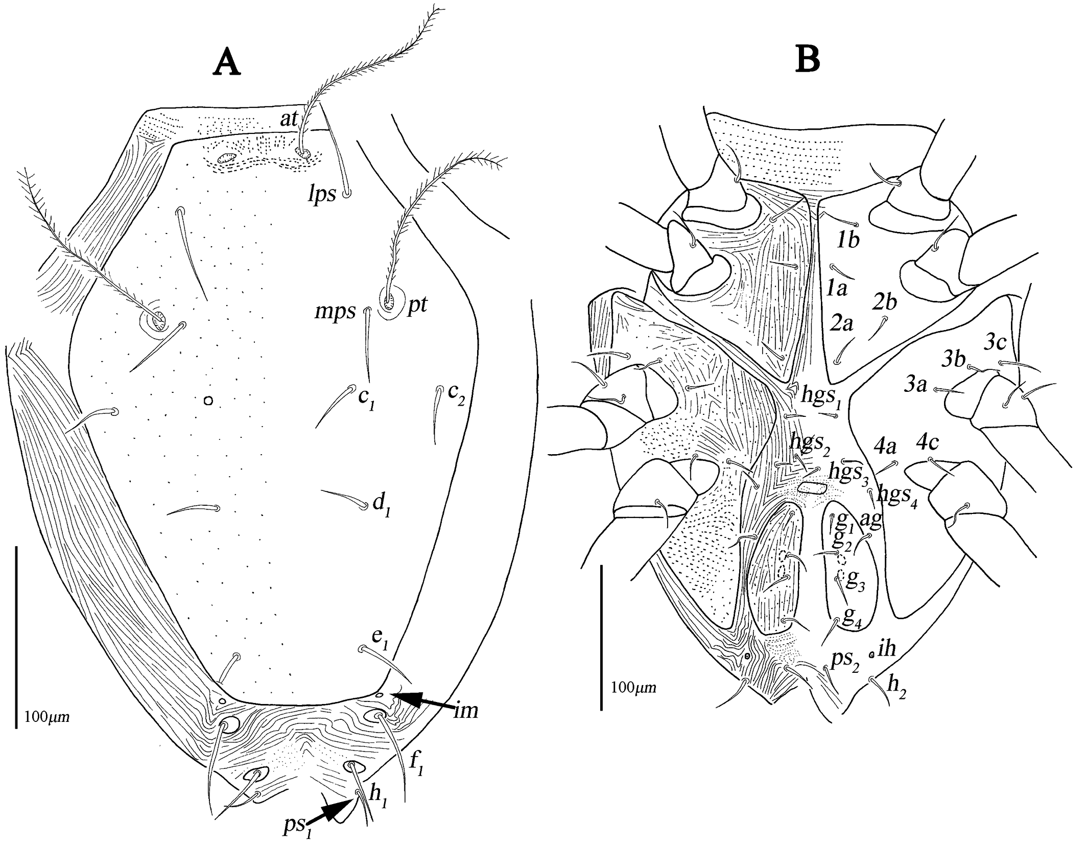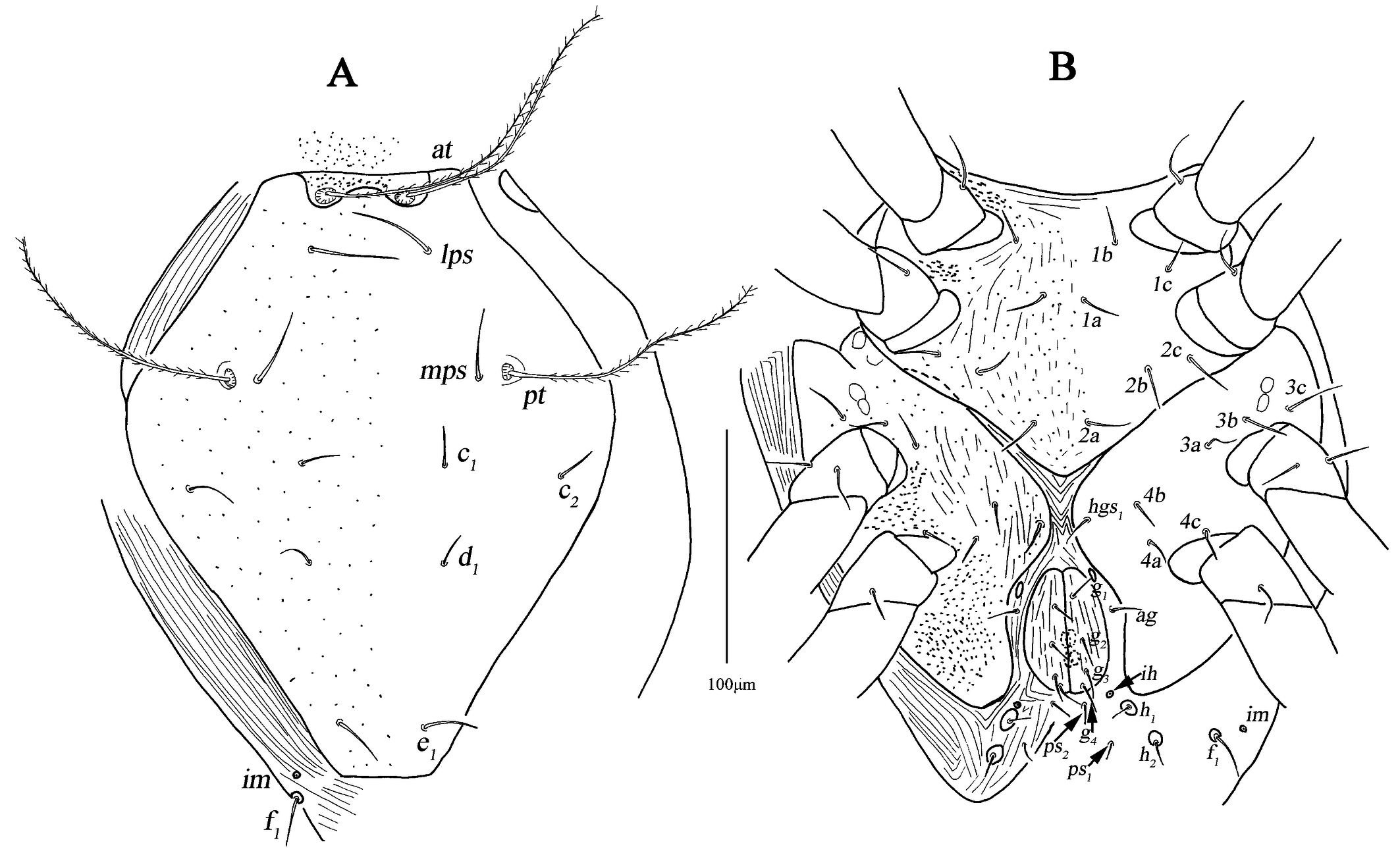 The following abbreviations are used: prodorsum: anterior trichobothria (at), posterior trichobothria (pt), lateral proterosomal (lps), median proterosomal (mps); hysterosoma: internal humerals (c1 ), external humerals (c2 ), internal dorsals (d1 ), internal lumbals (e1 ), internal sacrals (f1 ), internal clunals (h1 ), external clunals (h2 ); venter: propodogastral seta (ppgs), hysterogastral seta (hgs); anal region: pseudanal (ps); genital region: aggenitals (ag), genitals (g); gnathosoma: hypognathals (hg); leg: attenuate (sharply) solenidion (asl), blunt-pointed rod-like solenidion (bsl), famulus (fam), trichobothria (T), simple tactile seta (sts), microseta (mst), dorsoterminal solenidion (dtsl).