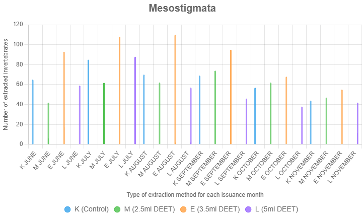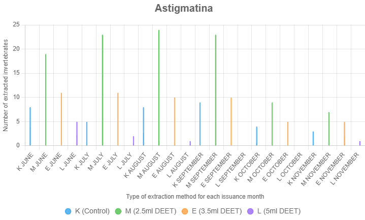 Astigmatina showed the strongest response to the 2.5 ml DEET concentration. This treatment consistently yielded higher numbers of Astigmatina across the study compared to both controls and other DEET treatments. The average extraction count for Astigmatina using 2.5 ml of DEET was notably higher than for the 3.5 mL and 5 mL treatments, suggesting that lower concentrations are optimal for this soft-bodied, highly sensitive group (Figure 3).