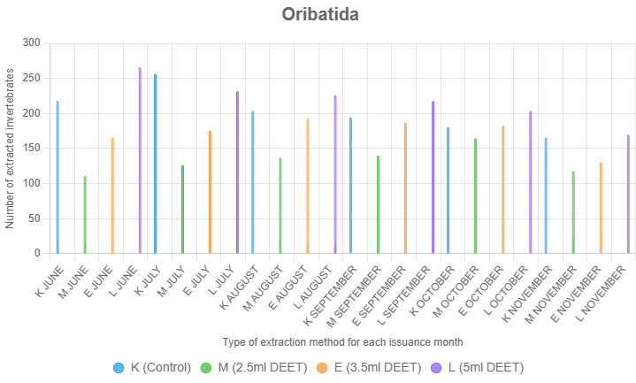 In untreated control samples, Oribatida were often the dominant group, reflecting their abundance and resilience. However, the addition of 5 ml DEET consistently increased extraction counts compared to controls, indicating its effectiveness in repelling this taxon (Figure 5).