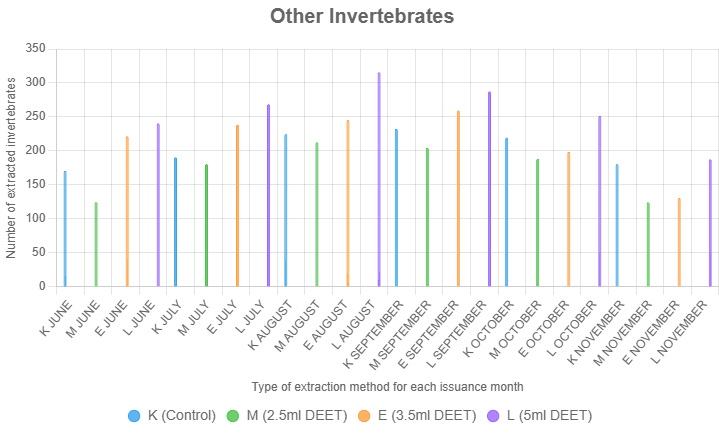 Other invertebrates, particularly springtails (Collembola), responded most strongly to the 5 ml DEET treatment (Figure 6). This trend underscores the effectiveness of higher DEET concentrations in targeting fast-moving and chemically sensitive taxa. The enhanced extraction of springtails at 5 ml suggests that this concentration is particularly effective for studies focused on this ecologically significant group.