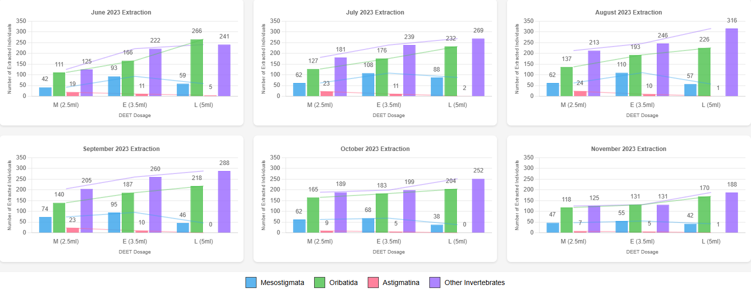 DEET-treated setups outperformed controls in extracting Astigmatina, Mesostigmata, and other invertebrates. Each DEET concentration showed a distinct advantage for specific taxa, confirming the hypothesis that chemical repellents can be optimized for targeted extraction (Figure 7).
