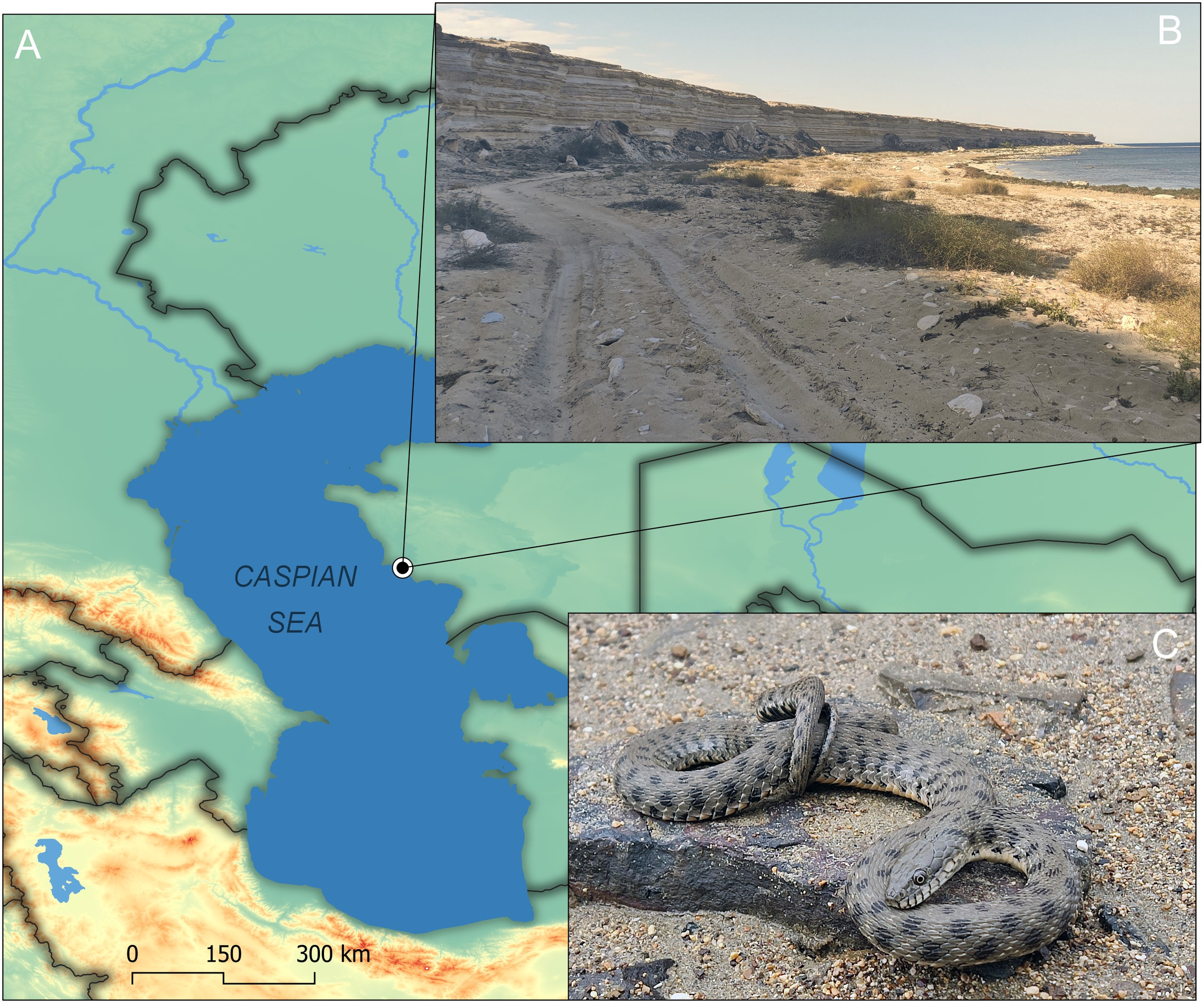 Mites were collected with forceps from the body surface of a dice snake, Natrix tessellata (Laurenti, 1768), in the Mangystau province of Kazakhstan (Fig. 1), transferred to 70% alcohol, and mounted on slides in Faure-Berlese medium. Mites were identified according to the key of Moraza et al. (2009). External measurements were made in micrometers (μm). Slide-mounted voucher specimens were deposited in the Parasitological Collection of the Tyumen State Medical University (Tyumen, Russia).