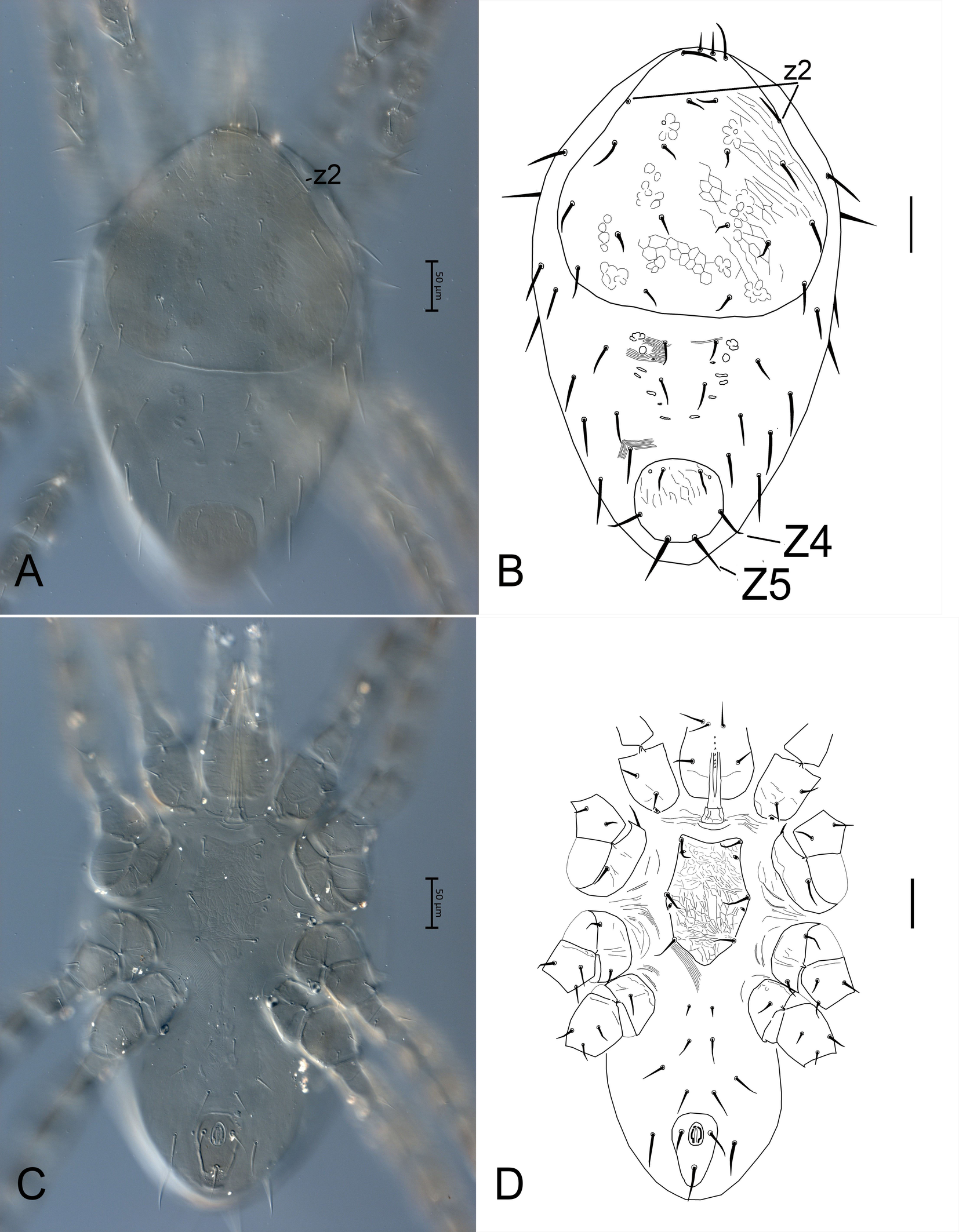 The measurements of the body parts of the collected specimens are presented in Table 1. According to the key of Moraza et al. (2009) protonymphs of O. natricis are morphologically similar to O. eremiadis (Naglov & Naglova, 1960) described from several racerunner species Eremias sp. (Reptilia: Lacertidae) from Kazakhstan. The species O. eremiadis has a fairly brief description, but it contains clear features that distinguish it from other species of the genus. The protonymph of O. natricis, however, differs in the chaetotaxy and characteristics of some setae. In protonymphs, setae z2 are located on the podonotal shield (in contrast to the position of z2 on the cuticle in O. eremiadis); setae z5 are slightly longer than z4 (z5 setae is conspicuously longer than z4 in O. eremiadis); and the length to width ratio of the pygidial shield is 0.8-0.9 (in contrast to a ratio of 0.6 in O. eremiadis) (Naglov & Naglova 1960; Moraza et al. 2009; Fig. 2C; Table 1).