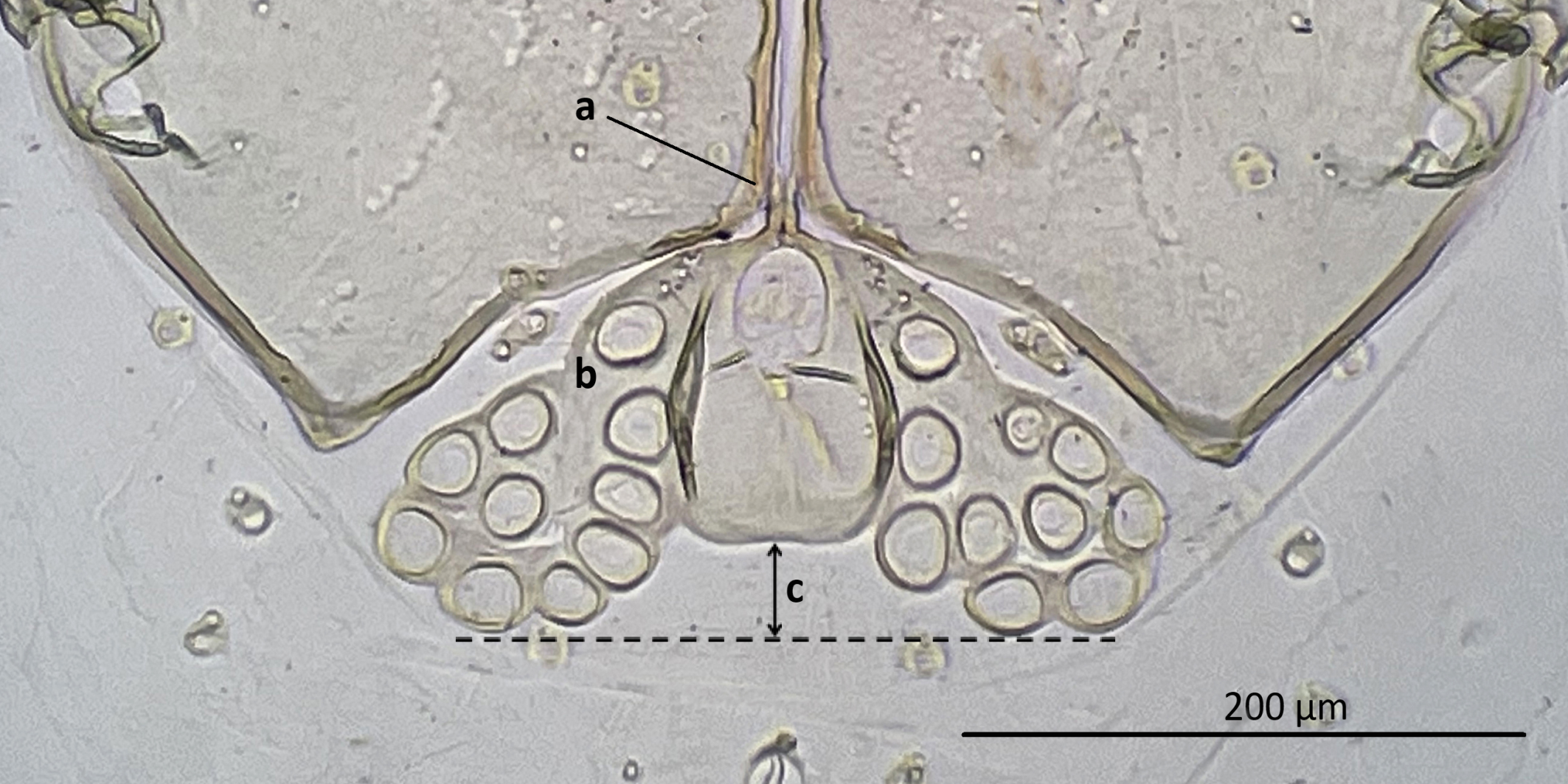 The shape of the genital field provides a unique distinguishing characteristic between the males of the two species. In P. dispersa, the genital plates have a more posterior orientation than in P. variabilis, extending posteriorly beyond the genital cavity by a distance equivalent to 1 to 1.5 times the diameter of an acetabulum (Figures 3 and 4A). In contrast, in P. variabilis, this extension reaches at most half the diameter of an acetabulum (Figure 4B). This characteristic shows no overlap between the two species across all collected specimens. Furthermore, the anterior point of the genital field in P. dispersa is elongated and usually longer than it is wide. In P. variabilis, however, this point appears as a blunt triangle (Figures 3 and 4). In most specimens of P. dispersa, the genital plates features a notch or are deeply concave lateral to the anterior acetabulum (Figure 3 and 4A). In P. variabilis, on the other hand, the genital plates are only slightly concave near the anterior acetabulum (Figure 4B).