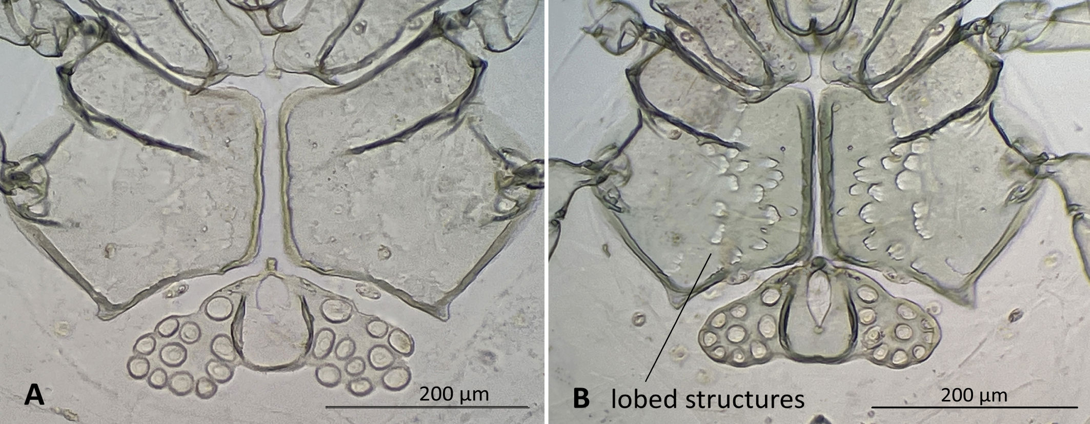 Several other characteristics help to distinguish between the males of the two species. In particular the medial distance between the coxal plates is, on average, greater in P. dispersa than in P. variabilis, although their ranges overlap to some extend (Figure 4A and B, Table 1). Additionally, the chitinized medial margin of coxal plates III and IV is broader in P. variabilis than in P. dispersa. Furthermore, in most specimens of P. variabilis, the surface of coxal plates III and IV displays a relief of distinct lobed structures, whereas in P. dispersa, these lobes are faint or absent, resulting in a relatively smooth appearance. Cook (1974) refers to these lobed structures as muscle scars, which we believe is incorrect, as these structures are located on the outside of the coxal plates. A summary of all distinguishing features is provided in Table 1.
