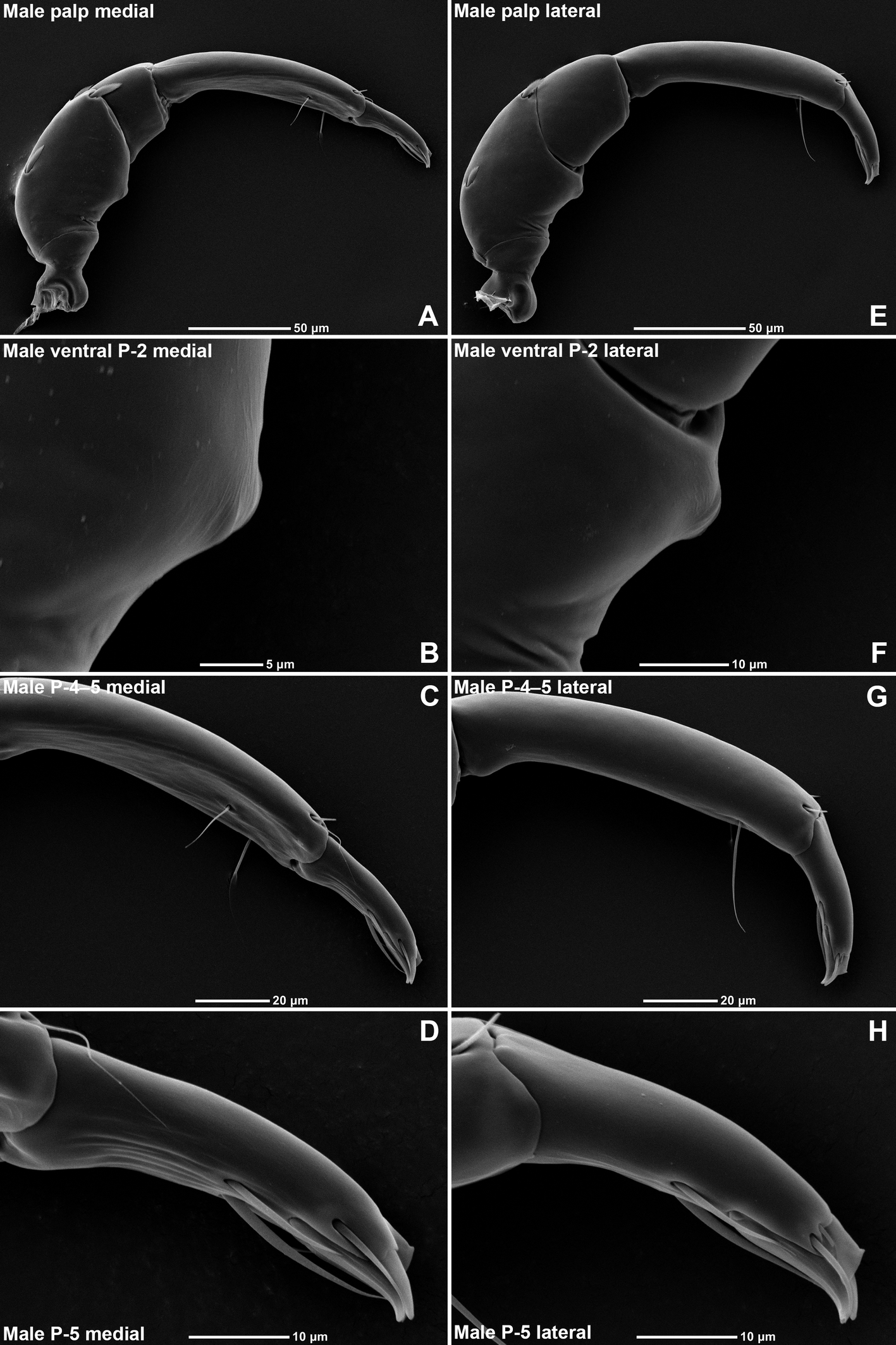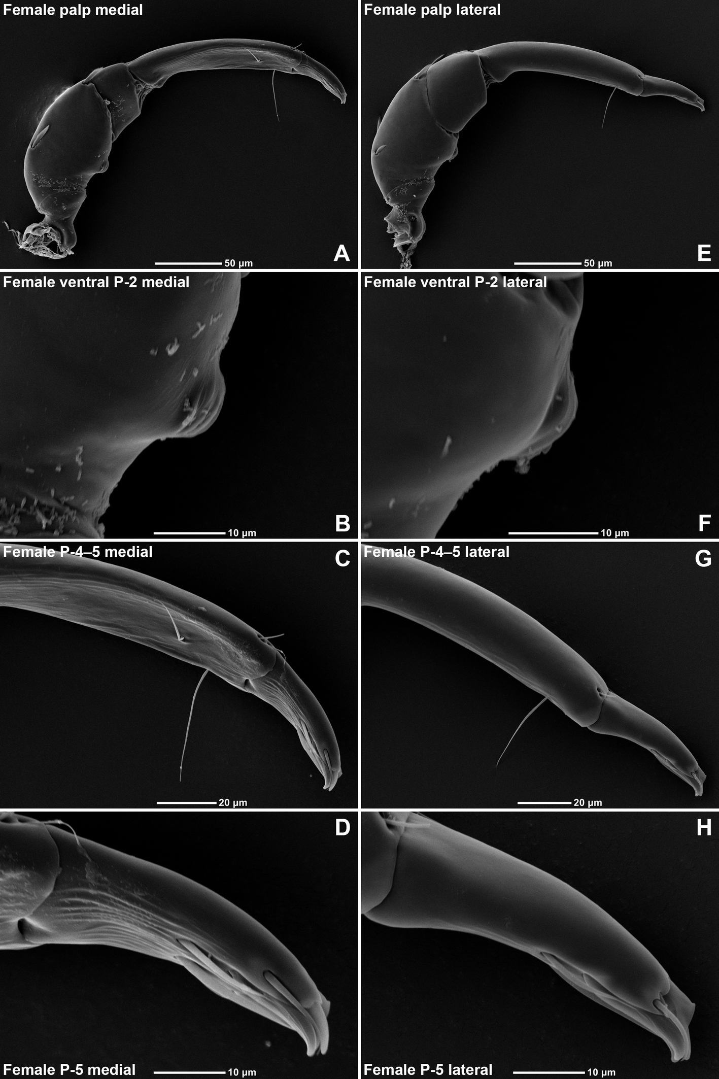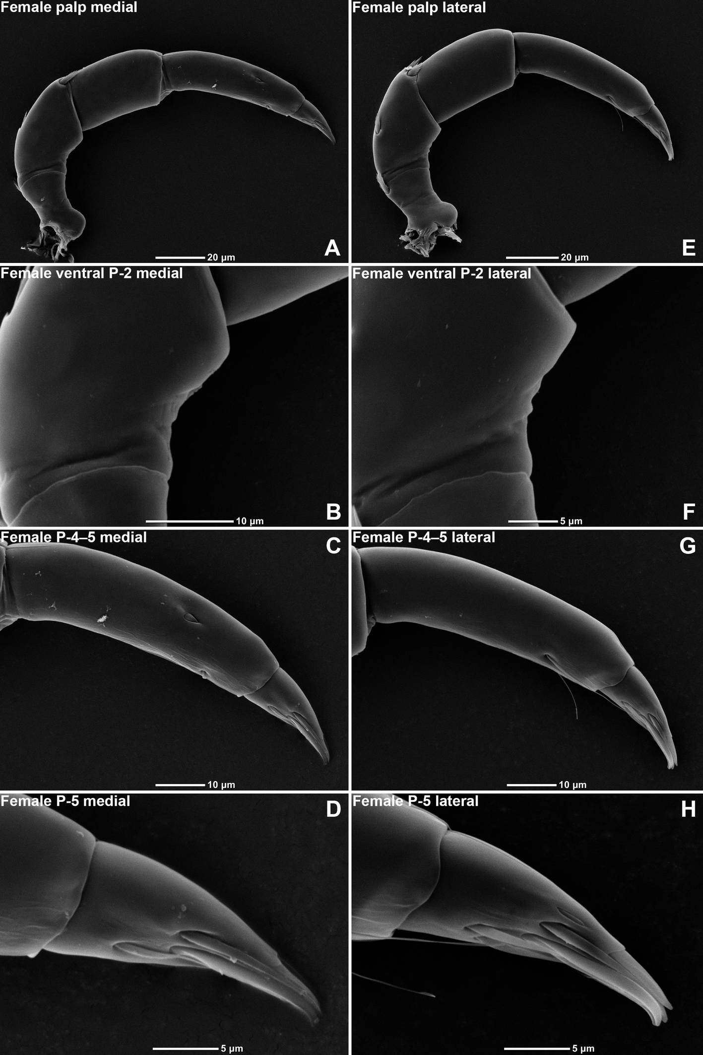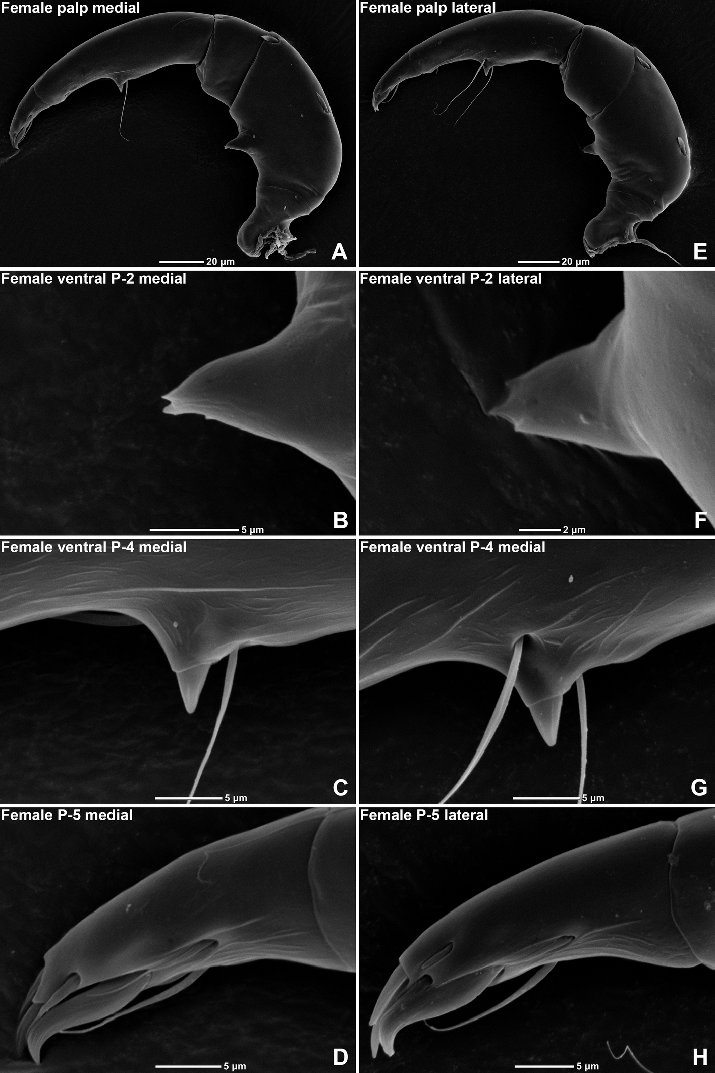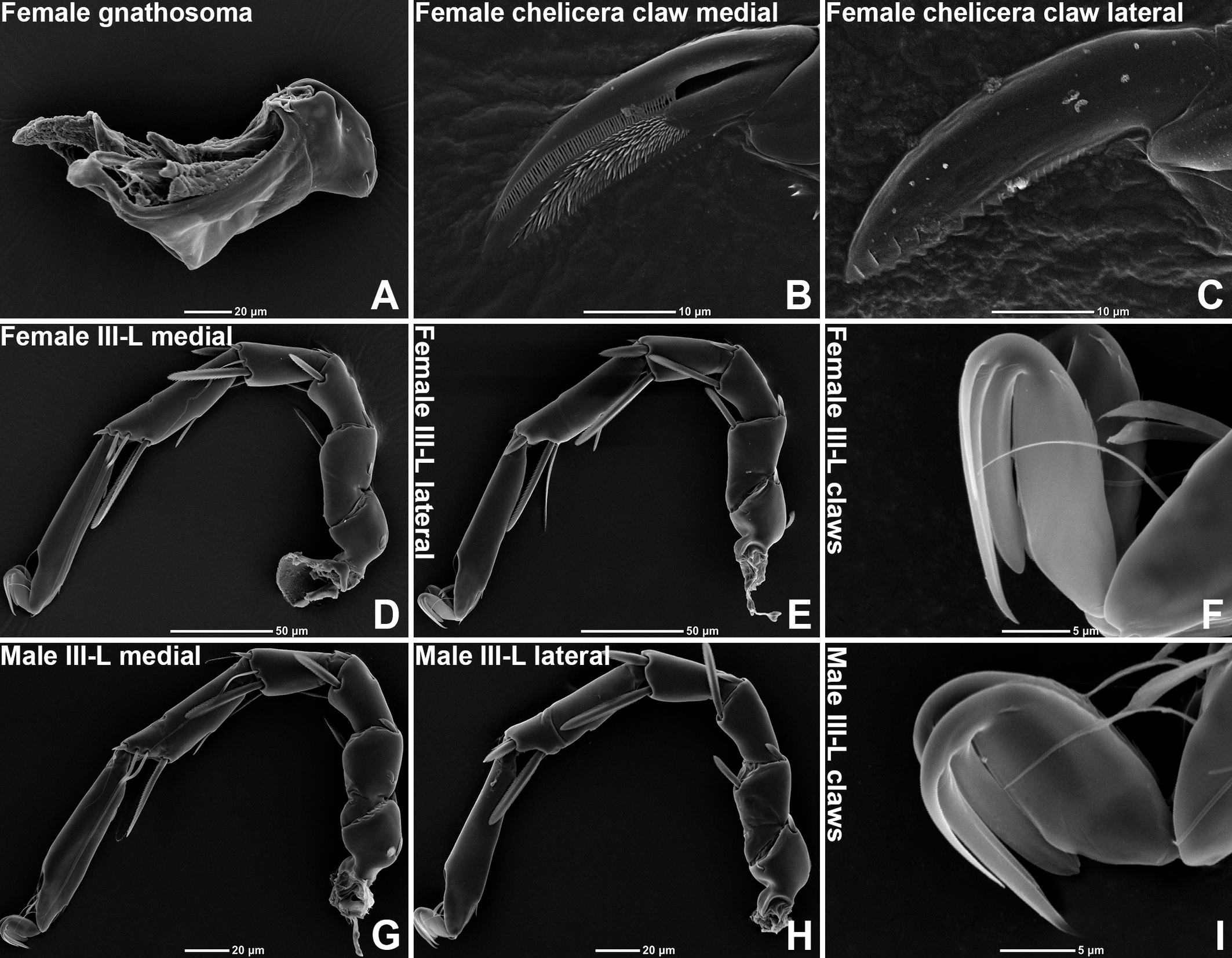 Gnathosoma not fused with ACG with a short rostrum bearing two pairs of setae, apodeme located inside the idiosoma and appearing trapezoid in ventral view (Fig. 3F–G). Chelicera consisting of two segments (Fig. 3I); cheliceral claw having a narrow groove with fence-like structure, and dense minute seta-like projections in medial view (Fig. 5B); many teeth ventrally in lateral view (Fig. 5C). Palp five-segmented (Fig. 6A, E); P-1 with one dorsal seta; P-2 with 4–5 dorsal setae, and a large protrusion without seta ventrally (Fig. 6B, F); dorsal P-3 with a fine seta terminally; two long fine setae near a stout seta at the middle of the ventral margin of P-4, and a fine anteroventral seta (Fig. 6C, G); stout P-5 bearing six setae in total, with two stout claws, and two seta-like claws (Fig. 6D, H).