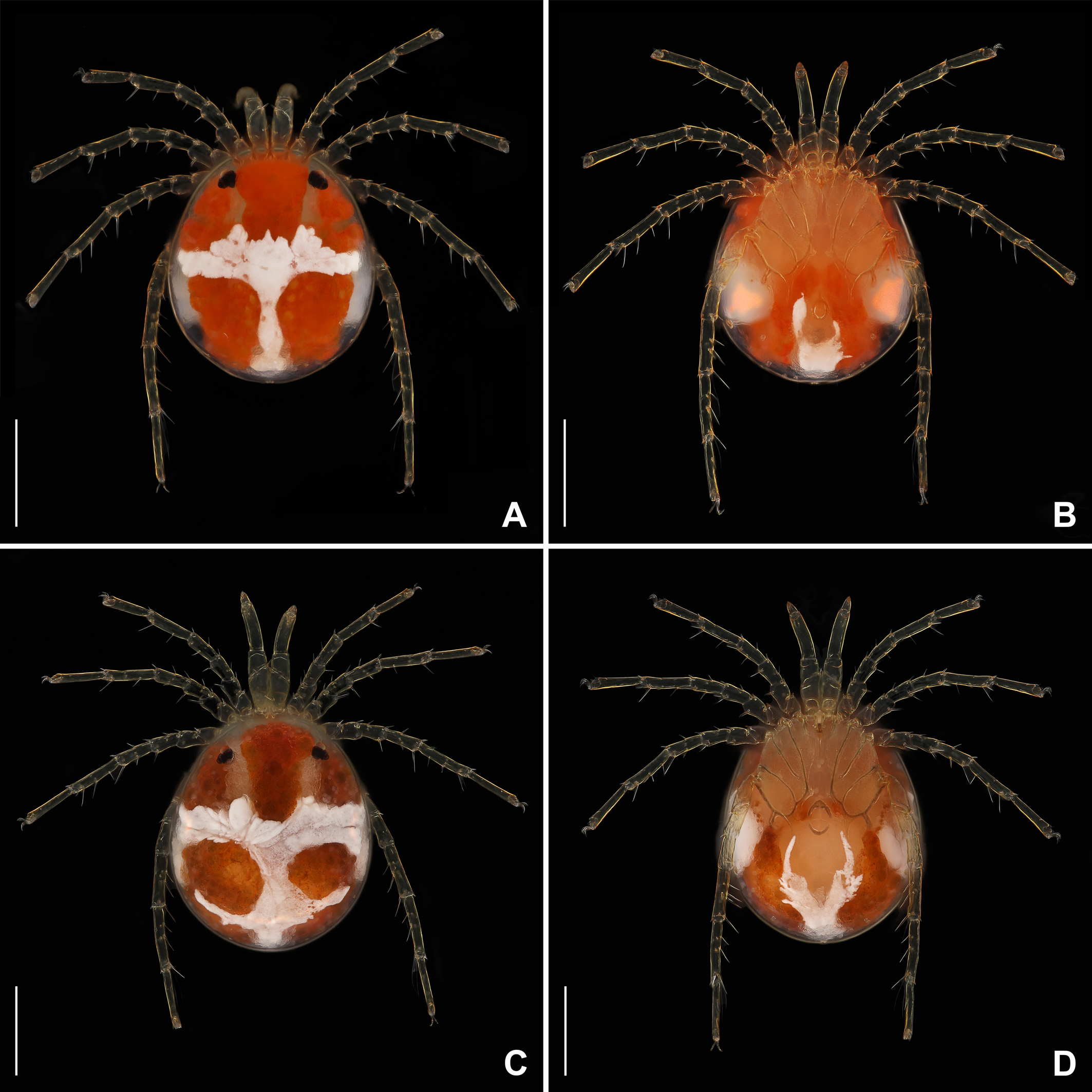 The terminology and abbreviations used were updated from Jin (1997): a.s.l. = above sea level, A1 = preantennal glandularia, A2 = postantennal glandularia, Ae = anterior extension, C2 and C4 = coxoglandularia 2 and 4, Cx-I–IV = coxae I–IV, El1 = the first pair of eye lenses, El2 = the second pair of eye lenses, D1 –D4 = dorsoglandularia 1–4, I-L-1–6, etc. = the first–sixth segment of the first leg, etc., L = length, L1 –L4 = lateroglandularia 1–4, Ma = medial apodeme, O1 = preocularia, O2 = postocularia, P-1–5 = the first–fifth segments of the palp (from most proximal to most distal), So1 –So5 = slit organs 1–5, V1 –V4 = ventroglandularia 1–4, W = width, Wa = wheel-like acetabula.