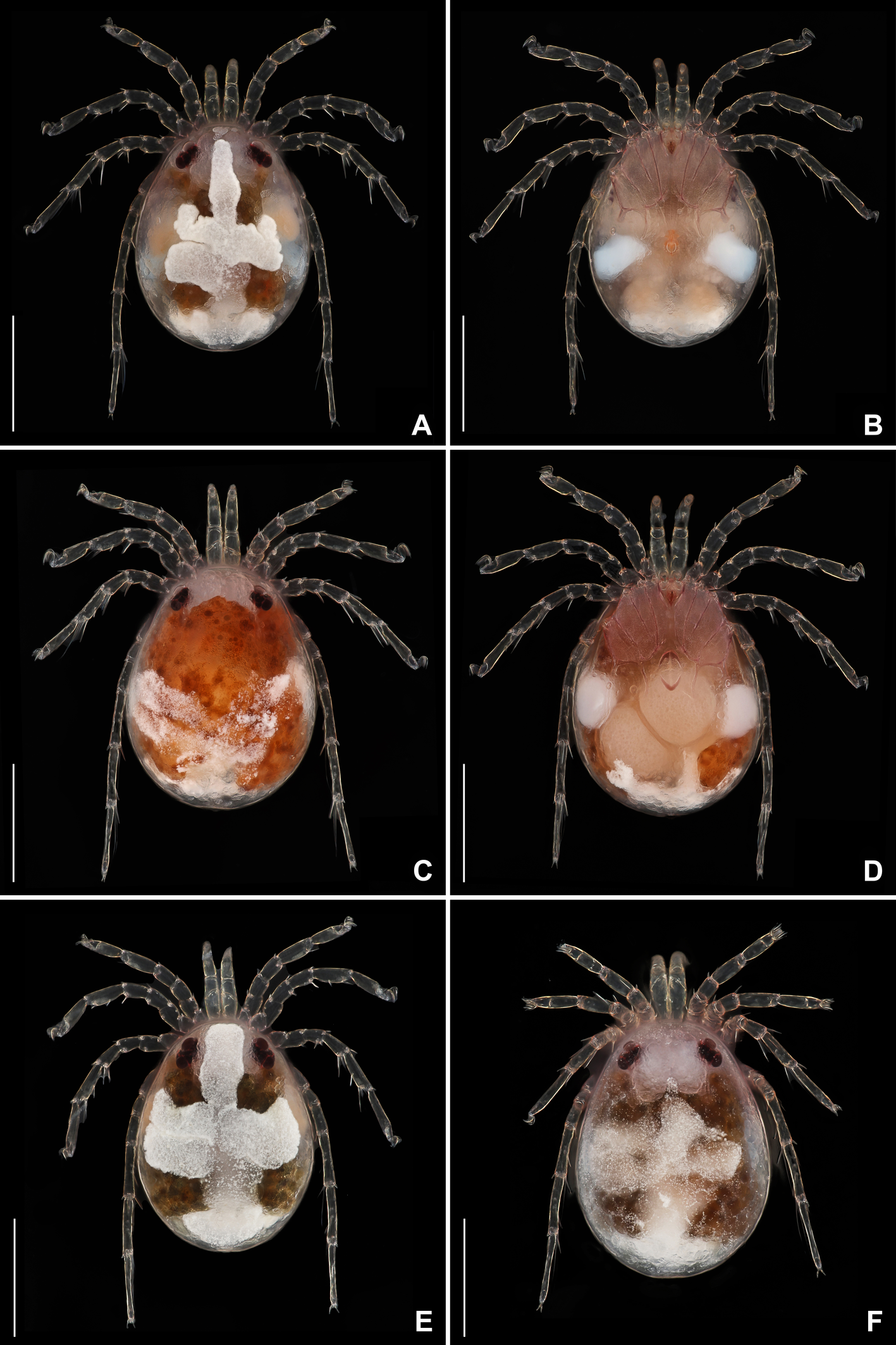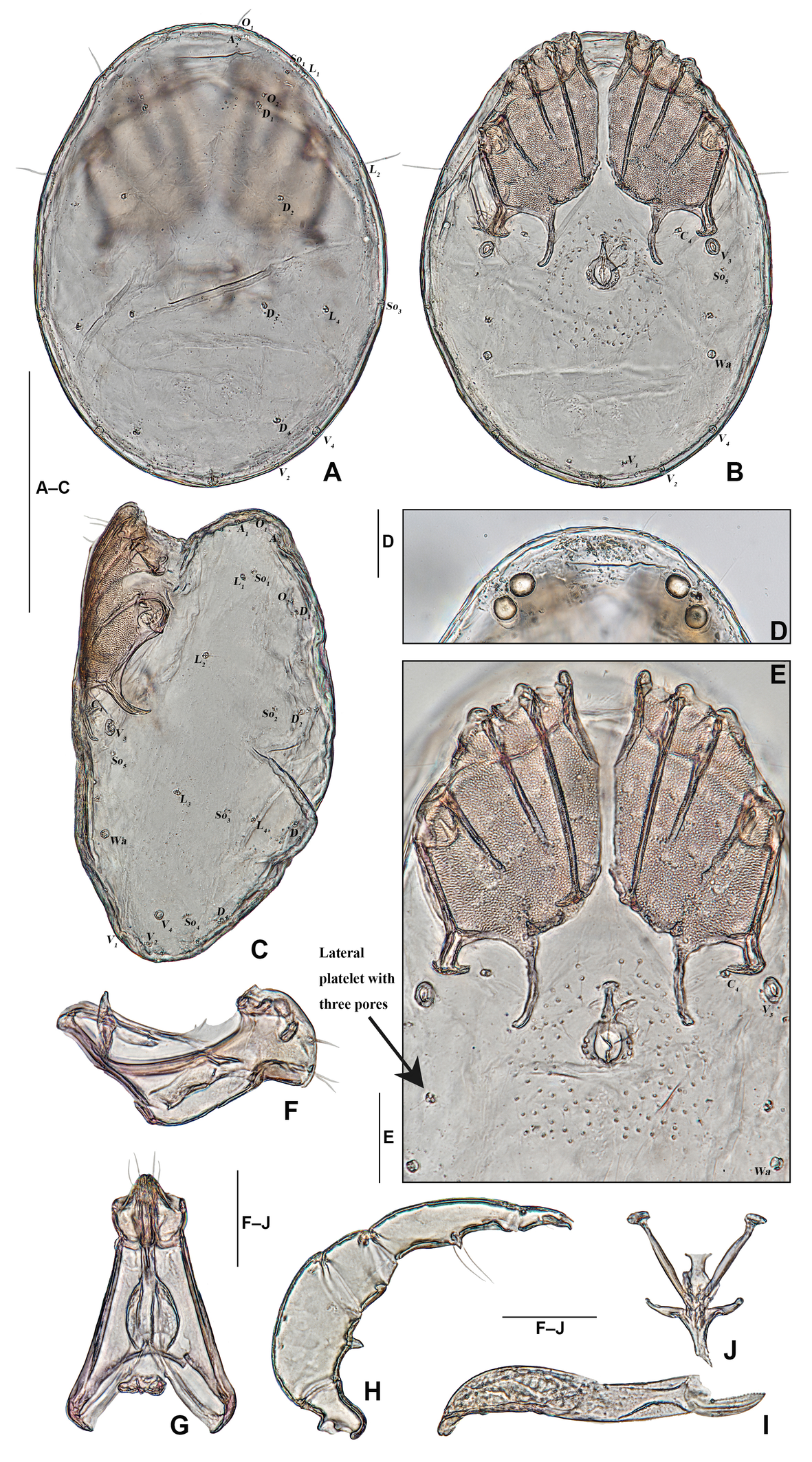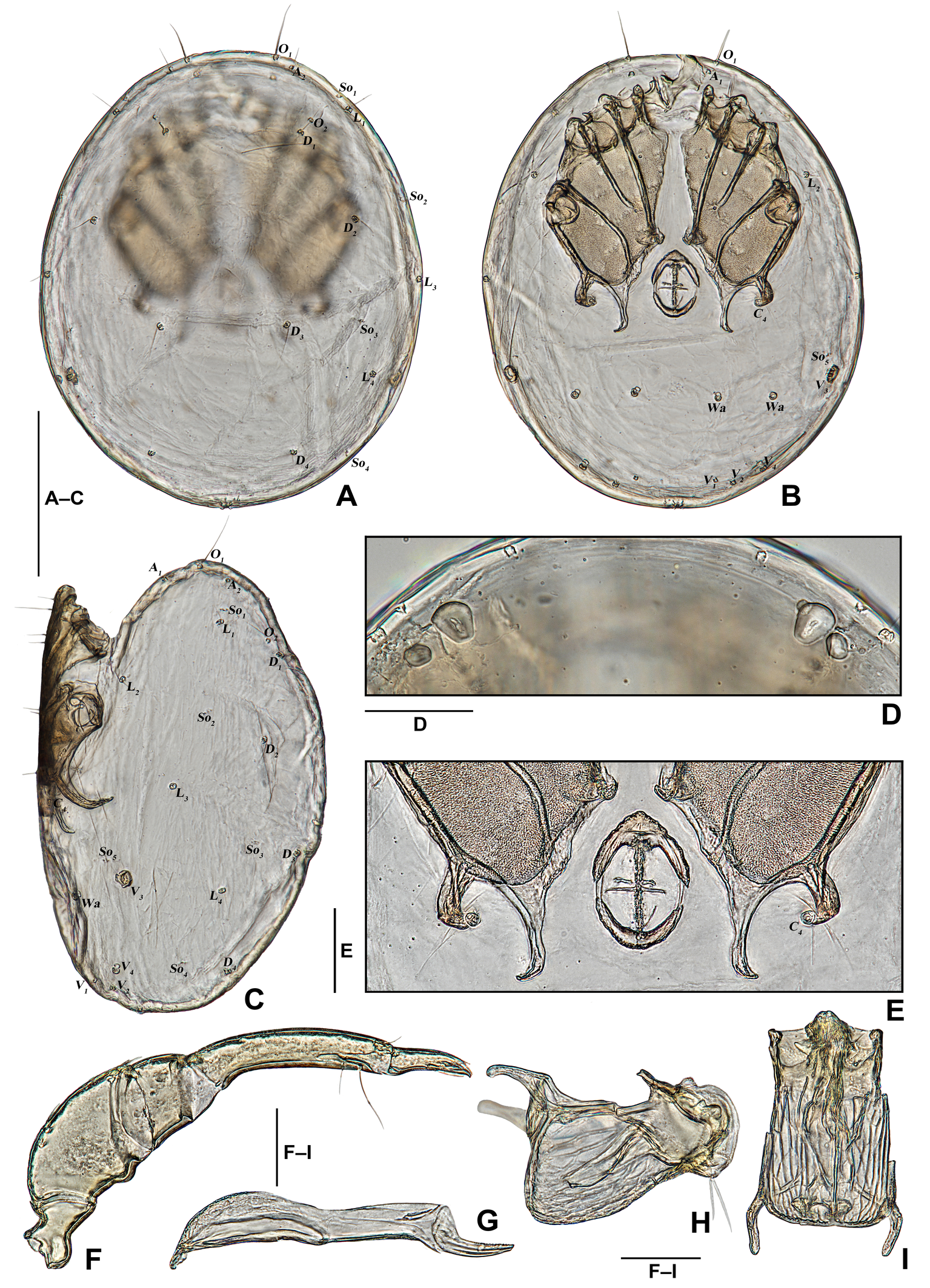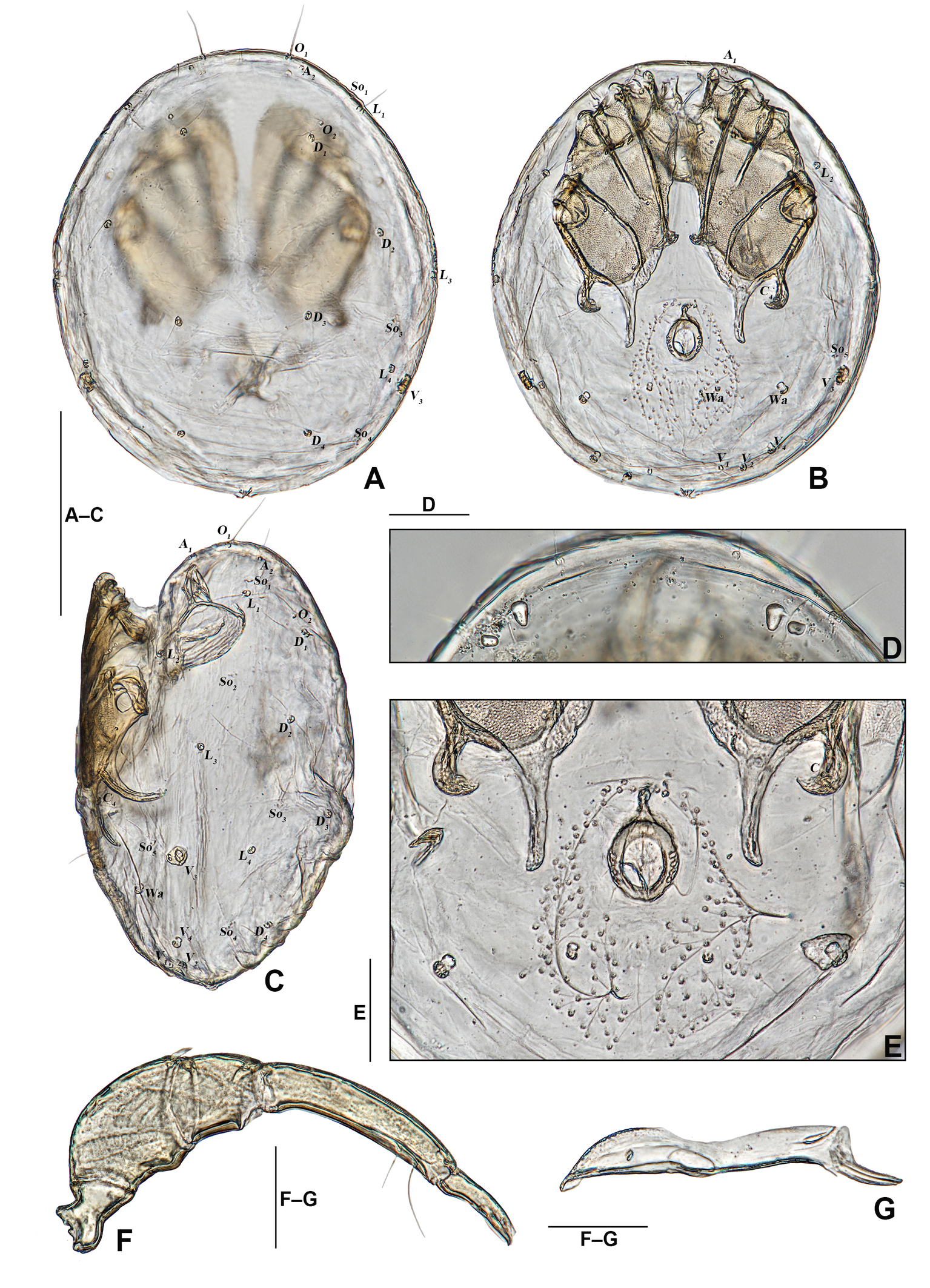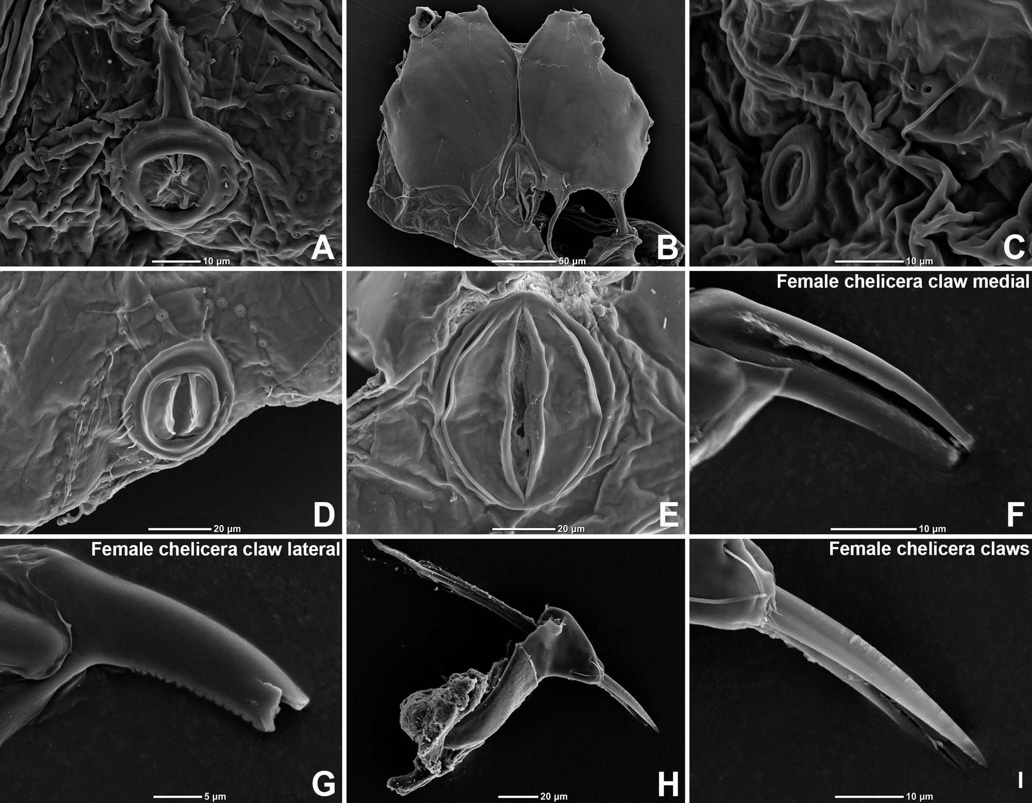Female (n=4) — In most aspects similar to male (Figs 9, 10). Sexual dimorphism exhibited in the following characters. Genital field situated between Cx-IV, pregenital sclerite arrow-shaped, postgenital sclerite lunate (Fig. 9E). An extra pair of wheel-like acetabula compared to males, located posterior to the genital field (Fig. 9B).