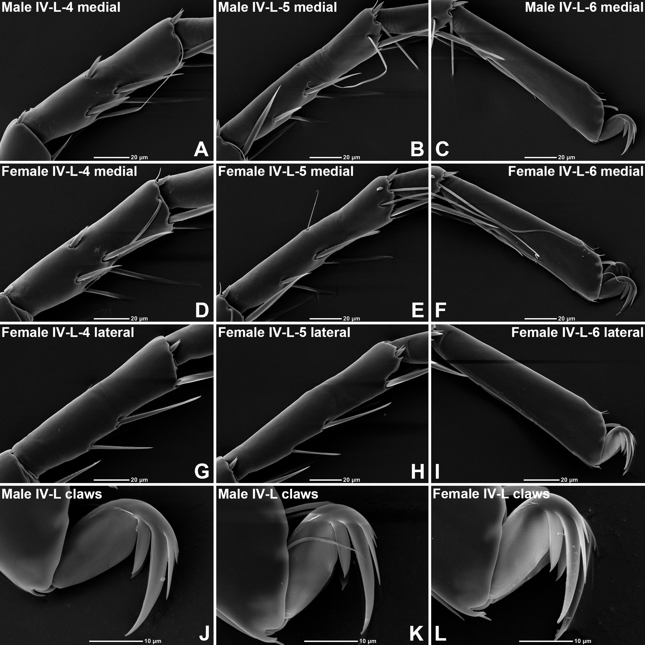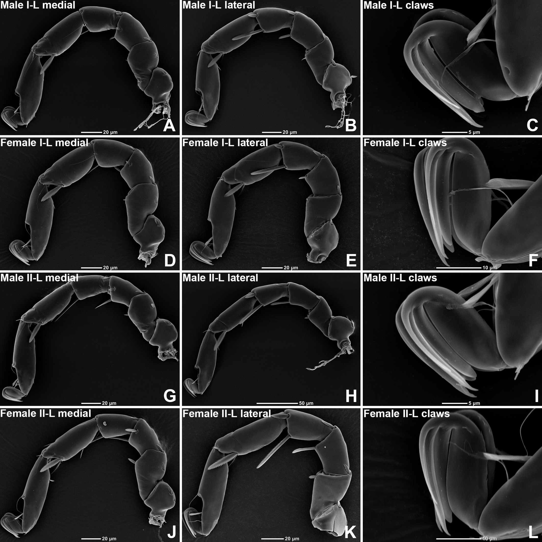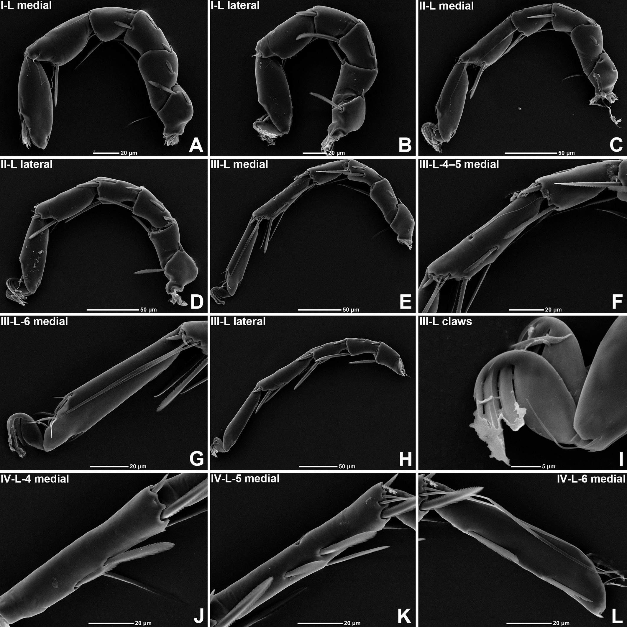 All legs simple, without modifications; claws well-developed, four-branched (Fig. 22I). ''Swimming setae'' (but it's not sure if these are strictly speaking swimming setae, as they are noticeably thinner than the swimming setae of III–IV-L) occurring terminally of I–II-L-4–5 (Fig. 22A–D); III–IV-L-4–5 with one and two terminal swimming setae respectively (Fig. 22E–L).