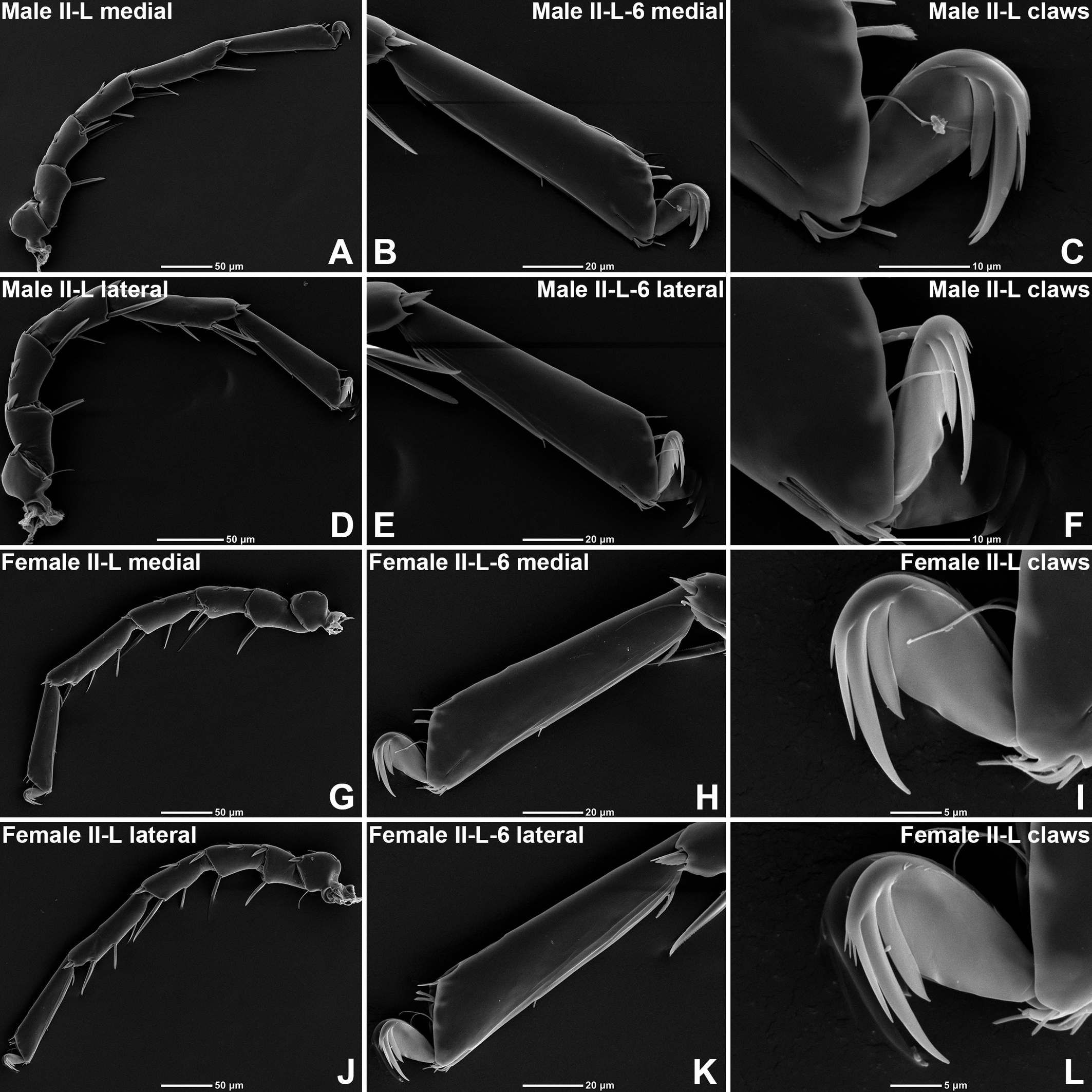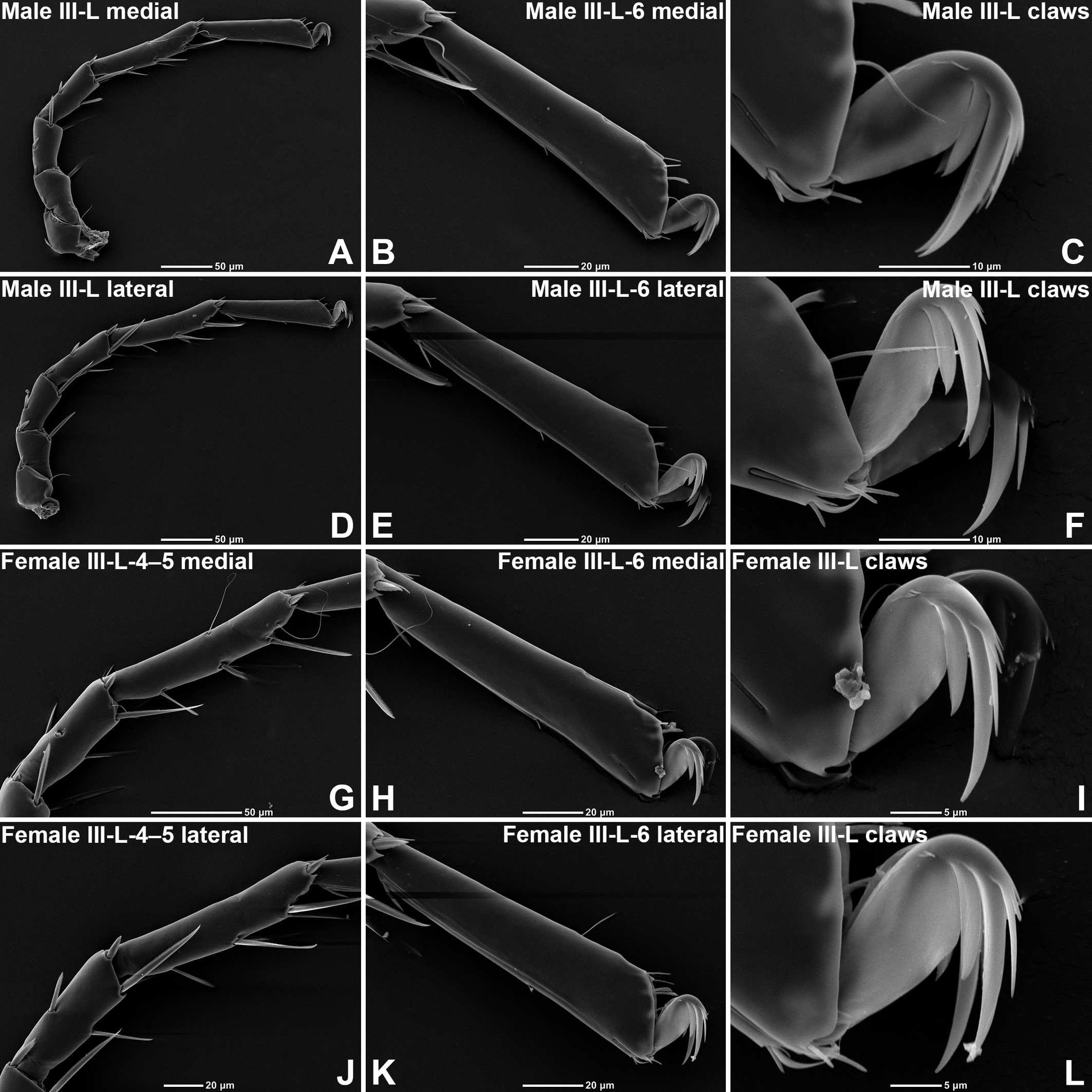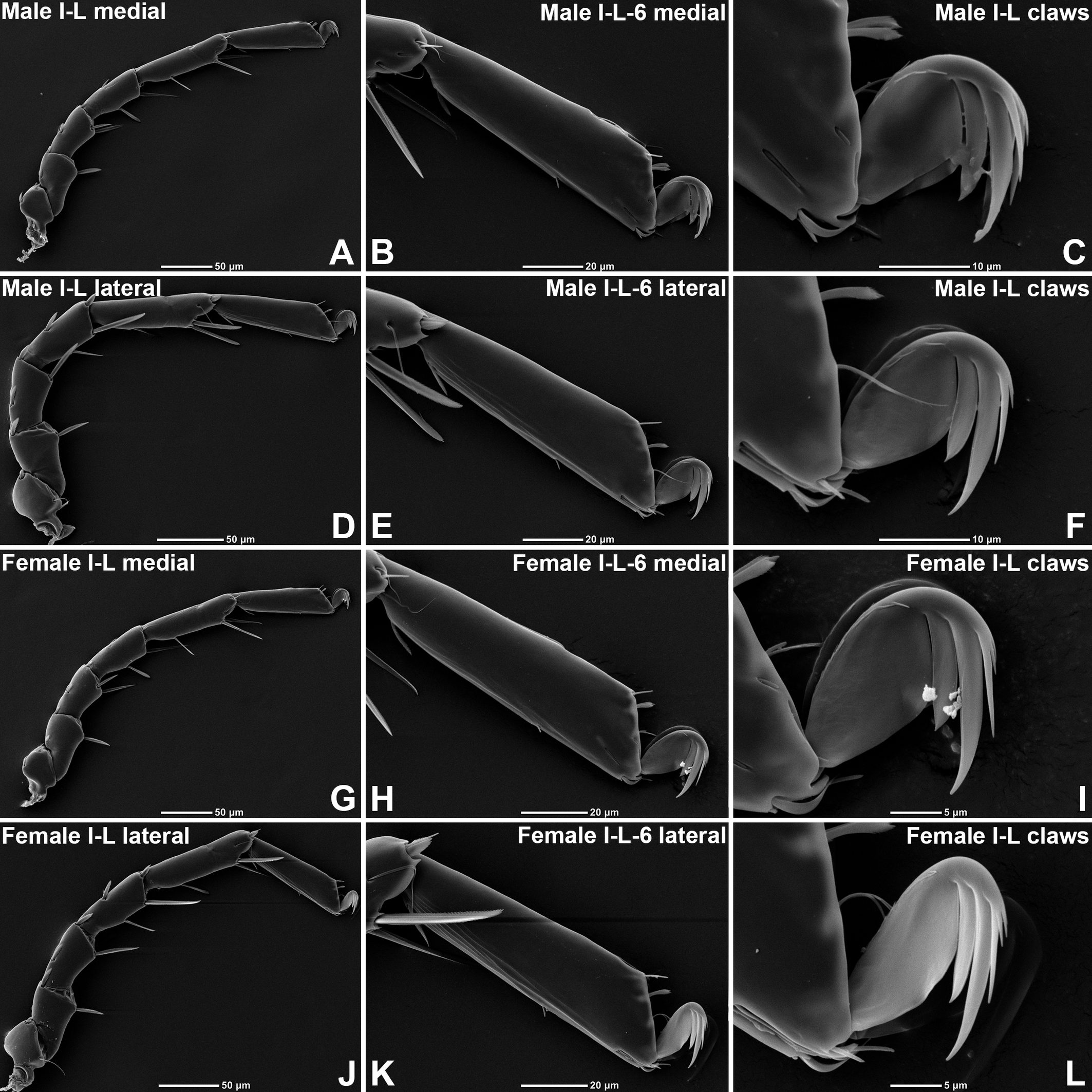 All legs simple, without modifications; claws well-developed, four-branched (Fig. 22I). ''Swimming setae'' (but it's not sure if these are strictly speaking swimming setae, as they are noticeably thinner than the swimming setae of III–IV-L) occurring terminally of I–II-L-4–5 (Fig. 22A–D); III–IV-L-4–5 with one and two terminal swimming setae respectively (Fig. 22E–L).