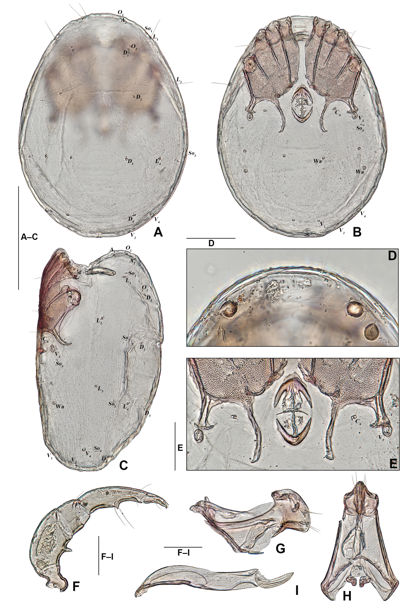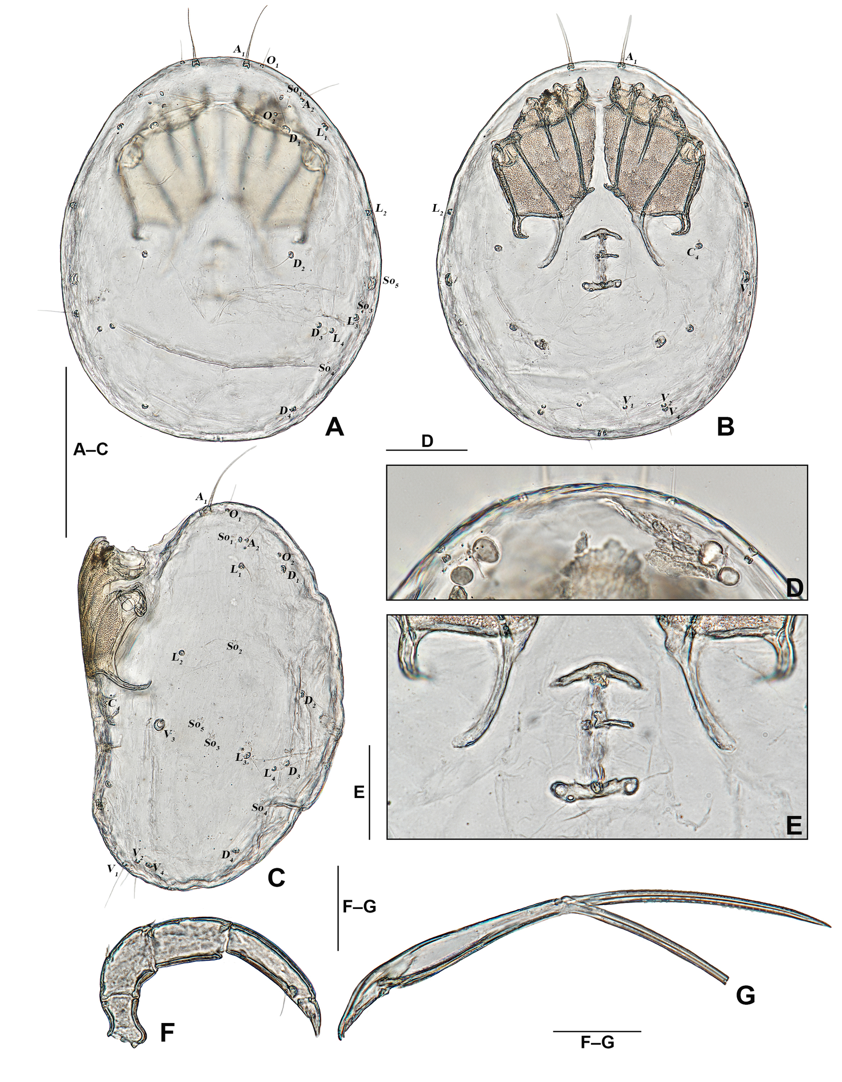 Female (n=1) — In dorsal view: El1 slightly larger than El2 (Fig. 20D), lying beneath the integument; L4 close to D3 ; idiosoma without sclerites (Fig. 20A). In ventral view: Cx-I separated medially; suture lines of Cx-II/III incomplete; suture lines of Cx-III/IV posteriorly ending in long apodemes; medial apodeme of Cx-IV longer than lateral apodeme, C4 located postlaterally the lateral apodeme; V3 larger than other glandularia, almost at the same level as postgenital sclerite; genital field partially located between medial posterior apodemes of Cx-IV, postgenital sclerite with one pair of small wheel-like acetabula (Figs 20E); two pairs of small wheel-like acetabula (sensu Cook 1996) or specialized glandularia (sensu Tuzovskij 1978) located posteriorly to the genital field (Fig. 20B).