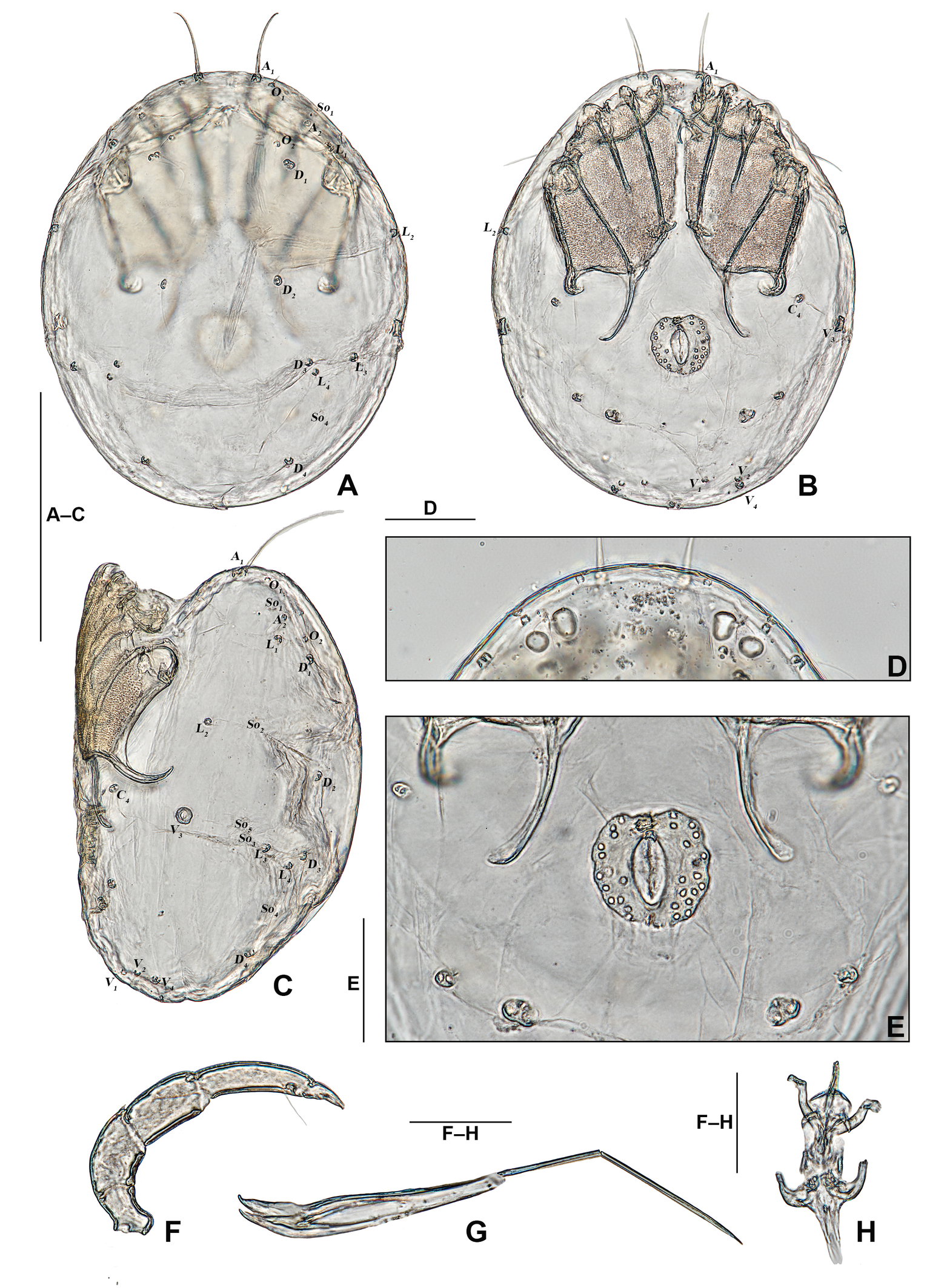 Male (n=4) — In dorsal view: A1 not visible; two pairs of El rounded (Fig. 3D), lying beneath the integument; idiosoma without sclerites (Fig. 3A). In ventral view: Cx-I separated medially; suture lines of Cx-II/III, and Cx-III/IV incomplete; medial apodeme of Cx-IV longer than lateral apodeme, C4 in the middle between the apodemes; rounded V3 much larger than other glandularia, without accompanying seta (Fig. 4C); genital field with a sclerotized ring bearing 4–5 pairs of setae and with a long anterior extension (Fig. 4A); numerous perigenital setae surrounded the genital field (Fig. 3E); a pair of lateral platelets with three pores posterior to the gonopore; a pairs of wheel-like acetabula posteriorly of the genital field (Fig. 3B, E).