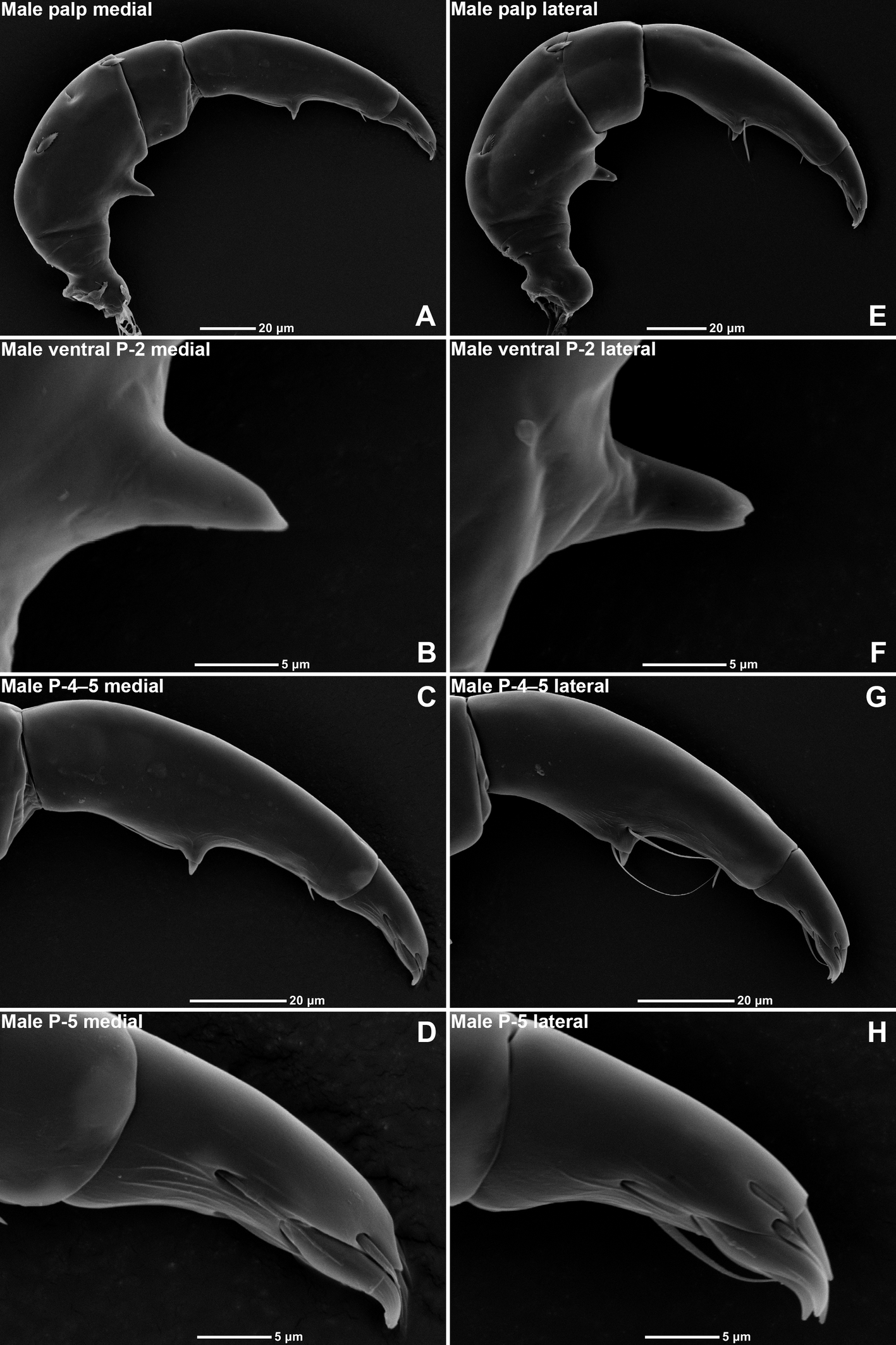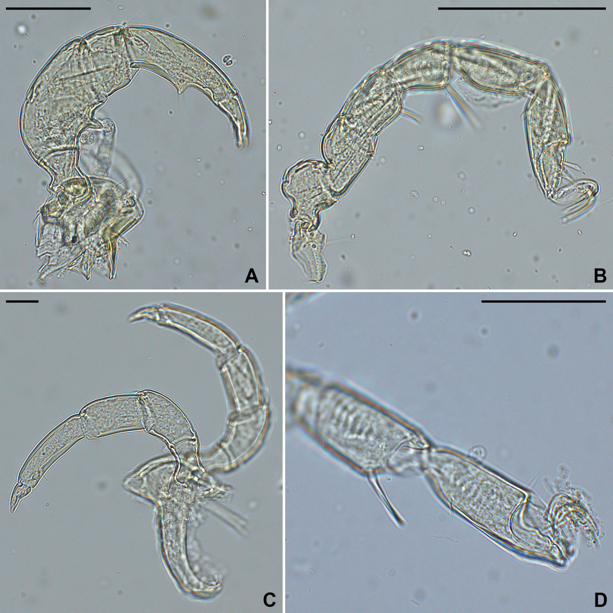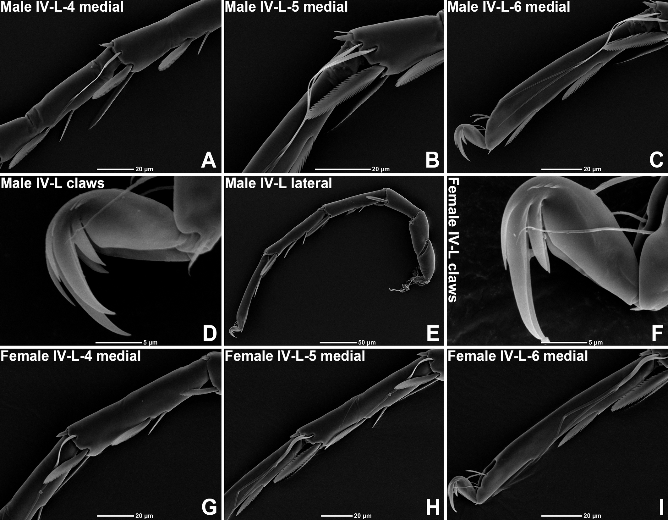 All legs simple, without modifications; claws well-developed and trifid, some nicks on the dorsal surface (Figs 5I; 7C, I; 8D). I–II-L with terminal ''swimming setae'' of the fourth and fifth segments (Fig. 7A–B, G–H); III–IV-L-4–5 with one and two terminal swimming setae, respectively (Figs 5G–H, 8).