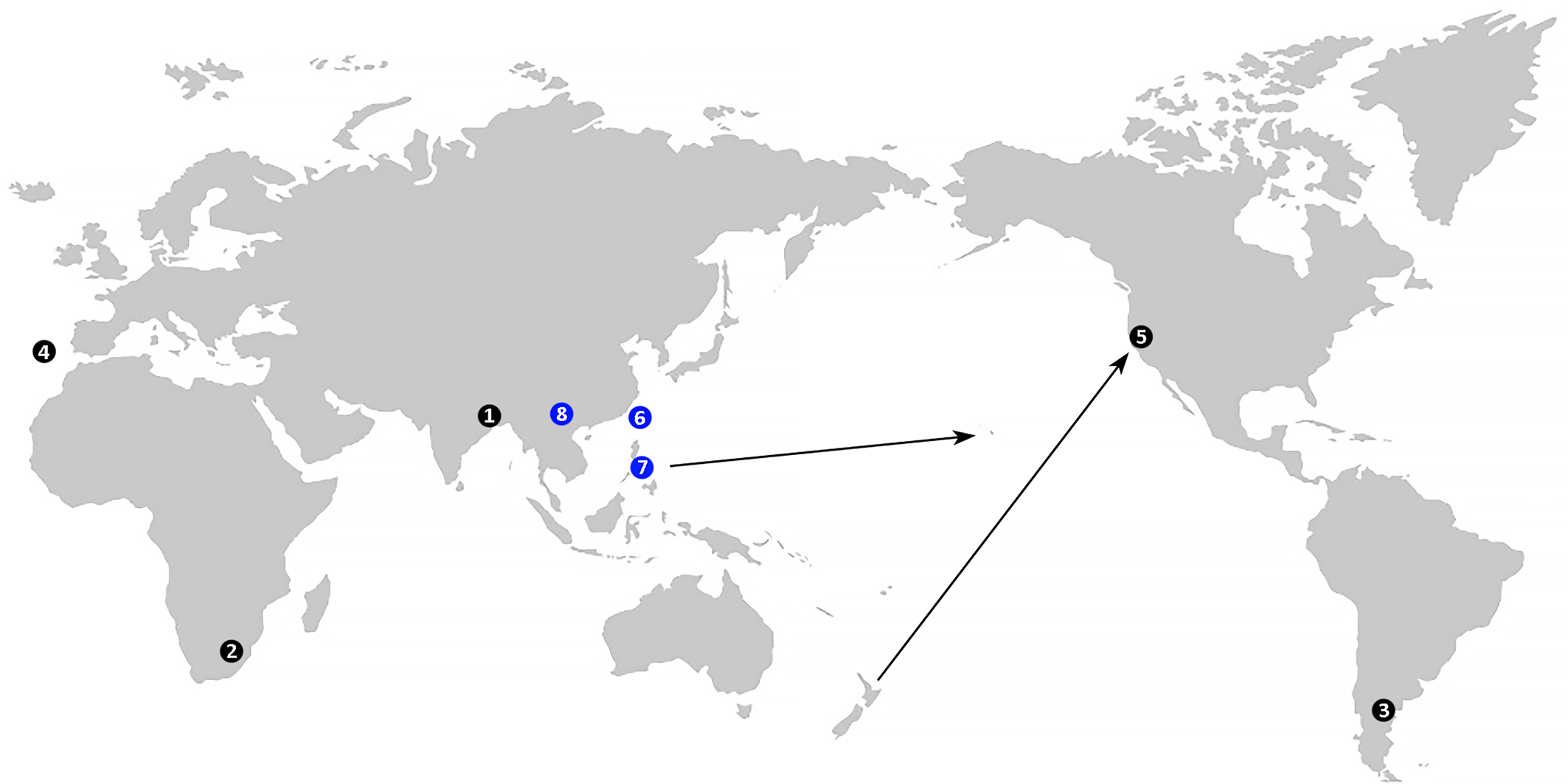 Distribution — (Figure 1). Current data on the global distribution of Cymoptus spp. remain limited. Records include findings on native hosts in type localities in Argentina, India, Portugal, and South Africa, as well as one record from the USA, where C. waltheri was detected on Nothofagus menziesii introduced from New Zealand (Keifer 1939). Additionally, C. waltheri has been reported in New Zealand on native Nothofagus spp. (Manson 1984).