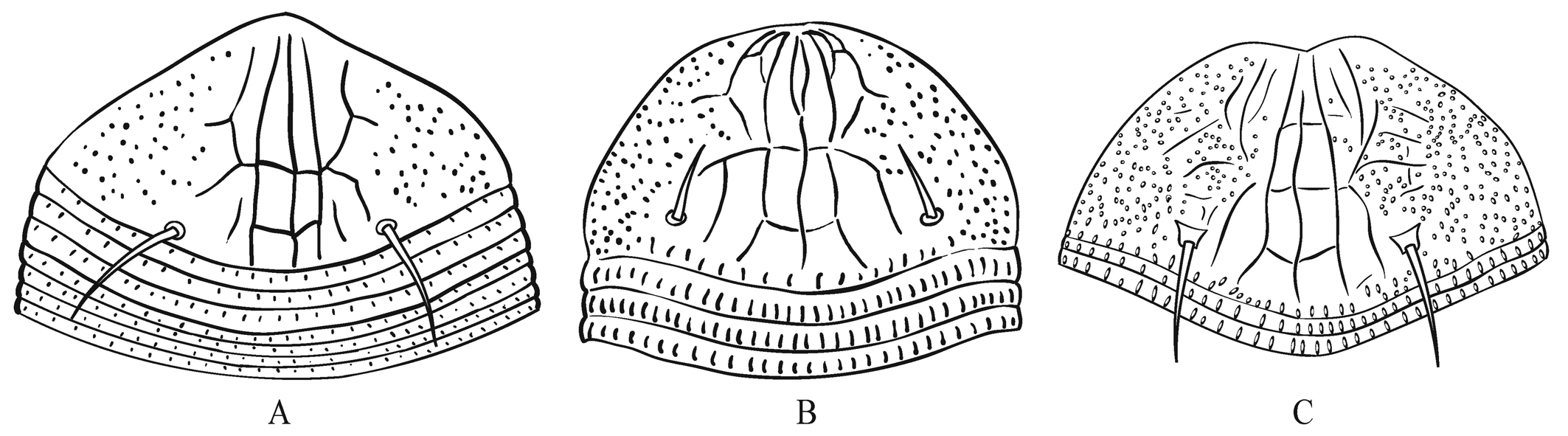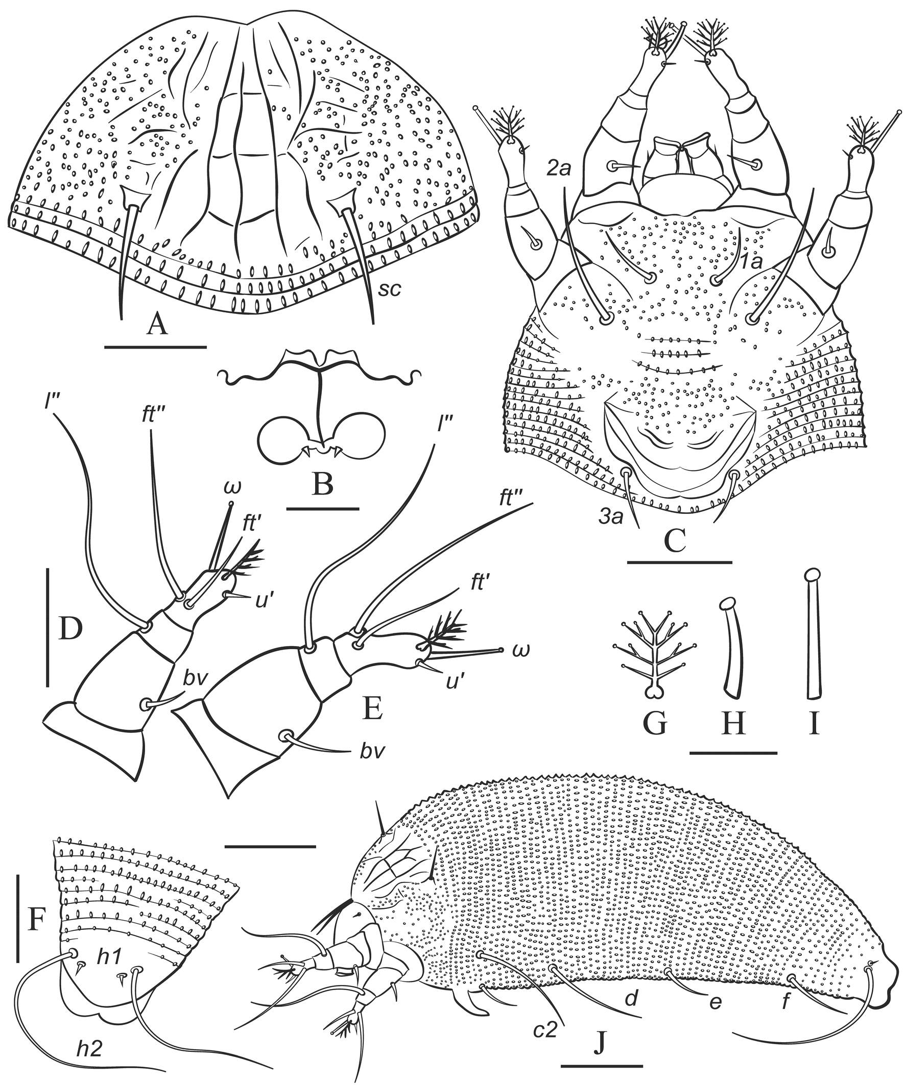 Remarks on the generic diagnosis of Nothopoda — This genus is poorly distinguished from another nothopodine genus, Floracarus Keifer, 1953. They differ only in the presence (in Floracarus) and absence in (Nothopoda) of a relatively small subtriangular frontal lobe of the prodorsal shield (Keifer 1953, p. 69; Amrine et al. 2003). Presence or absence of this structure is a weak discriminating character, also varying among members of different eriophyid genera (e.g. in Aceria and Eriophyes). Recent phylogenies based on limited set of nothopodine taxa, did not support monophyly of Nothopoda and inferred Floracarus a basal taxon in a clade comprising three nothopodine genera – Nothopoda, Cosella, and Floracarus (Chetverikov et al. 2023). In this study, we follow the traditional concept of Nothopoda as a Floracarus-like taxon lacking a frontal lobe. However, future morphological revisions and molecular phylogenetic studies may confirm synonymy of Nothopoda and Floracarus.