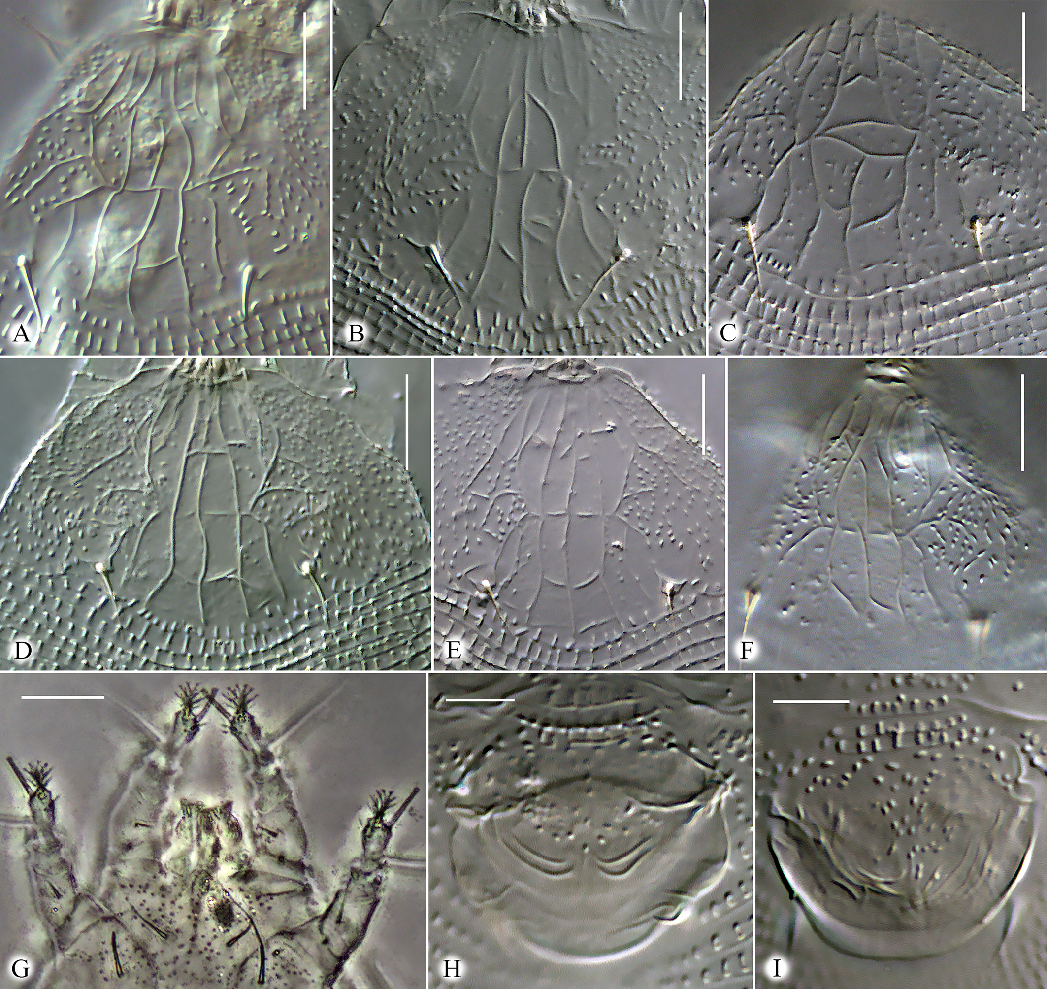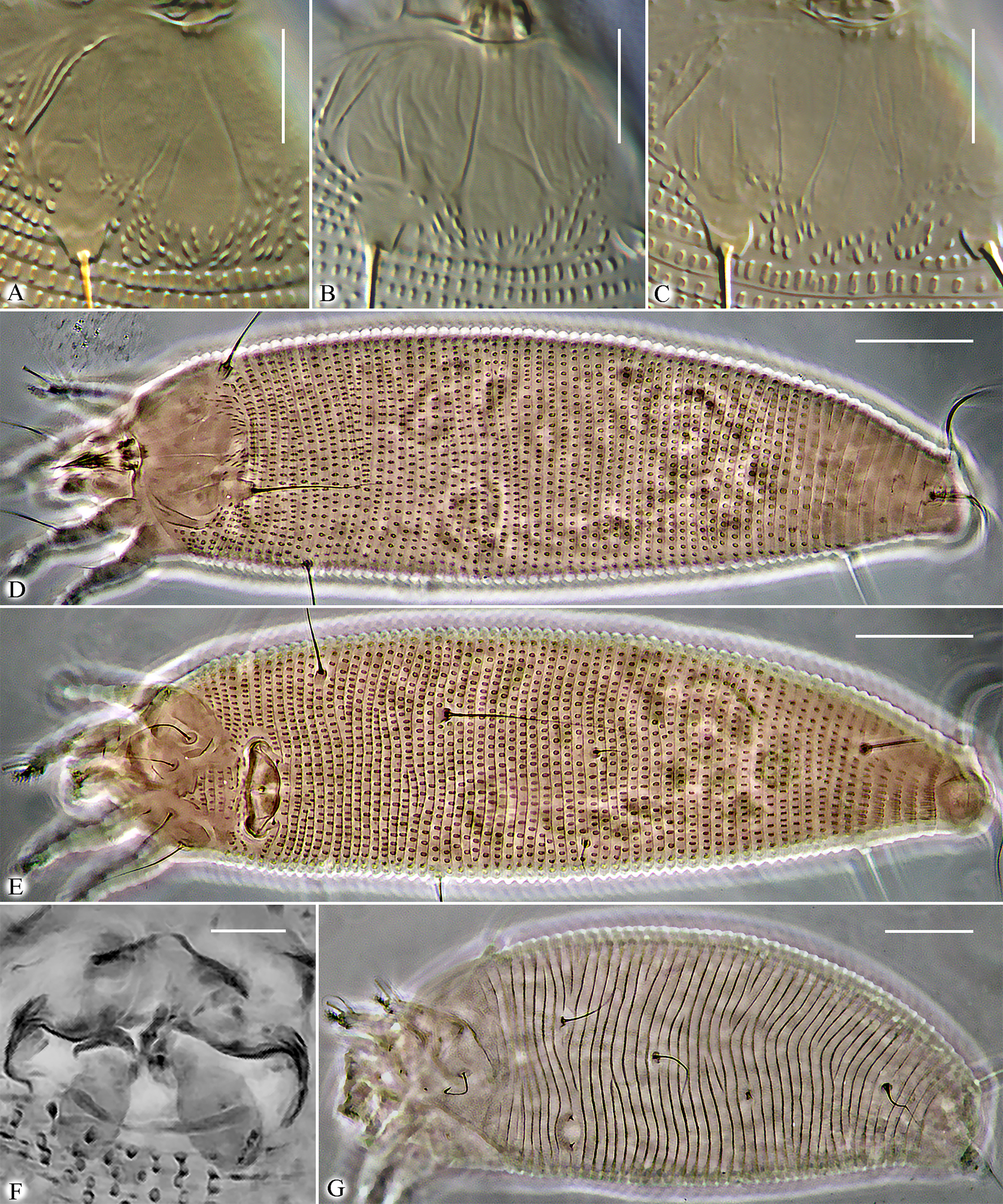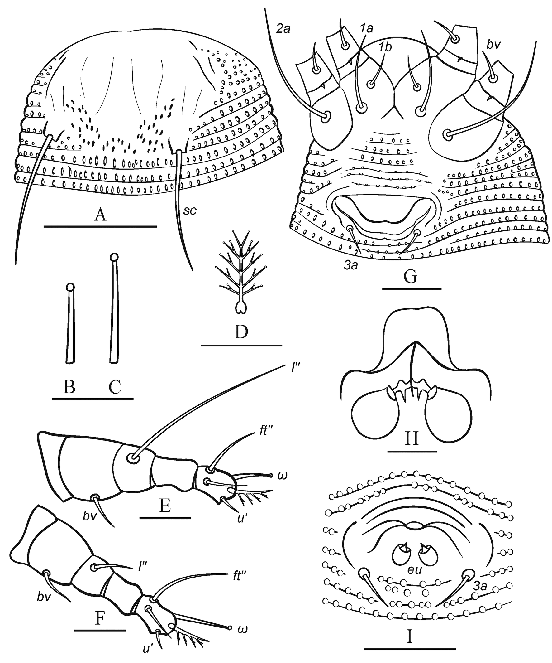 Idiosoma elongate, vermiform, white to slightly yellowish, 195 (170─241), 55 (50─62) wide at the level of seta c2. Prodorsal shield subtriangular, rounded and slightly notched anteriorly, 28 (24─30), 36 (30─40) wide, without frontal lobe. Prodorsal shield with variable linear ornamentation in medial part. Lateral parts of prodorsal shield with numerous microtubercles. Most commonly, the linear pattern is subsymmetrical and includes median line, two admedians, submedian I and a series of longitudinal and transversal lines. Median line entire, slightly sinuous, incomplete (absent in anterior 1/5 part of prodorsal shield). Admedians entire, complete, converging anteriorly. Usually three short transverse lines crossing median line are present between admedians. Submedian line I broken, consisting of two approximately equal fragments. Three to six short transverse lines present near anterior fragment of submedian I. Some females possess aberrant ornamentation of prodorsal shield with median line broken and additional transverse lines present and forming cells along anterior margin of prodorsal shield and between long lines (Figure 7). Scapular setae sc 9 (7─12), 21 (17─24) apart, directed dorsally and slightly posteriad. Gnathosoma directed anteriad and obliquely downward, 19 (18─23), ep 2 (1─3), d 2 (2─3), simple, ν 2 (1.5─2); chelicerae 13 (11─14).