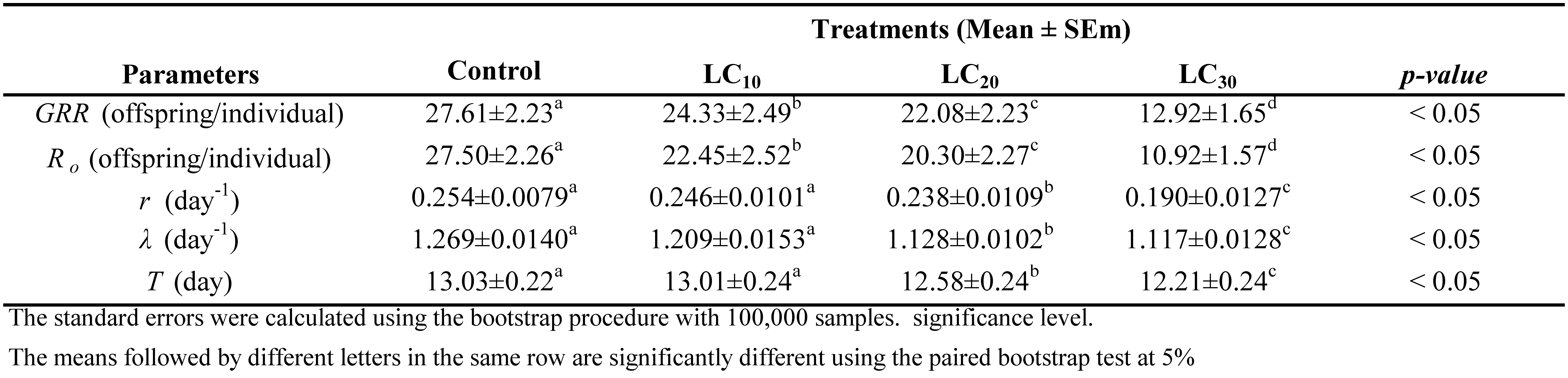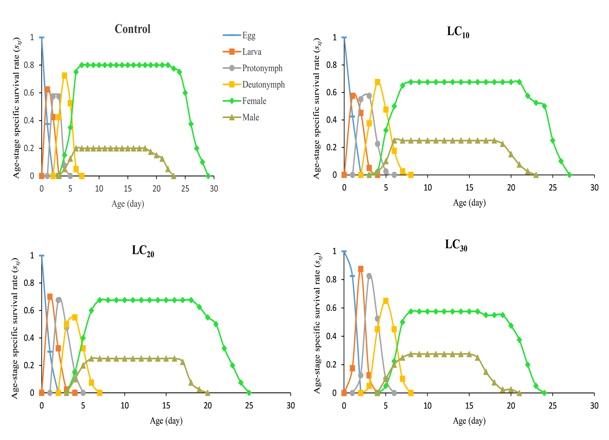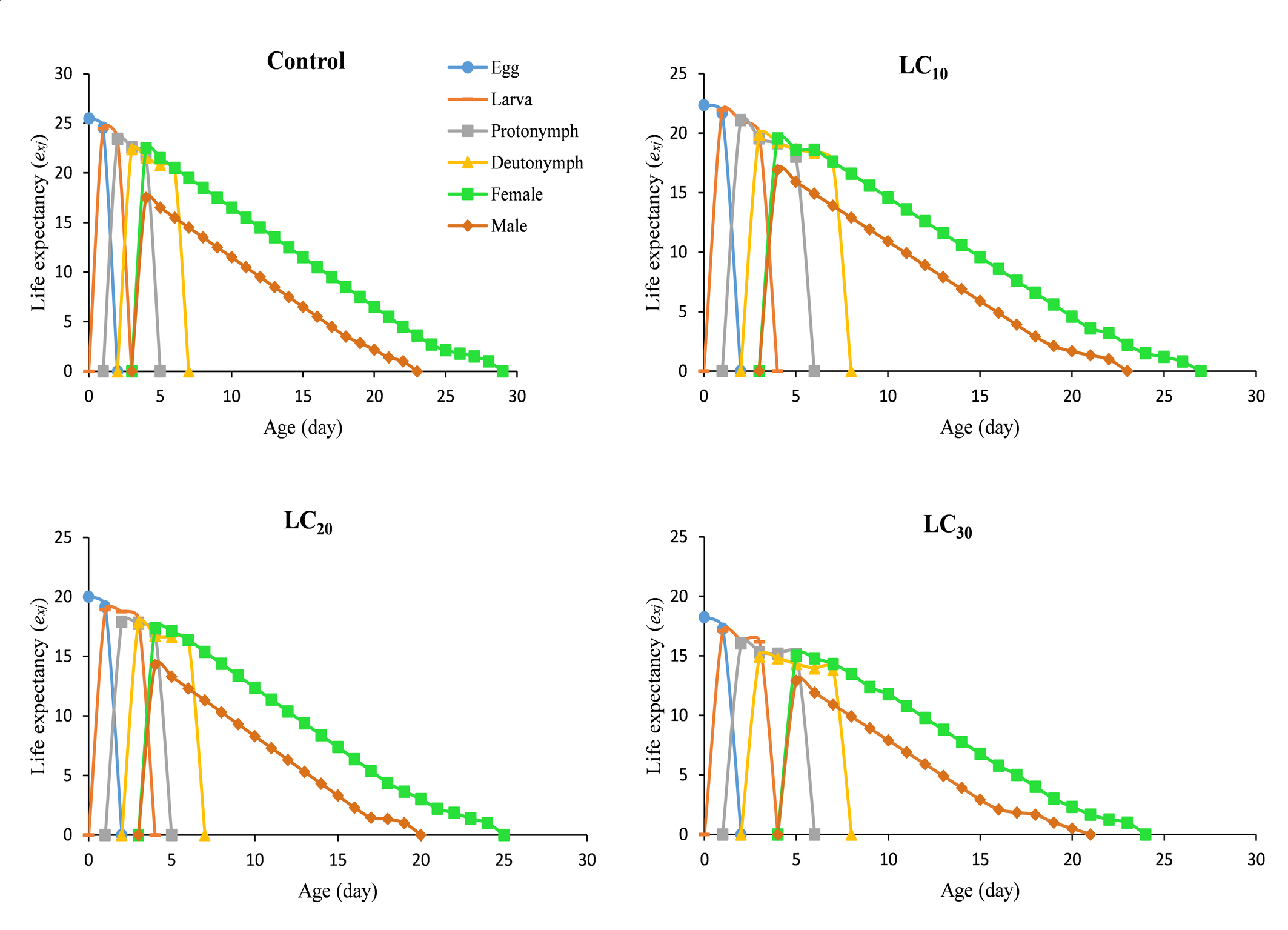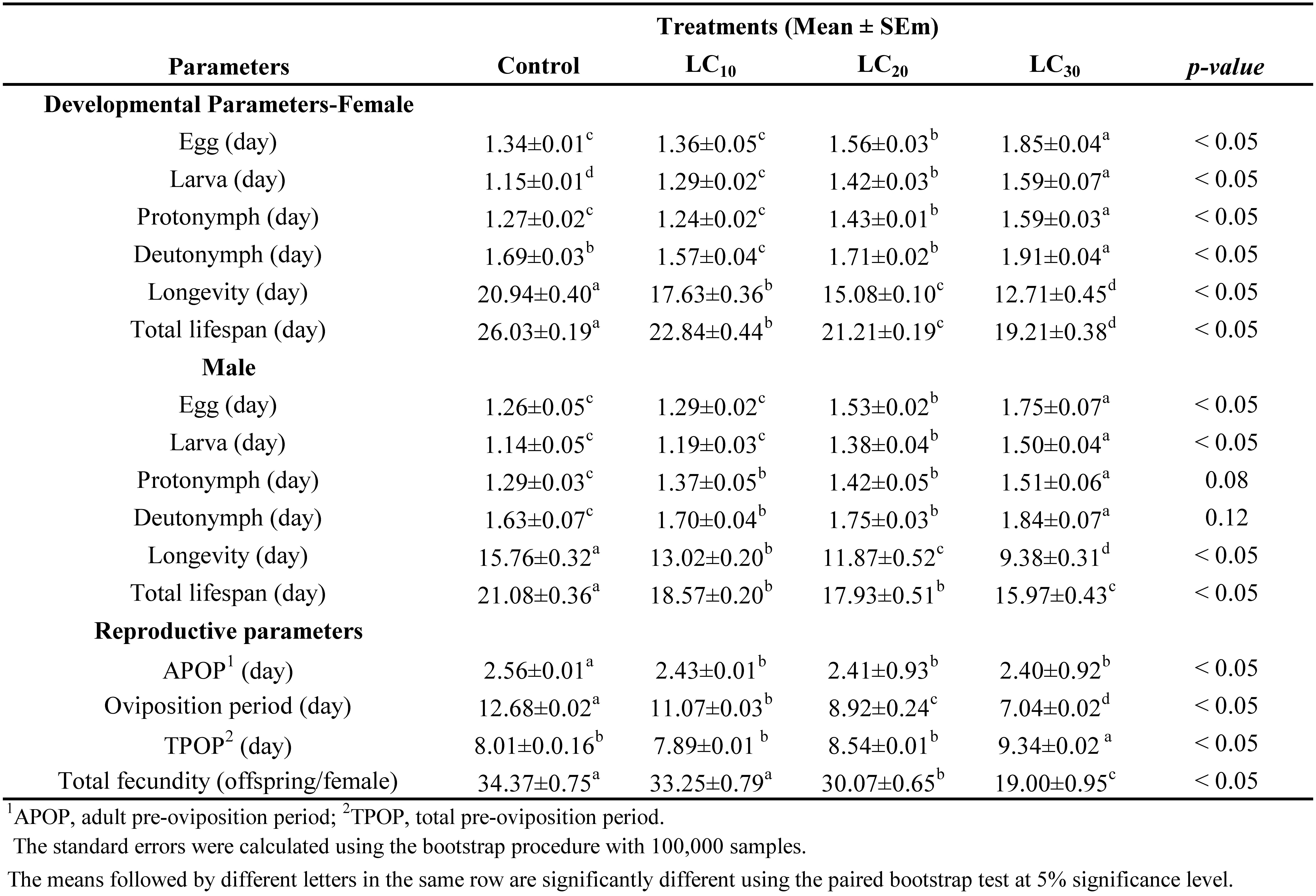Based on probit analysis, the regression equation for the concentration–mortality relationship was determined to be Y = -0.611 + 0.974X with an LC50 value of 4.221 ppm for T. urticae. The concentrations chosen for the life table bioassay were 0.206 ppm for LC10, 0.581 ppm for LC20 treatment and 1.227 ppm for LC30 treatment, but no mortality was observed in control (Table 2). Low lethal concentrations (0.206, 0.581, and 1.227 ppm) were applied to the predatory mite, N. longispinosus to evaluate their effects on its life history traits and population parameters.