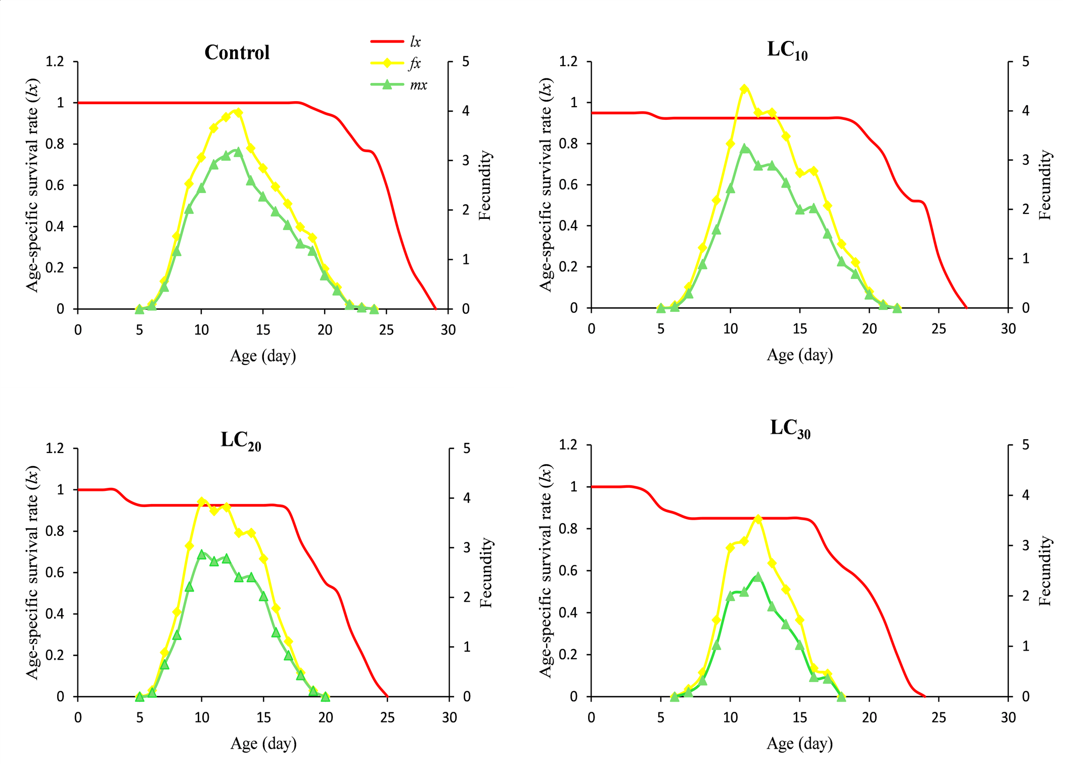 The gross reproductive rate (GRR) significantly decreased with increasing concentrations of chlorfenapyr (p < 0.05), as shown in Table 4. The highest GRR was recorded in the control (27.61 ± 2.23 offspring per female), which declined significantly to 24.33 ± 0.2.49 in the LC10 treatment, 22.08 ± 2.23 in the LC20 treatment, and the lowest value of 12.92 ± 1.65 offspring per female in the LC30 treatment. A similar trend was observed for the net reproductive rate (R₀). The intrinsic rate of increase (r) and the finite rate of increase (λ), indicators of population growth potential, were also significantly impacted as the concentration increased (p < 0.05). The mean generation time was greatest in the untreated group (13.03 ± 0.22 days) and the LC10 treatment group (13.01 ± 0.24 days), and there was no significant difference between the two treatments. However, a significantly shorter generation time was recorded in the LC20 (12.68 ± 0.24 days) and LC30 (12.21 ± 0.24 days; p < 0.05) groups, suggesting accelerated generational turnover under higher concentrations of chlorfenapyr.